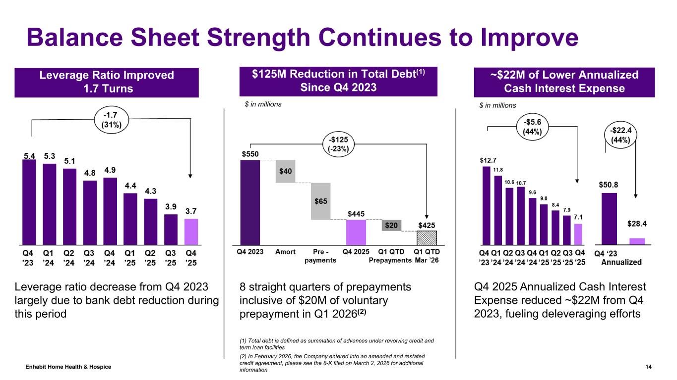 Enhabit Home Health & Hospice 13 Hospice Q4 Profitability KPI Performance Gross margin of 52.0%, decreasing 350bps sequentially and in line year over year Q4 hospice sequential revenue drivers: • Unit Revenue: +0.3% sequentially with combination of CMS rate increase partially offset by favorable non-recurring collections rate benefit in prior period • Unit Cost: +8.0% sequentially primarily on Q4 average merit increase of 3% and lower productivity due to ramp of new hire clinical staff for future volume growth Hospice Adjusted EBITDA of $13.6 million decreased $3.6 million or 20.9% sequentially, and increased 2.3% year over year Sequential Adjusted EBITDA variance walk: • Volume increased Adjusted EBITDA $0.2 million on growth in ADC of 0.5% • Rate/Yield decreased Adjusted EBITDA ($2.0) million with higher per patient day costs compressing margins slightly offset by higher unit revenues • Sales and Ops back-office G&A costs decreased EBITDA ($1.8) million on increased sales related investment costs to support future volume growth Cost per patient day increased sequentially to $80.9 while improving to prior year by 0.6% Q4 2025 average merit increase of 3% effective October 1 Merit increase and lower productivity on ramping new hire clinical staff were primary drivers in sequential increase in cost per patient day Merit increase more than offset by productivity improvements are drivers to year over year improvement Reconciliations to GAAP provided in Appendix B