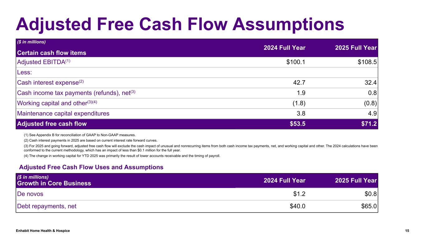 Enhabit Home Health & Hospice 14 Balance Sheet Strength Continues to Improve Leverage ratio decrease from Q4 2023 largely due to bank debt reduction during this period Leverage Ratio Improved 1.7 Turns $125M Reduction in Total Debt(1) Since Q4 2023 8 straight quarters of prepayments inclusive of $20M of voluntary prepayment in Q1 2026(2) (1) Total debt is defined as summation of advances under revolving credit and term loan facilities (2) In February 2026, the Company entered into an amended and restated credit agreement, please see the 8-K filed on March 2, 2026 for additional information ~$22M of Lower Annualized Cash Interest Expense Q4 2025 Annualized Cash Interest Expense reduced ~$22M from Q4 2023, fueling deleveraging efforts $ in millions $ in millions
