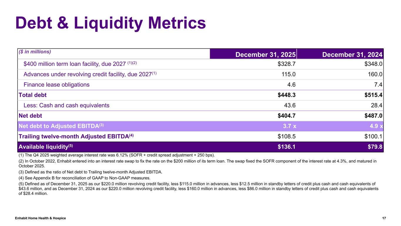 Enhabit Home Health & Hospice 17 Debt & Liquidity Metrics ($ in millions) December 31, 2025 December 31, 2024 $400 million term loan facility, due 2027 (1)(2) $328.7 $348.0 Advances under revolving credit facility, due 2027(1) 115.0 160.0 Finance lease obligations 4.6 7.4 Total debt $448.3 $515.4 Less: Cash and cash equivalents 43.6 28.4 Net debt $404.7 $487.0 Net debt to Adjusted EBITDA(3) 3.7 x 4.9 x Trailing twelve-month Adjusted EBITDA(4) $108.5 $100.1 Available liquidity(5) $136.1 $79.8 (1) The Q4 2025 weighted average interest rate was 6.12% (SOFR + credit spread adjustment + 250 bps). (2) In October 2022, Enhabit entered into an interest rate swap to fix the rate on the $200 million of its term loan. The swap fixed the SOFR component of the interest rate at 4.3%, and matured in October 2025. (3) Defined as the ratio of Net debt to Trailing twelve-month Adjusted EBITDA. (4) See Appendix B for reconciliation of GAAP to Non-GAAP measures. (5) Defined as of December 31, 2025 as our $220.0 million revolving credit facility, less $115.0 million in advances, less $12.5 million in standby letters of credit plus cash and cash equivalents of $43.6 million, and as December 31, 2024 as our $220.0 million revolving credit facility, less $160.0 million in advances, less $86.0 million in standby letters of credit plus cash and cash equivalents of $28.4 million.