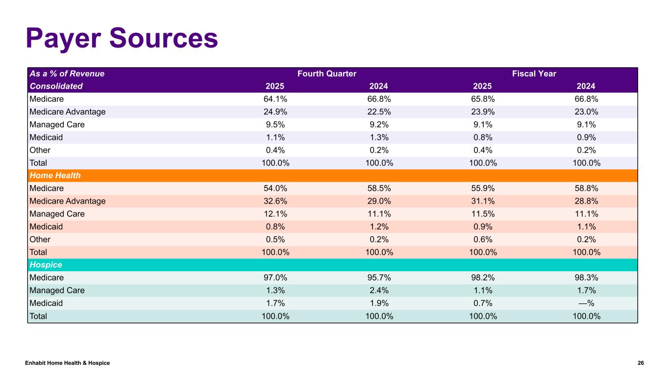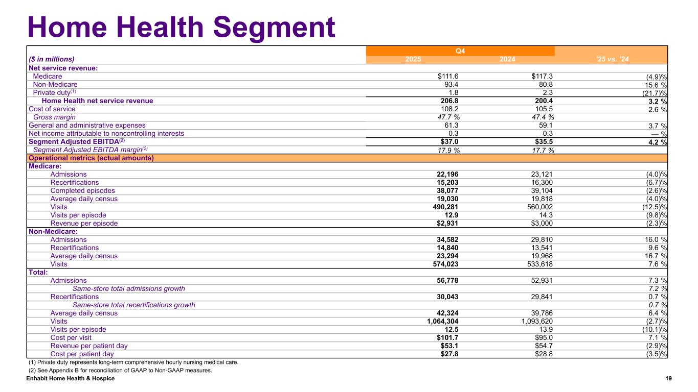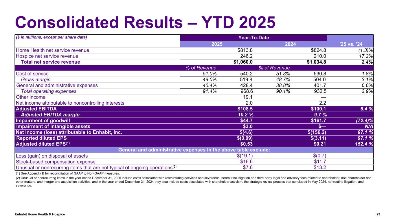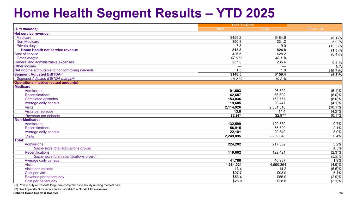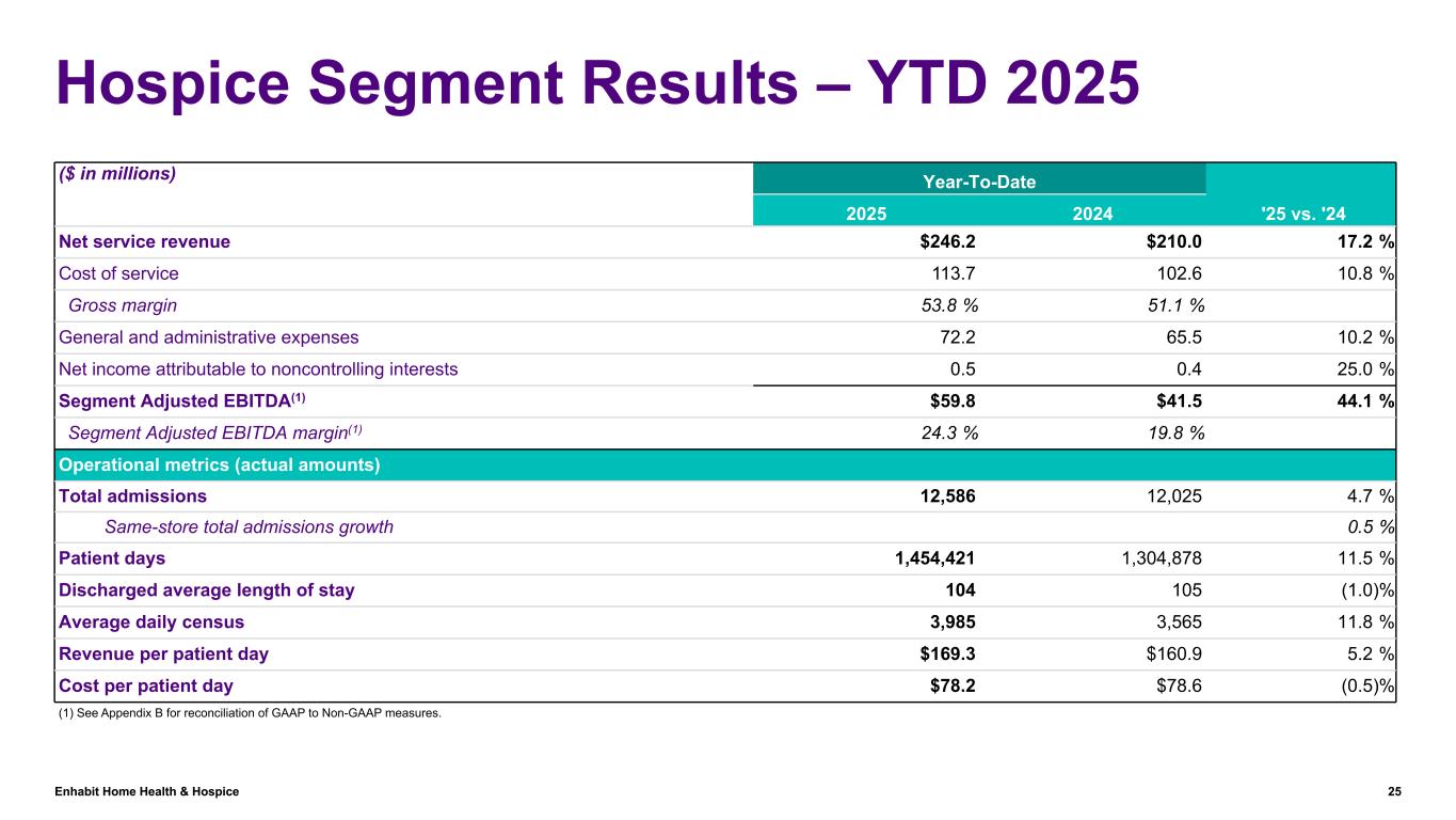 Enhabit Home Health & Hospice 24 Home Health Segment Results – YTD 2025 ($ in millions) Year-To-Date '25 vs. '242025 2024 Net service revenue: Medicare $455.2 $484.6 (6.1) % Non-Medicare 350.8 331.2 5.9 % Private duty(1) 7.8 9.0 (13.3) % Home Health net service revenue 813.8 824.8 (1.3) % Cost of service 426.5 428.2 (0.4) % Gross margin 47.6 % 48.1 % General and administrative expenses 237.3 235.4 0.8 % Other income — — N/A Net income attributable to noncontrolling interests 1.5 1.8 (16.7) % Segment Adjusted EBITDA(2) $148.5 $159.4 (6.8) % Segment Adjusted EBITDA margin(2) 18.2 % 19.3 % Operational metrics (actual amounts) Medicare: Admissions 91,603 96,502 (5.1) % Recertifications 62,687 66,692 (6.0) % Completed episodes 153,036 162,761 (6.0) % Average daily census 19,605 20,447 (4.1) % Visits 2,114,926 2,351,316 (10.1) % Visits per episode 13.8 14.4 (4.2) % Revenue per episode $2,974 $2,977 (0.1) % Non-Medicare: Admissions 132,599 120,850 9.7 % Recertifications 56,915 55,729 2.1 % Average daily census 22,181 20,540 8.0 % Visits 2,249,095 2,239,048 0.4 % Total: Admissions 224,202 217,352 3.2 % Same-store total admissions growth 4.5 % Recertifications 119,602 122,421 (2.3) % Same-store total recertifications growth (5.9) % Average daily census 41,786 40,987 1.9 % Visits 4,364,021 4,590,364 (4.9) % Visits per episode 13.4 14.2 (5.6) % Cost per visit $97.7 $93.0 5.1 % Revenue per patient day $53.4 $55.0 (2.9) % Cost per patient day $28.0 $28.6 (2.1) % (1) Private duty represents long-term comprehensive hourly nursing medical care. (2) See Appendix B for reconciliation of GAAP to Non-GAAP measures.
