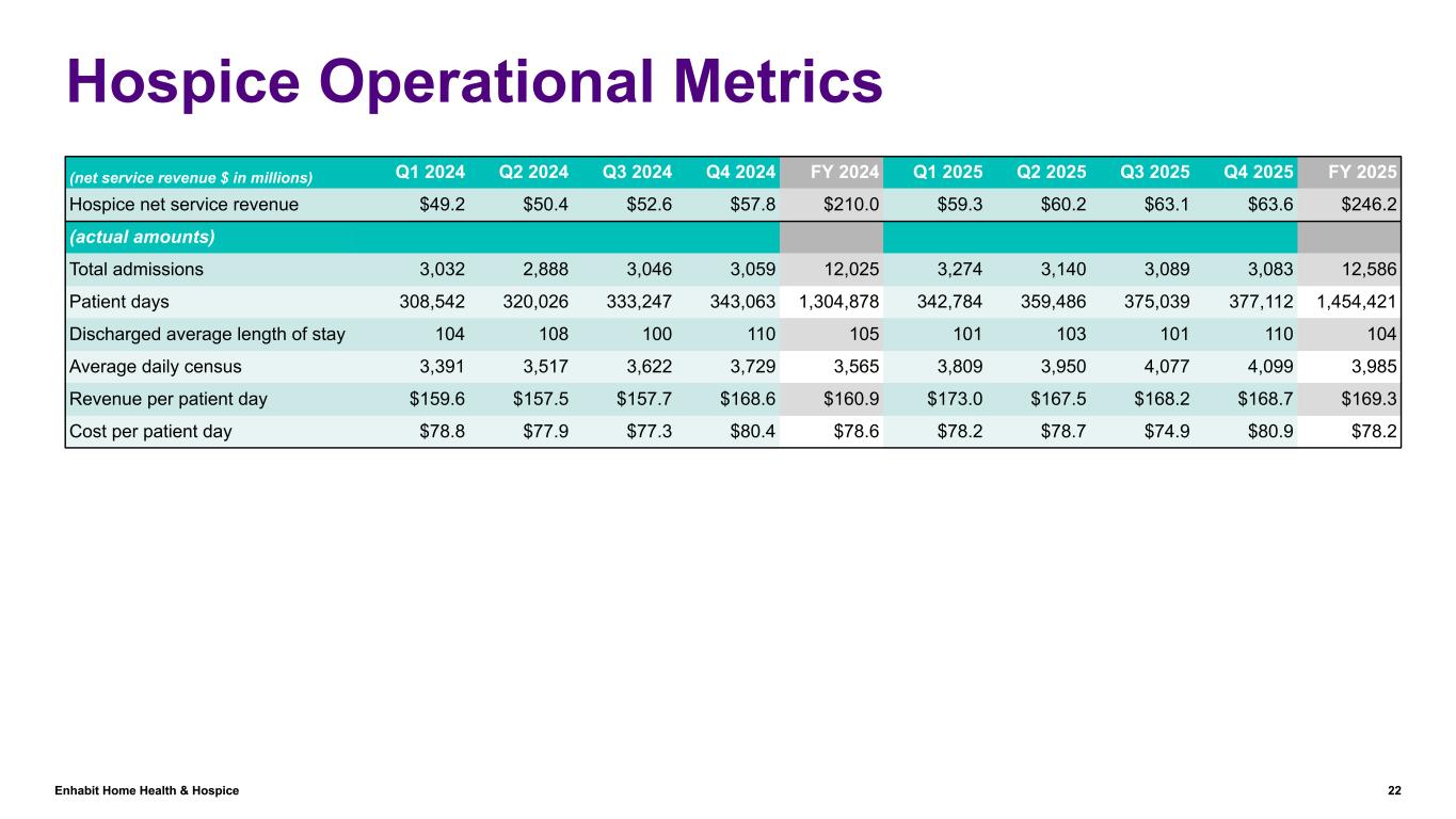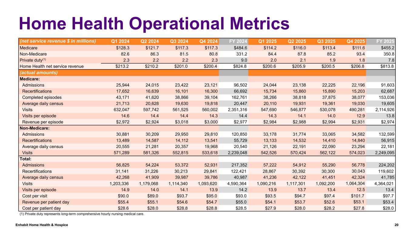 Enhabit Home Health & Hospice 20 Home Health Operational Metrics (net service revenue $ in millions) Q1 2024 Q2 2024 Q3 2024 Q4 2024 FY 2024 Q1 2025 Q2 2025 Q3 2025 Q4 2025 FY 2025 Medicare $128.3 $121.7 $117.3 $117.3 $484.6 $114.2 $116.0 $113.4 $111.6 $455.2 Non-Medicare 82.6 86.3 81.5 80.8 331.2 84.4 87.8 85.2 93.4 350.8 Private duty(1) 2.3 2.2 2.2 2.3 9.0 2.0 2.1 1.9 1.8 7.8 Home Health net service revenue $213.2 $210.2 $201.0 $200.4 $824.8 $200.6 $205.9 $200.5 $206.8 $813.8 (actual amounts) Medicare: Admissions 25,944 24,015 23,422 23,121 96,502 24,044 23,138 22,225 22,196 91,603 Recertifications 17,652 16,639 16,101 16,300 66,692 15,734 15,860 15,890 15,203 62,687 Completed episodes 43,171 41,620 38,866 39,104 162,761 38,266 38,818 37,875 38,077 153,036 Average daily census 21,713 20,628 19,630 19,818 20,447 20,110 19,931 19,361 19,030 19,605 Visits 632,047 597,742 561,525 560,002 2,351,316 547,690 546,877 530,078 490,281 2,114,926 Visits per episode 14.6 14.4 14.4 14.3 14.4 14.3 14.1 14.0 12.9 13.8 Revenue per episode $2,972 $2,924 $3,018 $3,000 $2,977 $2,984 $2,988 $2,994 $2,931 $2,974 Non-Medicare: Admissions 30,881 30,209 29,950 29,810 120,850 33,178 31,774 33,065 34,582 132,599 Recertifications 13,489 14,587 14,112 13,541 55,729 13,133 14,532 14,410 14,840 56,915 Average daily census 20,555 21,281 20,357 19,968 20,540 21,126 22,191 22,090 23,294 22,181 Visits 571,289 581,326 552,815 533,618 2,239,048 542,526 570,424 562,122 574,023 2,249,095 Total: Admissions 56,825 54,224 53,372 52,931 217,352 57,222 54,912 55,290 56,778 224,202 Recertifications 31,141 31,226 30,213 29,841 122,421 28,867 30,392 30,300 30,043 119,602 Average daily census 42,268 41,909 39,987 39,786 40,987 41,236 42,122 41,451 42,324 41,785 Visits 1,203,336 1,179,068 1,114,340 1,093,620 4,590,364 1,090,216 1,117,301 1,092,200 1,064,304 4,364,021 Visits per episode 14.9 14.0 14.1 13.9 14.2 13.9 13.7 13.4 12.5 13.4 Cost per visit $90.0 $89.0 $93.7 $95.0 $93.0 $93.5 $94.7 $97.4 $101.7 $97.7 Revenue per patient day $55.4 $55.1 $54.6 $54.7 $55.0 $54.1 $53.7 $52.6 $53.1 $53.4 Cost per patient day $28.6 $28.0 $28.8 $28.8 $28.5 $27.9 $28.0 $28.2 $27.8 $28.0 (1) Private duty represents long-term comprehensive hourly nursing medical care.