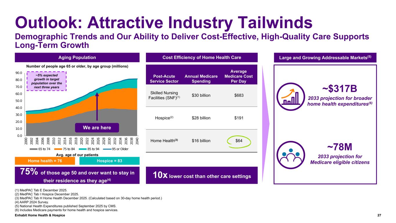 Enhabit Home Health & Hospice 27 (1) MedPAC Tab E December 2025. (2) MedPAC Tab I Hospice December 2025. (3) MedPAC Tab H Home Health December 2025. (Calculated based on 30-day home health period.) (4) AARP 2024 Survey. (5) National Health Expenditures published September 2025 by CMS. (6) Includes Medicare payments for home health and hospice services. Aging Population Cost Efficiency of Home Health Care Large and Growing Addressable Markets(5) Large and Growing Addressable Markets4 ~$317B 2033 projection for broader home health expenditures(6) ~78M 2033 projection for Medicare eligible citizens 75% of those age 50 and over want to stay in their residence as they age(4) 10x lower cost than other care settings Post-Acute Service Sector Annual Medicare Spending Average Medicare Cost Per Day Skilled Nursing Facilities (SNF)(1) $30 billion $683 Hospice(2) $28 billion $191 Home Health(3) $16 billion $64 Home health = 76 Hospice = 83 Number of people age 65 or older, by age group (millions) ~5% expected growth in target population over the next three years We are here Avg. age of our patients Outlook: Attractive Industry Tailwinds Demographic Trends and Our Ability to Deliver Cost-Effective, High-Quality Care Supports Long-Term Growth