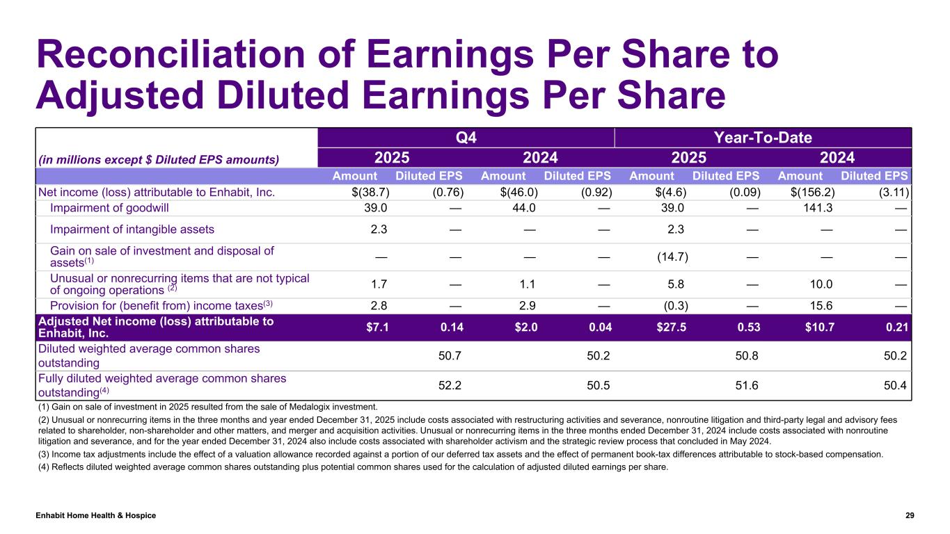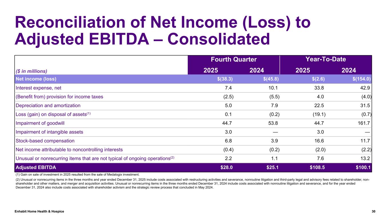 Enhabit Home Health & Hospice 29 Reconciliation of Earnings Per Share to Adjusted Diluted Earnings Per Share (in millions except $ Diluted EPS amounts) Q4 Year-To-Date 2025 2024 2025 2024 Amount Diluted EPS Amount Diluted EPS Amount Diluted EPS Amount Diluted EPS Net income (loss) attributable to Enhabit, Inc. $(38.7) (0.76) $(46.0) (0.92) $(4.6) (0.09) $(156.2) (3.11) Impairment of goodwill 39.0 — 44.0 — 39.0 — 141.3 — Impairment of intangible assets 2.3 — — — 2.3 — — — Gain on sale of investment and disposal of assets(1) — — — — (14.7) — — — Unusual or nonrecurring items that are not typical of ongoing operations (2) 1.7 — 1.1 — 5.8 — 10.0 — Provision for (benefit from) income taxes(3) 2.8 — 2.9 — (0.3) — 15.6 — Adjusted Net income (loss) attributable to Enhabit, Inc. $7.1 0.14 $2.0 0.04 $27.5 0.53 $10.7 0.21 Diluted weighted average common shares outstanding 50.7 50.2 50.8 50.2 Fully diluted weighted average common shares outstanding(4) 52.2 50.5 51.6 50.4 (1) Gain on sale of investment in 2025 resulted from the sale of Medalogix investment. (2) Unusual or nonrecurring items in the three months and year ended December 31, 2025 include costs associated with restructuring activities and severance, nonroutine litigation and third-party legal and advisory fees related to shareholder, non-shareholder and other matters, and merger and acquisition activities. Unusual or nonrecurring items in the three months ended December 31, 2024 include costs associated with nonroutine litigation and severance, and for the year ended December 31, 2024 also include costs associated with shareholder activism and the strategic review process that concluded in May 2024. (3) Income tax adjustments include the effect of a valuation allowance recorded against a portion of our deferred tax assets and the effect of permanent book-tax differences attributable to stock-based compensation. (4) Reflects diluted weighted average common shares outstanding plus potential common shares used for the calculation of adjusted diluted earnings per share.