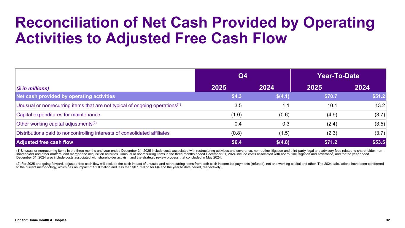 Enhabit Home Health & Hospice 32 Reconciliation of Net Cash Provided by Operating Activities to Adjusted Free Cash Flow ($ in millions) Q4 Year-To-Date 2025 2024 2025 2024 Net cash provided by operating activities $4.3 $(4.1) $70.7 $51.2 Unusual or nonrecurring items that are not typical of ongoing operations(1) 3.5 1.1 10.1 13.2 Capital expenditures for maintenance (1.0) (0.6) (4.9) (3.7) Other working capital adjustments(2) 0.4 0.3 (2.4) (3.5) Distributions paid to noncontrolling interests of consolidated affiliates (0.8) (1.5) (2.3) (3.7) Adjusted free cash flow $6.4 $(4.8) $71.2 $53.5 (1) Unusual or nonrecurring items in the three months and year ended December 31, 2025 include costs associated with restructuring activities and severance, nonroutine litigation and third-party legal and advisory fees related to shareholder, non- shareholder and other matters, and merger and acquisition activities. Unusual or nonrecurring items in the three months ended December 31, 2024 include costs associated with nonroutine litigation and severance, and for the year ended December 31, 2024 also include costs associated with shareholder activism and the strategic review process that concluded in May 2024. (2) For 2025 and going forward, adjusted free cash flow will exclude the cash impact of unusual and nonrecurring items from both cash income tax payments (refunds), net and working capital and other. The 2024 calculations have been conformed to the current methodology, which has an impact of $1.0 million and less than $0.1 million for Q4 and the year to date period, respectively.