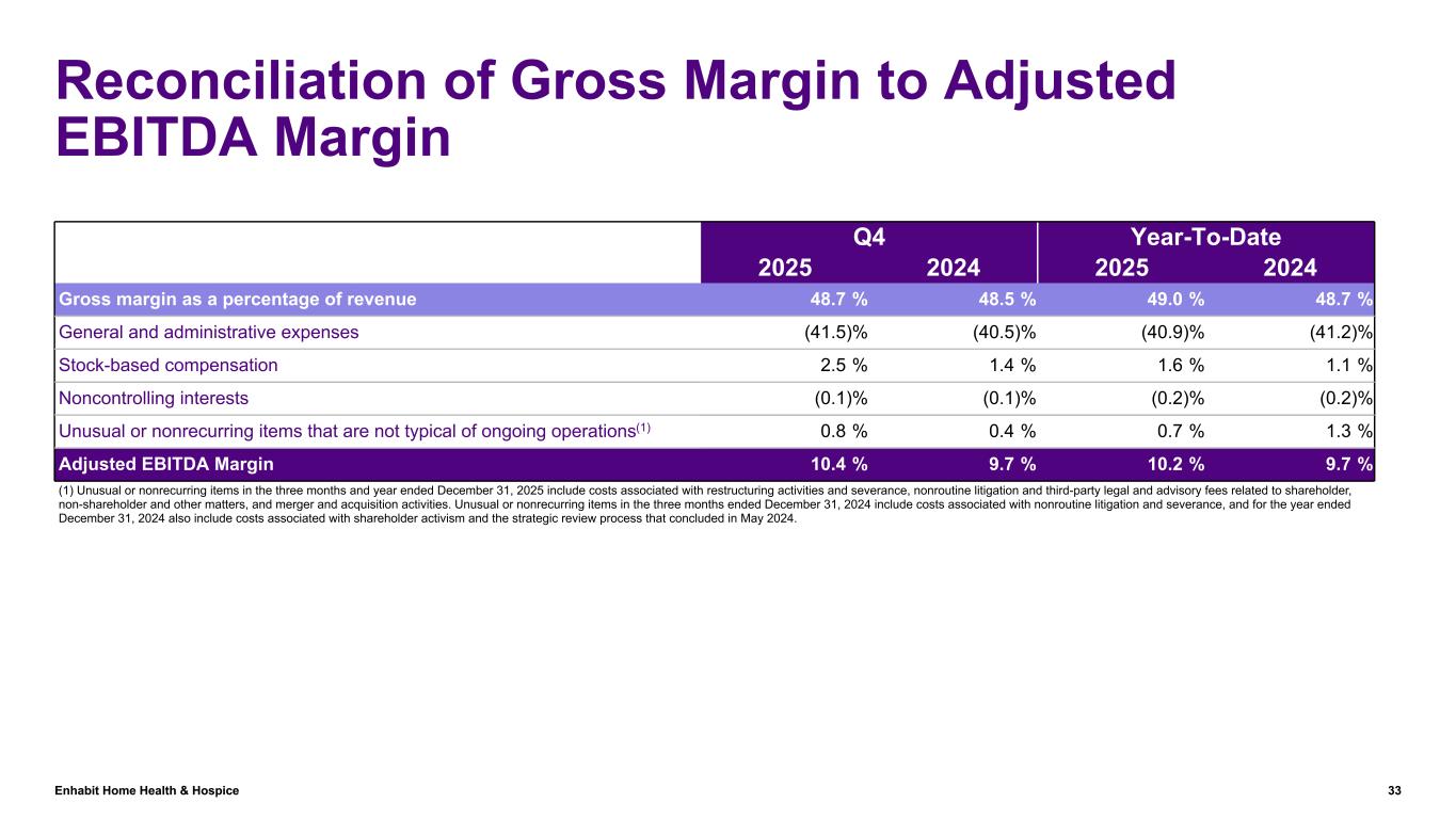 Enhabit Home Health & Hospice 33 Reconciliation of Gross Margin to Adjusted EBITDA Margin Q4 Year-To-Date 2025 2024 2025 2024 Gross margin as a percentage of revenue 48.7 % 48.5 % 49.0 % 48.7 % General and administrative expenses (41.5) % (40.5) % (40.9) % (41.2) % Stock-based compensation 2.5 % 1.4 % 1.6 % 1.1 % Noncontrolling interests (0.1) % (0.1) % (0.2) % (0.2) % Unusual or nonrecurring items that are not typical of ongoing operations(1) 0.8 % 0.4 % 0.7 % 1.3 % Adjusted EBITDA Margin 10.4 % 9.7 % 10.2 % 9.7 % (1) Unusual or nonrecurring items in the three months and year ended December 31, 2025 include costs associated with restructuring activities and severance, nonroutine litigation and third-party legal and advisory fees related to shareholder, non-shareholder and other matters, and merger and acquisition activities. Unusual or nonrecurring items in the three months ended December 31, 2024 include costs associated with nonroutine litigation and severance, and for the year ended December 31, 2024 also include costs associated with shareholder activism and the strategic review process that concluded in May 2024.