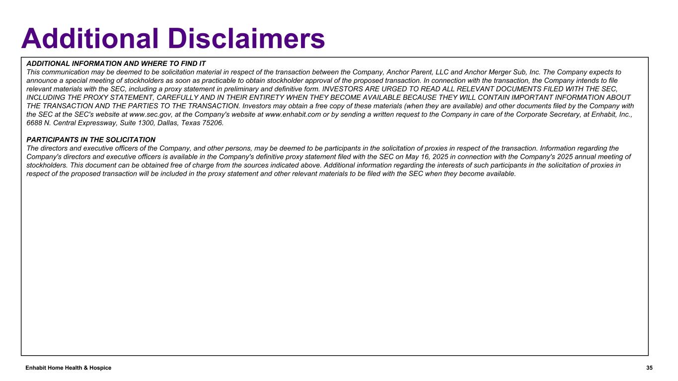 Enhabit Home Health & Hospice 35 Additional Disclaimers ADDITIONAL INFORMATION AND WHERE TO FIND IT This communication may be deemed to be solicitation material in respect of the transaction between the Company, Anchor Parent, LLC and Anchor Merger Sub, Inc. The Company expects to announce a special meeting of stockholders as soon as practicable to obtain stockholder approval of the proposed transaction. In connection with the transaction, the Company intends to file relevant materials with the SEC, including a proxy statement in preliminary and definitive form. INVESTORS ARE URGED TO READ ALL RELEVANT DOCUMENTS FILED WITH THE SEC, INCLUDING THE PROXY STATEMENT, CAREFULLY AND IN THEIR ENTIRETY WHEN THEY BECOME AVAILABLE BECAUSE THEY WILL CONTAIN IMPORTANT INFORMATION ABOUT THE TRANSACTION AND THE PARTIES TO THE TRANSACTION. Investors may obtain a free copy of these materials (when they are available) and other documents filed by the Company with the SEC at the SEC's website at www.sec.gov, at the Company's website at www.enhabit.com or by sending a written request to the Company in care of the Corporate Secretary, at Enhabit, Inc., 6688 N. Central Expressway, Suite 1300, Dallas, Texas 75206. PARTICIPANTS IN THE SOLICITATION The directors and executive officers of the Company, and other persons, may be deemed to be participants in the solicitation of proxies in respect of the transaction. Information regarding the Company's directors and executive officers is available in the Company's definitive proxy statement filed with the SEC on May 16, 2025 in connection with the Company's 2025 annual meeting of stockholders. This document can be obtained free of charge from the sources indicated above. Additional information regarding the interests of such participants in the solicitation of proxies in respect of the proposed transaction will be included in the proxy statement and other relevant materials to be filed with the SEC when they become available.