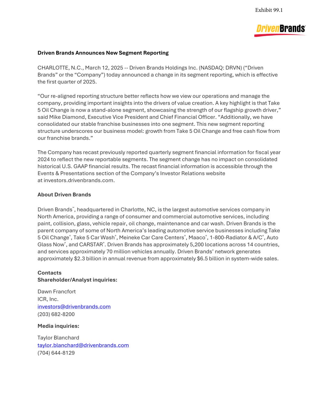 Driven Brands Announces New Segment Reporting CHARLOTTE, N.C., March 12, 2025 -- Driven Brands Holdings Inc. (NASDAQ: DRVN) (“Driven Brands” or the “Company”) today announced a change in its segment reporting, which is effective the first quarter of 2025. “Our re-aligned reporting structure better reflects how we view our operations and manage the company, providing important insights into the drivers of value creation. A key highlight is that Take 5 Oil Change is now a stand-alone segment, showcasing the strength of our flagship growth driver,” said Mike Diamond, Executive Vice President and Chief Financial Officer. “Additionally, we have consolidated our stable franchise businesses into one segment. This new segment reporting structure underscores our business model: growth from Take 5 Oil Change and free cash flow from our franchise brands.” The Company has recast previously reported quarterly segment financial information for fiscal year 2024 to reflect the new reportable segments. The segment change has no impact on consolidated historical U.S. GAAP financial results. The recast financial information is accessible through the Events & Presentations section of the Company’s Investor Relations website at investors.drivenbrands.com. About Driven Brands Driven Brands™, headquartered in Charlotte, NC, is the largest automotive services company in North America, providing a range of consumer and commercial automotive services, including paint, collision, glass, vehicle repair, oil change, maintenance and car wash. Driven Brands is the parent company of some of North America’s leading automotive service businesses including Take 5 Oil Change®, Take 5 Car Wash®, Meineke Car Care Centers®, Maaco®, 1-800-Radiator & A/C®, Auto Glass Now®, and CARSTAR®. Driven Brands has approximately 5,200 locations across 14 countries, and services approximately 70 million vehicles annually. Driven Brands’ network generates approximately $2.3 billion in annual revenue from approximately $6.5 billion in system-wide sales. Contacts Shareholder/Analyst inquiries: Dawn Francfort ICR, Inc. investors@drivenbrands.com (203) 682-8200 Media inquiries: Taylor Blanchard taylor.blanchard@drivenbrands.com (704) 644-8129 Exhibit 99.1