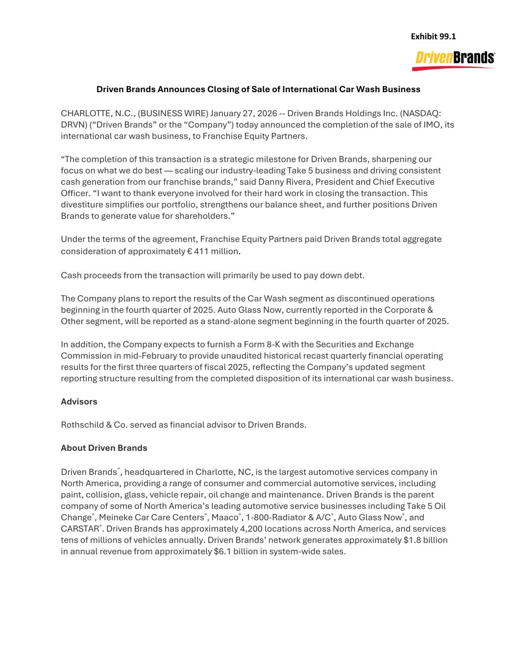 Exhibit 99.1 Driven Brands Announces Closing of Sale of International Car Wash Business CHARLOTTE, N.C., (BUSINESS WIRE) January 27, 2026 -- Driven Brands Holdings Inc. (NASDAQ: DRVN) (“Driven Brands” or the “Company”) today announced the completion of the sale of IMO, its international car wash business, to Franchise Equity Partners. “The completion of this transaction is a strategic milestone for Driven Brands, sharpening our focus on what we do best — scaling our industry-leading Take 5 business and driving consistent cash generation from our franchise brands,” said Danny Rivera, President and Chief Executive Officer. “I want to thank everyone involved for their hard work in closing the transaction. This divestiture simplifies our portfolio, strengthens our balance sheet, and further positions Driven Brands to generate value for shareholders.” Under the terms of the agreement, Franchise Equity Partners paid Driven Brands total aggregate consideration of approximately € 411 million. Cash proceeds from the transaction will primarily be used to pay down debt. The Company plans to report the results of the Car Wash segment as discontinued operations beginning in the fourth quarter of 2025. Auto Glass Now, currently reported in the Corporate & Other segment, will be reported as a stand-alone segment beginning in the fourth quarter of 2025. In addition, the Company expects to furnish a Form 8-K with the Securities and Exchange Commission in mid-February to provide unaudited historical recast quarterly financial operating results for the first three quarters of fiscal 2025, reflecting the Company’s updated segment reporting structure resulting from the completed disposition of its international car wash business. Advisors Rothschild & Co. served as financial advisor to Driven Brands. About Driven Brands Driven Brands™, headquartered in Charlotte, NC, is the largest automotive services company in North America, providing a range of consumer and commercial automotive services, including paint, collision, glass, vehicle repair, oil change and maintenance. Driven Brands is the parent company of some of North America’s leading automotive service businesses including Take 5 Oil Change®, Meineke Car Care Centers®, Maaco®, 1-800-Radiator & A/C®, Auto Glass Now®, and CARSTAR®. Driven Brands has approximately 4,200 locations across North America, and services tens of millions of vehicles annually. Driven Brands’ network generates approximately $1.8 billion in annual revenue from approximately $6.1 billion in system-wide sales.