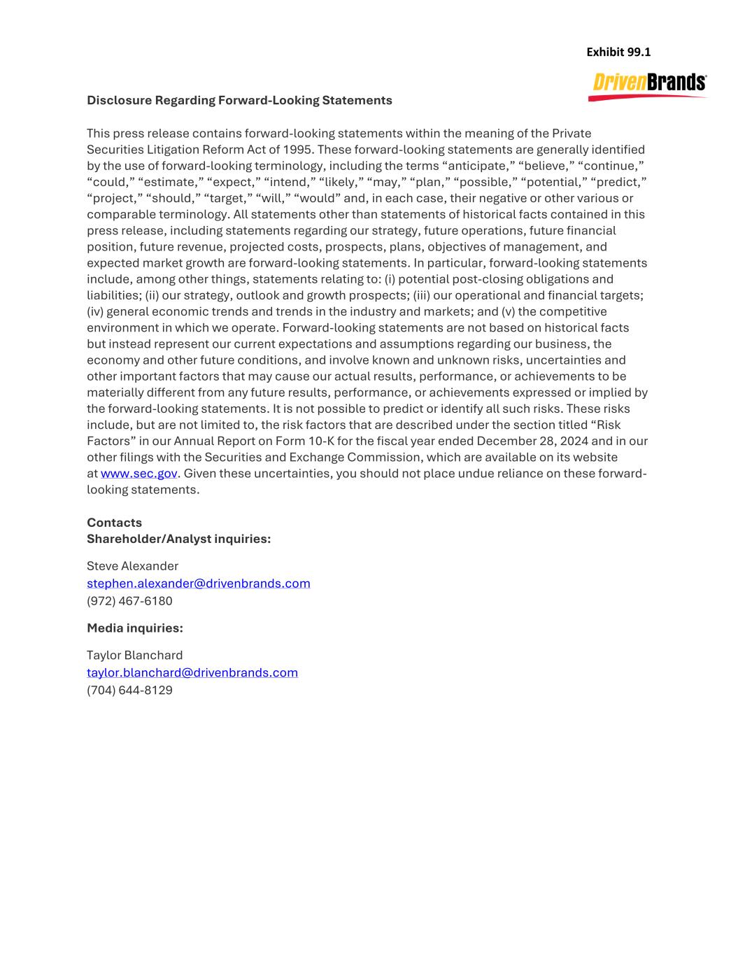 Exhibit 99.1 Disclosure Regarding Forward-Looking Statements This press release contains forward-looking statements within the meaning of the Private Securities Litigation Reform Act of 1995. These forward-looking statements are generally identified by the use of forward-looking terminology, including the terms “anticipate,” “believe,” “continue,” “could,” “estimate,” “expect,” “intend,” “likely,” “may,” “plan,” “possible,” “potential,” “predict,” “project,” “should,” “target,” “will,” “would” and, in each case, their negative or other various or comparable terminology. All statements other than statements of historical facts contained in this press release, including statements regarding our strategy, future operations, future financial position, future revenue, projected costs, prospects, plans, objectives of management, and expected market growth are forward-looking statements. In particular, forward-looking statements include, among other things, statements relating to: (i) potential post-closing obligations and liabilities; (ii) our strategy, outlook and growth prospects; (iii) our operational and financial targets; (iv) general economic trends and trends in the industry and markets; and (v) the competitive environment in which we operate. Forward-looking statements are not based on historical facts but instead represent our current expectations and assumptions regarding our business, the economy and other future conditions, and involve known and unknown risks, uncertainties and other important factors that may cause our actual results, performance, or achievements to be materially different from any future results, performance, or achievements expressed or implied by the forward-looking statements. It is not possible to predict or identify all such risks. These risks include, but are not limited to, the risk factors that are described under the section titled “Risk Factors” in our Annual Report on Form 10-K for the fiscal year ended December 28, 2024 and in our other filings with the Securities and Exchange Commission, which are available on its website at www.sec.gov. Given these uncertainties, you should not place undue reliance on these forward- looking statements. Contacts Shareholder/Analyst inquiries: Steve Alexander stephen.alexander@drivenbrands.com (972) 467-6180 Media inquiries: Taylor Blanchard taylor.blanchard@drivenbrands.com (704) 644-8129