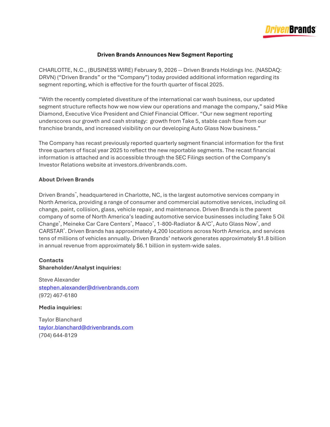 Driven Brands Announces New Segment Reporting CHARLOTTE, N.C., (BUSINESS WIRE) February 9, 2026 -- Driven Brands Holdings Inc. (NASDAQ: DRVN) (“Driven Brands” or the “Company”) today provided additional information regarding its segment reporting, which is effective for the fourth quarter of fiscal 2025. “With the recently completed divestiture of the international car wash business, our updated segment structure reflects how we now view our operations and manage the company,” said Mike Diamond, Executive Vice President and Chief Financial Officer. “Our new segment reporting underscores our growth and cash strategy: growth from Take 5, stable cash flow from our franchise brands, and increased visibility on our developing Auto Glass Now business.” The Company has recast previously reported quarterly segment financial information for the first three quarters of fiscal year 2025 to reflect the new reportable segments. The recast financial information is attached and is accessible through the SEC Filings section of the Company’s Investor Relations website at investors.drivenbrands.com. About Driven Brands Driven Brands™, headquartered in Charlotte, NC, is the largest automotive services company in North America, providing a range of consumer and commercial automotive services, including oil change, paint, collision, glass, vehicle repair, and maintenance. Driven Brands is the parent company of some of North America’s leading automotive service businesses including Take 5 Oil Change®, Meineke Car Care Centers®, Maaco®, 1-800-Radiator & A/C®, Auto Glass Now®, and CARSTAR®. Driven Brands has approximately 4,200 locations across North America, and services tens of millions of vehicles annually. Driven Brands’ network generates approximately $1.8 billion in annual revenue from approximately $6.1 billion in system-wide sales. Contacts Shareholder/Analyst inquiries: Steve Alexander stephen.alexander@drivenbrands.com (972) 467-6180 Media inquiries: Taylor Blanchard taylor.blanchard@drivenbrands.com (704) 644-8129