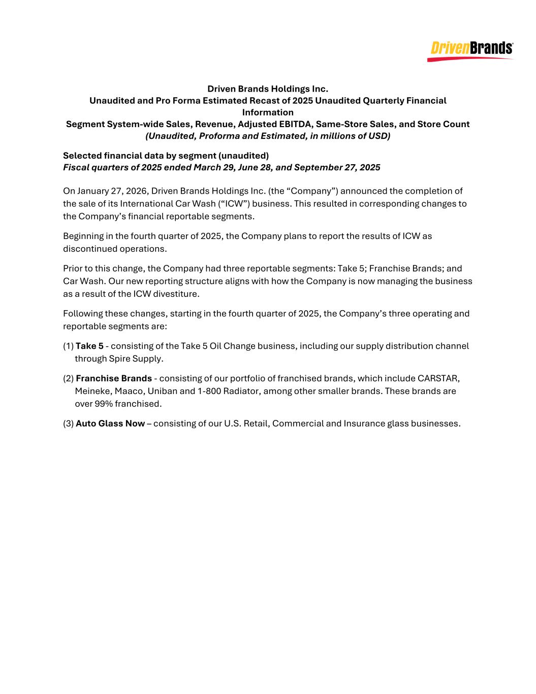 Driven Brands Holdings Inc. Unaudited and Pro Forma Estimated Recast of 2025 Unaudited Quarterly Financial Information Segment System-wide Sales, Revenue, Adjusted EBITDA, Same-Store Sales, and Store Count (Unaudited, Proforma and Estimated, in millions of USD) Selected financial data by segment (unaudited) Fiscal quarters of 2025 ended March 29, June 28, and September 27, 2025 On January 27, 2026, Driven Brands Holdings Inc. (the “Company”) announced the completion of the sale of its International Car Wash (“ICW”) business. This resulted in corresponding changes to the Company’s financial reportable segments. Beginning in the fourth quarter of 2025, the Company plans to report the results of ICW as discontinued operations. Prior to this change, the Company had three reportable segments: Take 5; Franchise Brands; and Car Wash. Our new reporting structure aligns with how the Company is now managing the business as a result of the ICW divestiture. Following these changes, starting in the fourth quarter of 2025, the Company’s three operating and reportable segments are: (1) Take 5 - consisting of the Take 5 Oil Change business, including our supply distribution channel through Spire Supply. (2) Franchise Brands - consisting of our portfolio of franchised brands, which include CARSTAR, Meineke, Maaco, Uniban and 1-800 Radiator, among other smaller brands. These brands are over 99% franchised. (3) Auto Glass Now – consisting of our U.S. Retail, Commercial and Insurance glass businesses.