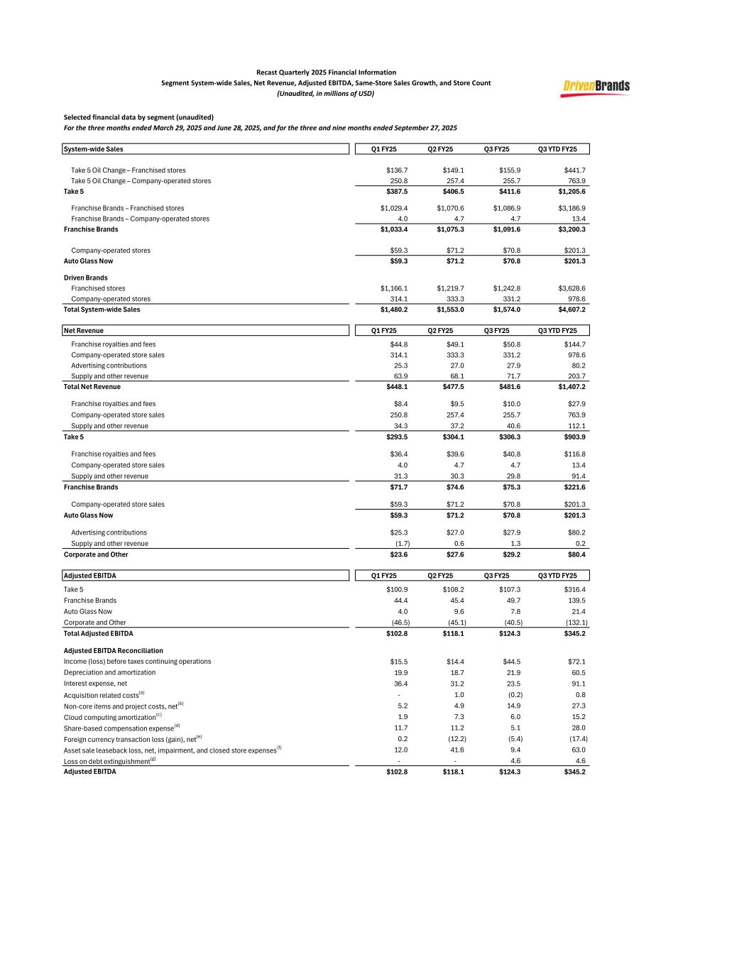 Recast Quarterly 2025 Financial Information Segment System-wide Sales, Net Revenue, Adjusted EBITDA, Same-Store Sales Growth, and Store Count (Unaudited, in millions of USD) Selected financial data by segment (unaudited) For the three months ended March 29, 2025 and June 28, 2025, and for the three and nine months ended September 27, 2025 System-wide Sales Q1 FY25 Q2 FY25 Q3 FY25 Q3 YTD FY25 Take 5 Oil Change – Franchised stores $136.7 $149.1 $155.9 $441.7 Take 5 Oil Change – Company-operated stores 250.8 257.4 255.7 763.9 Take 5 $387.5 $406.5 $411.6 $1,205.6 Franchise Brands – Franchised stores $1,029.4 $1,070.6 $1,086.9 $3,186.9 Franchise Brands – Company-operated stores 4.0 4.7 4.7 13.4 Franchise Brands $1,033.4 $1,075.3 $1,091.6 $3,200.3 Company-operated stores $59.3 $71.2 $70.8 $201.3 Auto Glass Now $59.3 $71.2 $70.8 $201.3 Driven Brands Franchised stores $1,166.1 $1,219.7 $1,242.8 $3,628.6 Company-operated stores 314.1 333.3 331.2 978.6 Total System-wide Sales $1,480.2 $1,553.0 $1,574.0 $4,607.2 Net Revenue Q1 FY25 Q2 FY25 Q3 FY25 Q3 YTD FY25 Franchise royalties and fees $44.8 $49.1 $50.8 $144.7 Company-operated store sales 314.1 333.3 331.2 978.6 Advertising contributions 25.3 27.0 27.9 80.2 Supply and other revenue 63.9 68.1 71.7 203.7 Total Net Revenue $448.1 $477.5 $481.6 $1,407.2 Franchise royalties and fees $8.4 $9.5 $10.0 $27.9 Company-operated store sales 250.8 257.4 255.7 763.9 Supply and other revenue 34.3 37.2 40.6 112.1 Take 5 $293.5 $304.1 $306.3 $903.9 Franchise royalties and fees $36.4 $39.6 $40.8 $116.8 Company-operated store sales 4.0 4.7 4.7 13.4 Supply and other revenue 31.3 30.3 29.8 91.4 Franchise Brands $71.7 $74.6 $75.3 $221.6 Company-operated store sales $59.3 $71.2 $70.8 $201.3 Auto Glass Now $59.3 $71.2 $70.8 $201.3 Advertising contributions $25.3 $27.0 $27.9 $80.2 Supply and other revenue (1.7) 0.6 1.3 0.2 Corporate and Other $23.6 $27.6 $29.2 $80.4 Adjusted EBITDA Q1 FY25 Q2 FY25 Q3 FY25 Q3 YTD FY25 Take 5 $100.9 $108.2 $107.3 $316.4 Franchise Brands 44.4 45.4 49.7 139.5 Auto Glass Now 4.0 9.6 7.8 21.4 Corporate and Other (46.5) (45.1) (40.5) (132.1) Total Adjusted EBITDA $102.8 $118.1 $124.3 $345.2 Adjusted EBITDA Reconciliation Income (loss) before taxes continuing operations $15.5 $14.4 $44.5 $72.1 Depreciation and amortization 19.9 18.7 21.9 60.5 Interest expense, net 36.4 31.2 23.5 91.1 Acquisition related costs(a) - 1.0 (0.2) 0.8 Non-core items and project costs, net(b) 5.2 4.9 14.9 27.3 Cloud computing amortization(c) 1.9 7.3 6.0 15.2 Share-based compensation expense(d) 11.7 11.2 5.1 28.0 Foreign currency transaction loss (gain), net(e) 0.2 (12.2) (5.4) (17.4) Asset sale leaseback loss, net, impairment, and closed store expenses(f) 12.0 41.6 9.4 63.0 Loss on debt extinguishment(g) - - 4.6 4.6 Adjusted EBITDA $102.8 $118.1 $124.3 $345.2