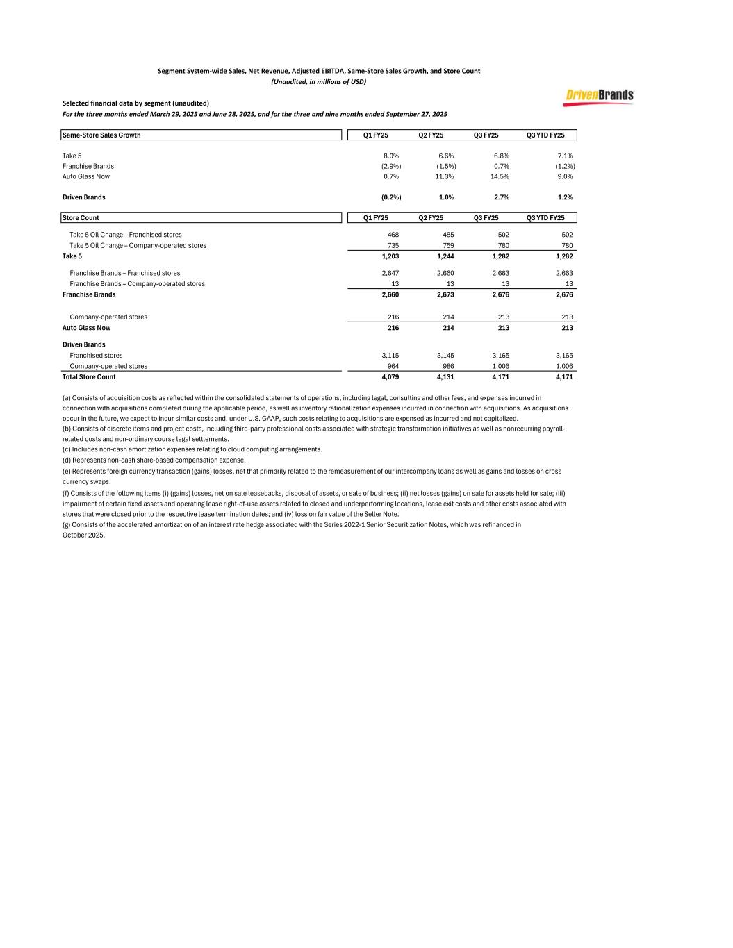 Segment System-wide Sales, Net Revenue, Adjusted EBITDA, Same-Store Sales Growth, and Store Count (Unaudited, in millions of USD) Selected financial data by segment (unaudited) For the three months ended March 29, 2025 and June 28, 2025, and for the three and nine months ended September 27, 2025 Same-Store Sales Growth Q1 FY25 Q2 FY25 Q3 FY25 Q3 YTD FY25 Take 5 8.0% 6.6% 6.8% 7.1% Franchise Brands (2.9%) (1.5%) 0.7% (1.2%) Auto Glass Now 0.7% 11.3% 14.5% 9.0% Driven Brands (0.2%) 1.0% 2.7% 1.2% Store Count Q1 FY25 Q2 FY25 Q3 FY25 Q3 YTD FY25 Take 5 Oil Change – Franchised stores 468 485 502 502 Take 5 Oil Change – Company-operated stores 735 759 780 780 Take 5 1,203 1,244 1,282 1,282 Franchise Brands – Franchised stores 2,647 2,660 2,663 2,663 Franchise Brands – Company-operated stores 13 13 13 13 Franchise Brands 2,660 2,673 2,676 2,676 Company-operated stores 216 214 213 213 Auto Glass Now 216 214 213 213 Driven Brands Franchised stores 3,115 3,145 3,165 3,165 Company-operated stores 964 986 1,006 1,006 Total Store Count 4,079 4,131 4,171 4,171 (c) Includes non-cash amortization expenses relating to cloud computing arrangements. (d) Represents non-cash share-based compensation expense. (e) Represents foreign currency transaction (gains) losses, net that primarily related to the remeasurement of our intercompany loans as well as gains and losses on cross currency swaps. (f) Consists of the following items (i) (gains) losses, net on sale leasebacks, disposal of assets, or sale of business; (ii) net losses (gains) on sale for assets held for sale; (iii) impairment of certain fixed assets and operating lease right-of-use assets related to closed and underperforming locations, lease exit costs and other costs associated with stores that were closed prior to the respective lease termination dates; and (iv) loss on fair value of the Seller Note. (g) Consists of the accelerated amortization of an interest rate hedge associated with the Series 2022-1 Senior Securitization Notes, which was refinanced in October 2025. (a) Consists of acquisition costs as reflected within the consolidated statements of operations, including legal, consulting and other fees, and expenses incurred in connection with acquisitions completed during the applicable period, as well as inventory rationalization expenses incurred in connection with acquisitions. As acquisitions occur in the future, we expect to incur similar costs and, under U.S. GAAP, such costs relating to acquisitions are expensed as incurred and not capitalized. (b) Consists of discrete items and project costs, including third-party professional costs associated with strategic transformation initiatives as well as nonrecurring payroll- related costs and non-ordinary course legal settlements.