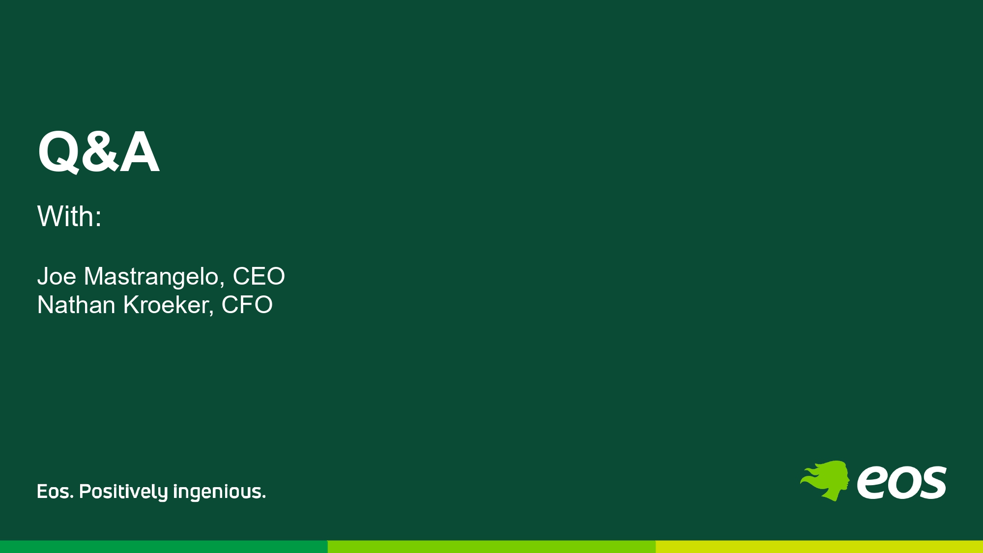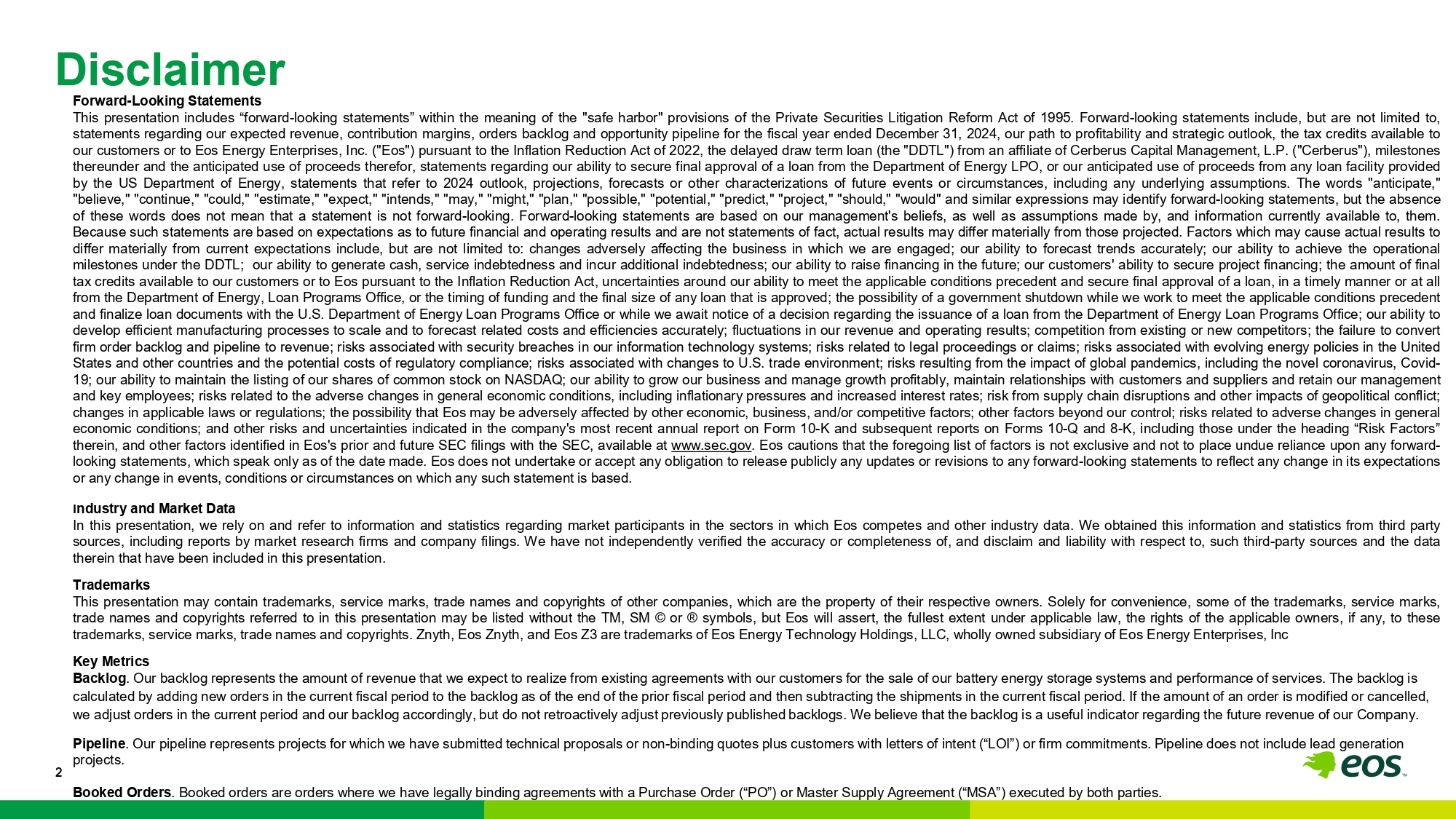 2 Forward - Looking Statements This presentation includes “forward - looking statements” within the meaning of the "safe harbor" provisions of the Private Securities Litigation Reform Act of 1995 . Forward - looking statements include, but are not limited to, statements regarding our expected revenue, contribution margins, orders backlog and opportunity pipeline for the fiscal year ended December 31 , 2024 , our path to profitability and strategic outlook, the tax credits available to our customers or to Eos Energy Enterprises, Inc . ("Eos") pursuant to the Inflation Reduction Act of 2022 , the delayed draw term loan (the "DDTL") from an affiliate of Cerberus Capital Management, L . P . ("Cerberus"), milestones thereunder and the anticipated use of proceeds therefor, statements regarding our ability to secure final approval of a loan from the Department of Energy LPO, or our anticipated use of proceeds from any loan facility provided by the US Department of Energy, statements that refer to 2024 outlook, projections, forecasts or other characterizations of future events or circumstances, including any underlying assumptions . The words "anticipate," "believe," "continue," "could," "estimate," "expect," "intends," "may," "might," "plan," "possible," "potential," "predict," "project," "should," "would" and similar expressions may identify forward - looking statements, but the absence of these words does not mean that a statement is not forward - looking . Forward - looking statements are based on our management's beliefs, as well as assumptions made by, and information currently available to, them . Because such statements are based on expectations as to future financial and operating results and are not statements of fact, actual results may differ materially from those projected . Factors which may cause actual results to differ materially from current expectations include, but are not limited to : changes adversely affecting the business in which we are engaged ; our ability to forecast trends accurately ; our ability to achieve the operational milestones under the DDTL ; our ability to generate cash, service indebtedness and incur additional indebtedness ; our ability to raise financing in the future ; our customers' ability to secure project financing ; the amount of final tax credits available to our customers or to Eos pursuant to the Inflation Reduction Act, uncertainties around our ability to meet the applicable conditions precedent and secure final approval of a loan, in a timely manner or at all from the Department of Energy, Loan Programs Office, or the timing of funding and the final size of any loan that is approved ; the possibility of a government shutdown while we work to meet the applicable conditions precedent and finalize loan documents with the U . S . Department of Energy Loan Programs Office or while we await notice of a decision regarding the issuance of a loan from the Department of Energy Loan Programs Office ; our ability to develop efficient manufacturing processes to scale and to forecast related costs and efficiencies accurately ; fluctuations in our revenue and operating results ; competition from existing or new competitors ; the failure to convert firm order backlog and pipeline to revenue ; risks associated with security breaches in our information technology systems ; risks related to legal proceedings or claims ; risks associated with evolving energy policies in the United States and other countries and the potential costs of regulatory compliance ; risks associated with changes to U . S . trade environment ; risks resulting from the impact of global pandemics, including the novel coronavirus, Covid - 19 ; our ability to maintain the listing of our shares of common stock on NASDAQ ; our ability to grow our business and manage growth profitably, maintain relationships with customers and suppliers and retain our management and key employees ; risks related to the adverse changes in general economic conditions, including inflationary pressures and increased interest rates ; risk from supply chain disruptions and other impacts of geopolitical conflict ; changes in applicable laws or regulations ; the possibility that Eos may be adversely affected by other economic, business, and/or competitive factors ; other factors beyond our control ; risks related to adverse changes in general economic conditions ; and other risks and uncertainties indicated in the company's most recent annual report on Form 10 - K and subsequent reports on Forms 10 - Q and 8 - K, including those under the heading “Risk Factors” therein, and other factors identified in Eos's prior and future SEC filings with the SEC, available at www . sec . gov . Eos cautions that the foregoing list of factors is not exclusive and not to place undue reliance upon any forward - looking statements, which speak only as of the date made . Eos does not undertake or accept any obligation to release publicly any updates or revisions to any forward - looking statements to reflect any change in its expectations or any change in events, conditions or circumstances on which any such statement is based . I ndustry and Market Data In this presentation, we rely on and refer to information and statistics regarding market participants in the sectors in which Eos competes and other industry data . We obtained this information and statistics from third party sources, including reports by market research firms and company filings . We have not independently verified the accuracy or completeness of, and disclaim and liability with respect to, such third - party sources and the data therein that have been included in this presentation . Trademarks This presentation may contain trademarks, service marks, trade names and copyrights of other companies, which are the property of their respective owners . Solely for convenience, some of the trademarks, service marks, trade names and copyrights referred to in this presenta