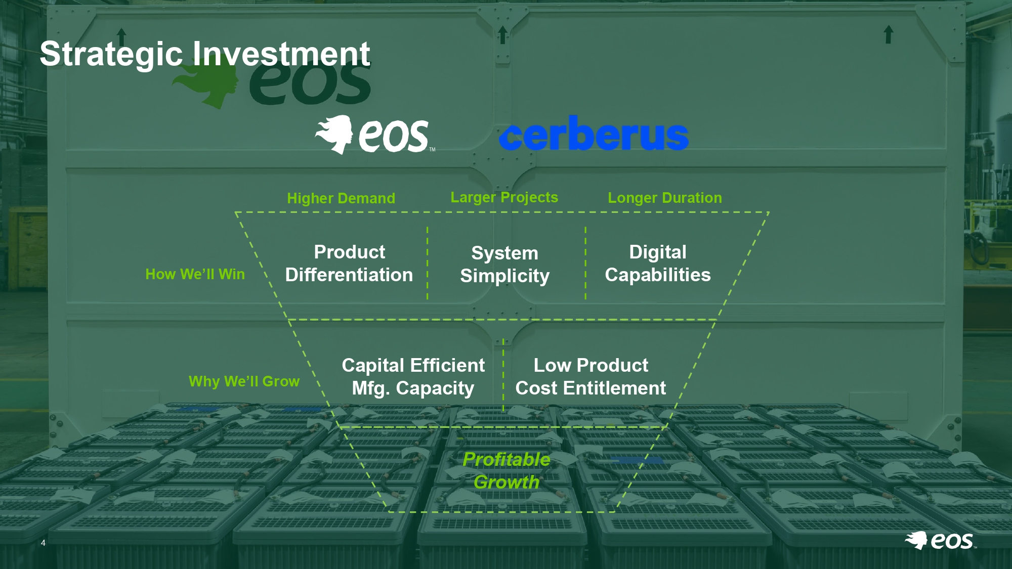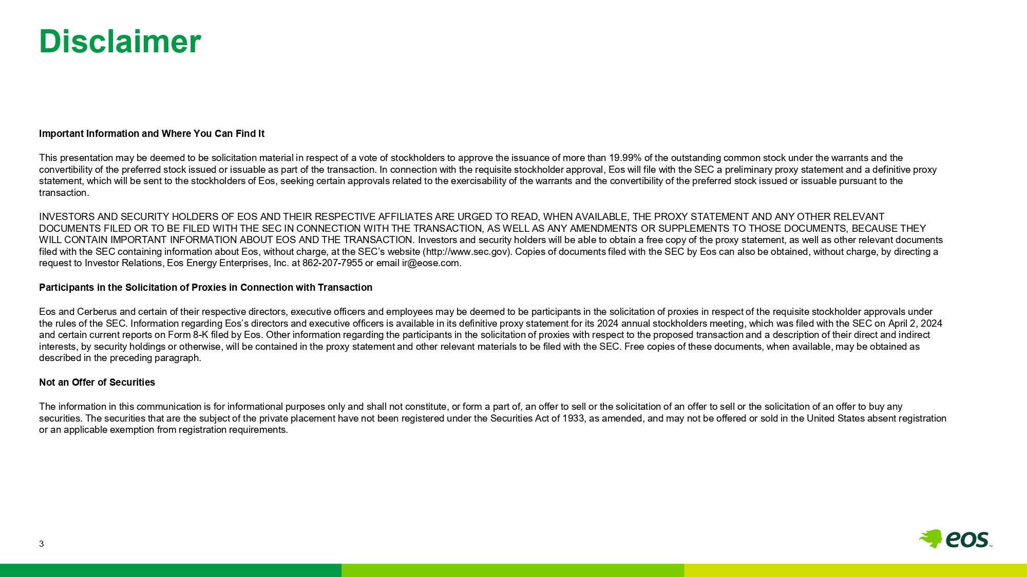 3 Disclaimer Important Information and Where You Can Find It This presentation may be deemed to be solicitation material in respect of a vote of stockholders to approve the issuance of m ore than 19.99% of the outstanding common stock under the warrants and the convertibility of the preferred stock issued or issuable as part of the transaction. In connection with the requisite stockho lde r approval, Eos will file with the SEC a preliminary proxy statement and a definitive proxy statement, which will be sent to the stockholders of Eos, seeking certain approvals related to the exercisability of the warr ant s and the convertibility of the preferred stock issued or issuable pursuant to the transaction. INVESTORS AND SECURITY HOLDERS OF EOS AND THEIR RESPECTIVE AFFILIATES ARE URGED TO READ, WHEN AVAILABLE, THE PROXY STATEMENT AND ANY OTHER RELEVANT DOCUMENTS FILED OR TO BE FILED WITH THE SEC IN CONNECTION WITH THE TRANSACTION, AS WELL AS ANY AMENDMENTS OR SUPPLEMENTS TO T HOS E DOCUMENTS, BECAUSE THEY WILL CONTAIN IMPORTANT INFORMATION ABOUT EOS AND THE TRANSACTION. Investors and security holders will be able to obtain a fre e c opy of the proxy statement, as well as other relevant documents filed with the SEC containing information about Eos, without charge, at the SEC’s website (http://www.sec.gov). Copies of doc ume nts filed with the SEC by Eos can also be obtained, without charge, by directing a request to Investor Relations, Eos Energy Enterprises, Inc. at 862 - 207 - 7955 or email ir@eose.com. Participants in the Solicitation of Proxies in Connection with Transaction Eos and Cerberus and certain of their respective directors, executive officers and employees may be deemed to be participants in the solicitation of proxies in respect of the requisite stockholder approvals under the rules of the SEC. Information regarding Eos’s directors and executive officers is available in its definitive proxy state men t for its 2024 annual stockholders meeting, which was filed with the SEC on April 2, 2024 and certain current reports on Form 8 - K filed by Eos. Other information regarding the participants in the solicitation of proxie s with respect to the proposed transaction and a description of their direct and indirect interests, by security holdings or otherwise, will be contained in the proxy statement and other relevant materials to be fil ed with the SEC. Free copies of these documents, when available, may be obtained as described in the preceding paragraph. Not an Offer of Securities The information in this communication is for informational purposes only and shall not constitute, or form a part of, an offe r t o sell or the solicitation of an offer to sell or the solicitation of an offer to buy any securities. The securities that are the subject of the private placement have not been registered under the Securities Act of 19 33, as amended, and may not be offered or sold in the United States absent registration or an applicable exemption from registration requirements.