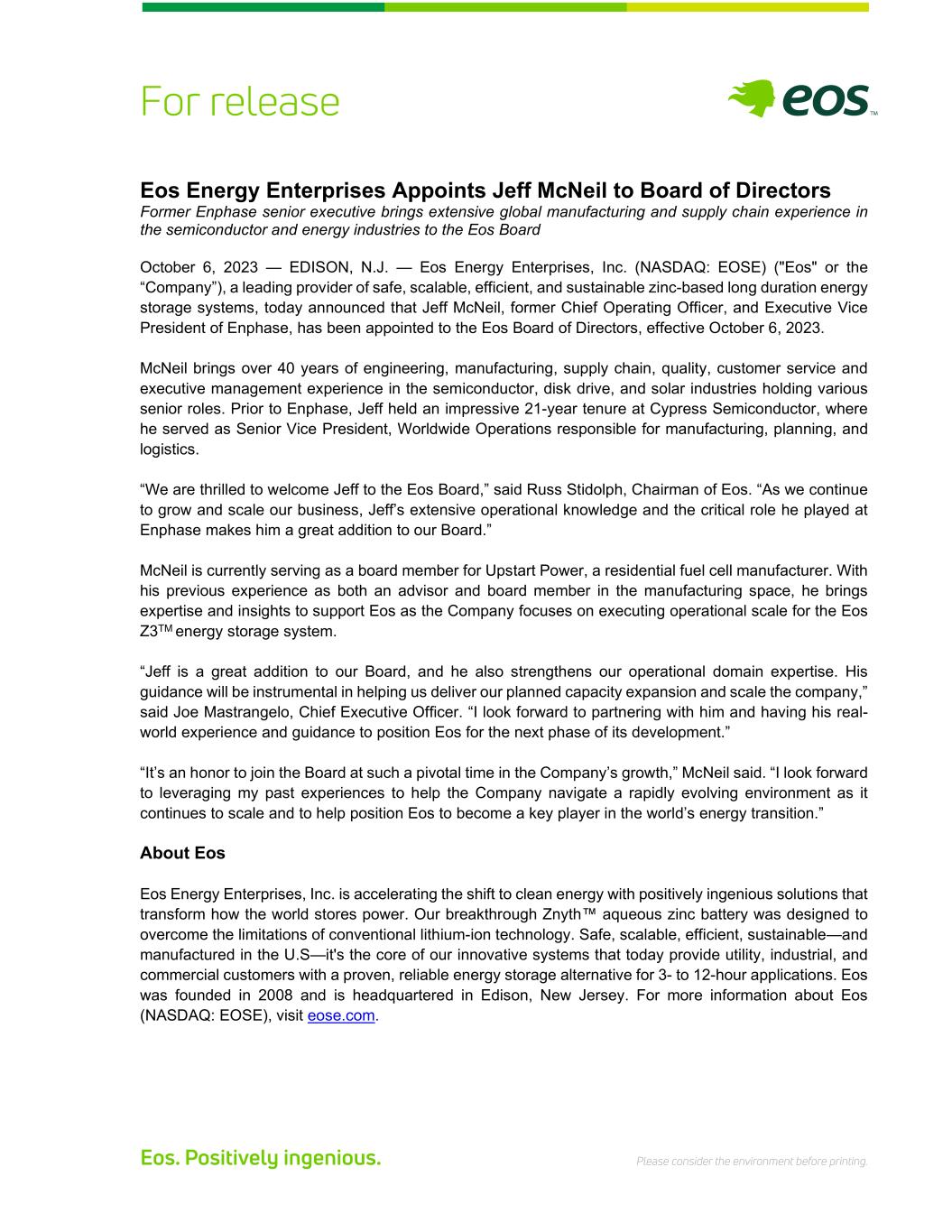 Eos Energy Enterprises Appoints Jeff McNeil to Board of Directors Former Enphase senior executive brings extensive global manufacturing and supply chain experience in the semiconductor and energy industries to the Eos Board October 6, 2023 — EDISON, N.J. — Eos Energy Enterprises, Inc. (NASDAQ: EOSE) ("Eos" or the “Company”), a leading provider of safe, scalable, efficient, and sustainable zinc-based long duration energy storage systems, today announced that Jeff McNeil, former Chief Operating Officer, and Executive Vice President of Enphase, has been appointed to the Eos Board of Directors, effective October 6, 2023. McNeil brings over 40 years of engineering, manufacturing, supply chain, quality, customer service and executive management experience in the semiconductor, disk drive, and solar industries holding various senior roles. Prior to Enphase, Jeff held an impressive 21-year tenure at Cypress Semiconductor, where he served as Senior Vice President, Worldwide Operations responsible for manufacturing, planning, and logistics. “We are thrilled to welcome Jeff to the Eos Board,” said Russ Stidolph, Chairman of Eos. “As we continue to grow and scale our business, Jeff’s extensive operational knowledge and the critical role he played at Enphase makes him a great addition to our Board.” McNeil is currently serving as a board member for Upstart Power, a residential fuel cell manufacturer. With his previous experience as both an advisor and board member in the manufacturing space, he brings expertise and insights to support Eos as the Company focuses on executing operational scale for the Eos Z3TM energy storage system. “Jeff is a great addition to our Board, and he also strengthens our operational domain expertise. His guidance will be instrumental in helping us deliver our planned capacity expansion and scale the company,” said Joe Mastrangelo, Chief Executive Officer. “I look forward to partnering with him and having his real- world experience and guidance to position Eos for the next phase of its development.” “It’s an honor to join the Board at such a pivotal time in the Company’s growth,” McNeil said. “I look forward to leveraging my past experiences to help the Company navigate a rapidly evolving environment as it continues to scale and to help position Eos to become a key player in the world’s energy transition.” About Eos Eos Energy Enterprises, Inc. is accelerating the shift to clean energy with positively ingenious solutions that transform how the world stores power. Our breakthrough Znyth™ aqueous zinc battery was designed to overcome the limitations of conventional lithium-ion technology. Safe, scalable, efficient, sustainable—and manufactured in the U.S—it's the core of our innovative systems that today provide utility, industrial, and commercial customers with a proven, reliable energy storage alternative for 3- to 12-hour applications. Eos was founded in 2008 and is headquartered in Edison, New Jersey. For more information about Eos (NASDAQ: EOSE), visit eose.com.