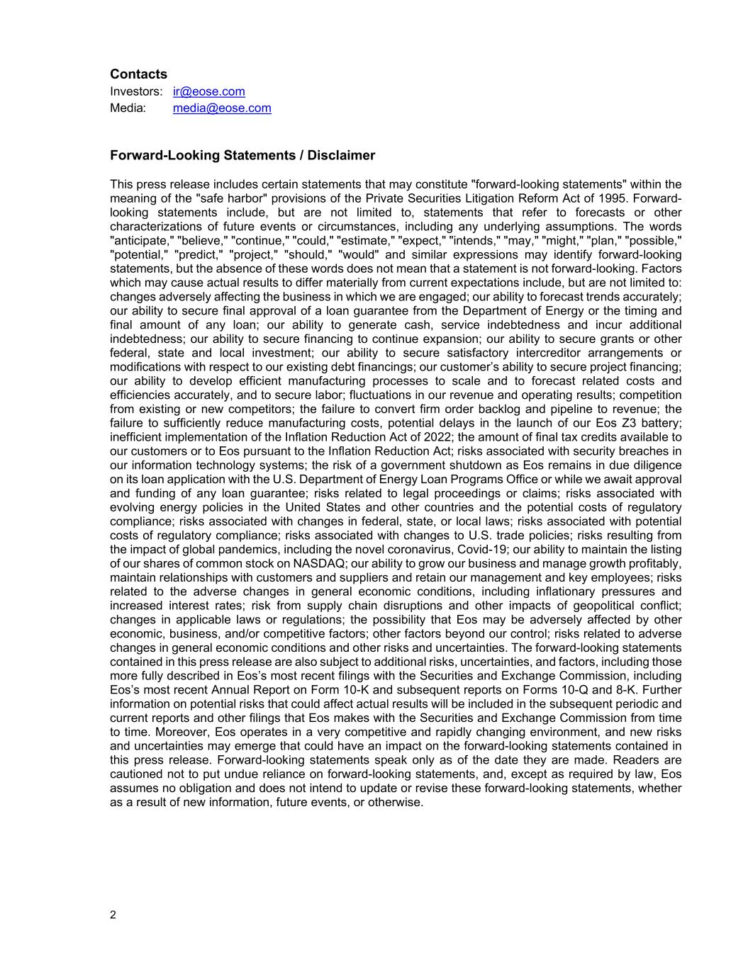 2 Contacts Investors: ir@eose.com Media: media@eose.com Forward-Looking Statements / Disclaimer This press release includes certain statements that may constitute "forward-looking statements" within the meaning of the "safe harbor" provisions of the Private Securities Litigation Reform Act of 1995. Forward- looking statements include, but are not limited to, statements that refer to forecasts or other characterizations of future events or circumstances, including any underlying assumptions. The words "anticipate," "believe," "continue," "could," "estimate," "expect," "intends," "may," "might," "plan," "possible," "potential," "predict," "project," "should," "would" and similar expressions may identify forward-looking statements, but the absence of these words does not mean that a statement is not forward-looking. Factors which may cause actual results to differ materially from current expectations include, but are not limited to: changes adversely affecting the business in which we are engaged; our ability to forecast trends accurately; our ability to secure final approval of a loan guarantee from the Department of Energy or the timing and final amount of any loan; our ability to generate cash, service indebtedness and incur additional indebtedness; our ability to secure financing to continue expansion; our ability to secure grants or other federal, state and local investment; our ability to secure satisfactory intercreditor arrangements or modifications with respect to our existing debt financings; our customer’s ability to secure project financing; our ability to develop efficient manufacturing processes to scale and to forecast related costs and efficiencies accurately, and to secure labor; fluctuations in our revenue and operating results; competition from existing or new competitors; the failure to convert firm order backlog and pipeline to revenue; the failure to sufficiently reduce manufacturing costs, potential delays in the launch of our Eos Z3 battery; inefficient implementation of the Inflation Reduction Act of 2022; the amount of final tax credits available to our customers or to Eos pursuant to the Inflation Reduction Act; risks associated with security breaches in our information technology systems; the risk of a government shutdown as Eos remains in due diligence on its loan application with the U.S. Department of Energy Loan Programs Office or while we await approval and funding of any loan guarantee; risks related to legal proceedings or claims; risks associated with evolving energy policies in the United States and other countries and the potential costs of regulatory compliance; risks associated with changes in federal, state, or local laws; risks associated with potential costs of regulatory compliance; risks associated with changes to U.S. trade policies; risks resulting from the impact of global pandemics, including the novel coronavirus, Covid-19; our ability to maintain the listing of our shares of common stock on NASDAQ; our ability to grow our business and manage growth profitably, maintain relationships with customers and suppliers and retain our management and key employees; risks related to the adverse changes in general economic conditions, including inflationary pressures and increased interest rates; risk from supply chain disruptions and other impacts of geopolitical conflict; changes in applicable laws or regulations; the possibility that Eos may be adversely affected by other economic, business, and/or competitive factors; other factors beyond our control; risks related to adverse changes in general economic conditions and other risks and uncertainties. The forward-looking statements contained in this press release are also subject to additional risks, uncertainties, and factors, including those more fully described in Eos’s most recent filings with the Securities and Exchange Commission, including Eos’s most recent Annual Report on Form 10-K and subsequent reports on Forms 10-Q and 8-K. Further information on potential risks that could affect actual results will be included in the subsequent periodic and current reports and other filings that Eos makes with the Securities and Exchange Commission from time to time. Moreover, Eos operates in a very competitive and rapidly changing environment, and new risks and uncertainties may emerge that could have an impact on the forward-looking statements contained in this press release. Forward-looking statements speak only as of the date they are made. Readers are cautioned not to put undue reliance on forward-looking statements, and, except as required by law, Eos assumes no obligation and does not intend to update or revise these forward-looking statements, whether as a result of new information, future events, or otherwise.