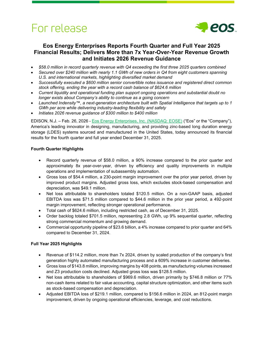 Eos Energy Enterprises Reports Fourth Quarter and Full Year 2025 Financial Results; Delivers More than 7x Year-Over-Year Revenue Growth and Initiates 2026 Revenue Guidance • $58.0 million in record quarterly revenue with Q4 exceeding the first three 2025 quarters combined • Secured over $240 million with nearly 1.1 GWh of new orders in Q4 from eight customers spanning U.S. and international markets, highlighting diversified market demand • Successfully executed a $600 million senior convertible notes issuance and registered direct common stock offering, ending the year with a record cash balance of $624.6 million • Current liquidity and operational funding plan support ongoing operations and substantial doubt no longer exists about Company’s ability to continue as a going concern • Launched Indensity™, a next-generation architecture built with Spatial Intelligence that targets up to 1 GWh per acre while delivering industry-leading flexibility and safety • Initiates 2026 revenue guidance of $300 million to $400 million EDISON, N.J. – Feb. 26, 2026 - Eos Energy Enterprises, Inc. (NASDAQ: EOSE) (“Eos” or the “Company”), America’s leading innovator in designing, manufacturing, and providing zinc-based long duration energy storage (LDES) systems sourced and manufactured in the United States, today announced its financial results for the fourth quarter and full year ended December 31, 2025. Fourth Quarter Highlights • Record quarterly revenue of $58.0 million, a 90% increase compared to the prior quarter and approximately 8x year-over-year, driven by efficiency and quality improvements in multiple operations and implementation of subassembly automation. • Gross loss of $54.4 million, a 230-point margin improvement over the prior year period, driven by improved product margins. Adjusted gross loss, which excludes stock-based compensation and depreciation, was $49.1 million. • Net loss attributable to shareholders totaled $120.5 million. On a non-GAAP basis, adjusted EBITDA loss was $71.5 million compared to $44.6 million in the prior year period, a 492-point margin improvement, reflecting stronger operational performance. • Total cash of $624.6 million, including restricted cash, as of December 31, 2025. • Order backlog totaled $701.5 million, representing 2.8 GWh, up 9% sequential quarter, reflecting strong commercial momentum and growing demand. • Commercial opportunity pipeline of $23.6 billion, a 4% increase compared to prior quarter and 64% compared to December 31, 2024. Full Year 2025 Highlights • Revenue of $114.2 million, more than 7x 2024, driven by scaled production of the company’s first generation highly automated manufacturing process and a 609% increase in customer deliveries. • Gross loss of $143.8 million, improving margins by 408 points, as manufacturing volumes increased and Z3 production costs declined. Adjusted gross loss was $128.5 million. • Net loss attributable to shareholders of $969.6 million, driven primarily by $746.8 million or 77% non-cash items related to fair value accounting, capital structure optimization, and other items such as stock-based compensation and depreciation. • Adjusted EBITDA loss of $219.1 million, compared to $156.6 million in 2024, an 812-point margin improvement, driven by ongoing operational efficiencies, leverage, and cost reductions.