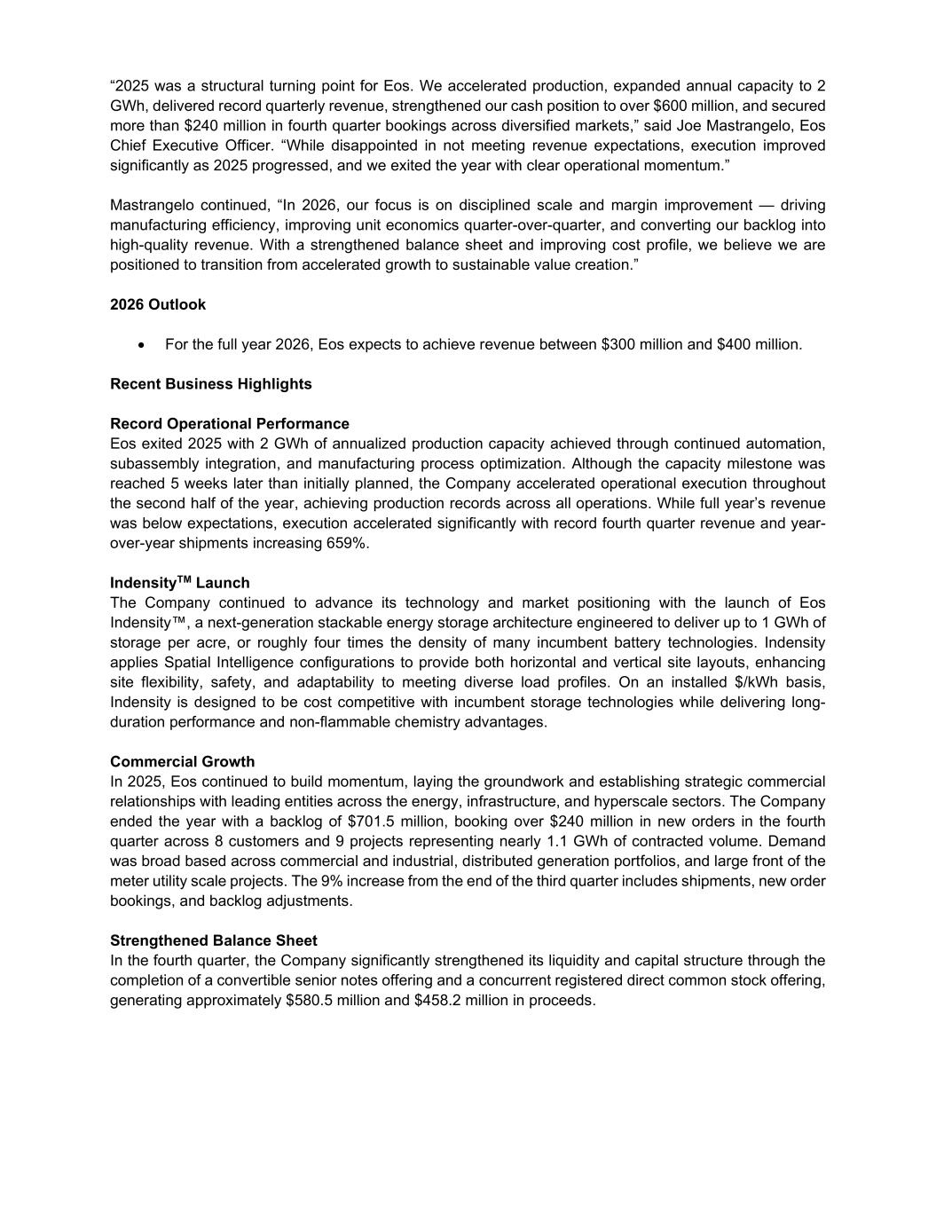 “2025 was a structural turning point for Eos. We accelerated production, expanded annual capacity to 2 GWh, delivered record quarterly revenue, strengthened our cash position to over $600 million, and secured more than $240 million in fourth quarter bookings across diversified markets,” said Joe Mastrangelo, Eos Chief Executive Officer. “While disappointed in not meeting revenue expectations, execution improved significantly as 2025 progressed, and we exited the year with clear operational momentum.” Mastrangelo continued, “In 2026, our focus is on disciplined scale and margin improvement — driving manufacturing efficiency, improving unit economics quarter-over-quarter, and converting our backlog into high-quality revenue. With a strengthened balance sheet and improving cost profile, we believe we are positioned to transition from accelerated growth to sustainable value creation.” 2026 Outlook • For the full year 2026, Eos expects to achieve revenue between $300 million and $400 million. Recent Business Highlights Record Operational Performance Eos exited 2025 with 2 GWh of annualized production capacity achieved through continued automation, subassembly integration, and manufacturing process optimization. Although the capacity milestone was reached 5 weeks later than initially planned, the Company accelerated operational execution throughout the second half of the year, achieving production records across all operations. While full year’s revenue was below expectations, execution accelerated significantly with record fourth quarter revenue and year- over-year shipments increasing 659%. IndensityTM Launch The Company continued to advance its technology and market positioning with the launch of Eos Indensity™, a next-generation stackable energy storage architecture engineered to deliver up to 1 GWh of storage per acre, or roughly four times the density of many incumbent battery technologies. Indensity applies Spatial Intelligence configurations to provide both horizontal and vertical site layouts, enhancing site flexibility, safety, and adaptability to meeting diverse load profiles. On an installed $/kWh basis, Indensity is designed to be cost competitive with incumbent storage technologies while delivering long- duration performance and non-flammable chemistry advantages. Commercial Growth In 2025, Eos continued to build momentum, laying the groundwork and establishing strategic commercial relationships with leading entities across the energy, infrastructure, and hyperscale sectors. The Company ended the year with a backlog of $701.5 million, booking over $240 million in new orders in the fourth quarter across 8 customers and 9 projects representing nearly 1.1 GWh of contracted volume. Demand was broad based across commercial and industrial, distributed generation portfolios, and large front of the meter utility scale projects. The 9% increase from the end of the third quarter includes shipments, new order bookings, and backlog adjustments. Strengthened Balance Sheet In the fourth quarter, the Company significantly strengthened its liquidity and capital structure through the completion of a convertible senior notes offering and a concurrent registered direct common stock offering, generating approximately $580.5 million and $458.2 million in proceeds.