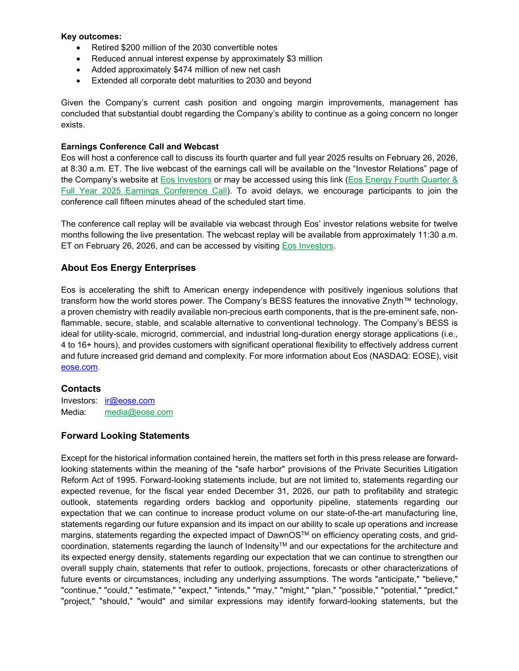 Key outcomes: • Retired $200 million of the 2030 convertible notes • Reduced annual interest expense by approximately $3 million • Added approximately $474 million of new net cash • Extended all corporate debt maturities to 2030 and beyond Given the Company’s current cash position and ongoing margin improvements, management has concluded that substantial doubt regarding the Company’s ability to continue as a going concern no longer exists. Earnings Conference Call and Webcast Eos will host a conference call to discuss its fourth quarter and full year 2025 results on February 26, 2026, at 8:30 a.m. ET. The live webcast of the earnings call will be available on the “Investor Relations” page of the Company’s website at Eos Investors or may be accessed using this link (Eos Energy Fourth Quarter & Full Year 2025 Earnings Conference Call). To avoid delays, we encourage participants to join the conference call fifteen minutes ahead of the scheduled start time. The conference call replay will be available via webcast through Eos’ investor relations website for twelve months following the live presentation. The webcast replay will be available from approximately 11:30 a.m. ET on February 26, 2026, and can be accessed by visiting Eos Investors. About Eos Energy Enterprises Eos is accelerating the shift to American energy independence with positively ingenious solutions that transform how the world stores power. The Company’s BESS features the innovative Znyth™ technology, a proven chemistry with readily available non-precious earth components, that is the pre-eminent safe, non- flammable, secure, stable, and scalable alternative to conventional technology. The Company’s BESS is ideal for utility-scale, microgrid, commercial, and industrial long-duration energy storage applications (i.e., 4 to 16+ hours), and provides customers with significant operational flexibility to effectively address current and future increased grid demand and complexity. For more information about Eos (NASDAQ: EOSE), visit eose.com. Contacts Investors: ir@eose.com Media: media@eose.com Forward Looking Statements Except for the historical information contained herein, the matters set forth in this press release are forward- looking statements within the meaning of the "safe harbor" provisions of the Private Securities Litigation Reform Act of 1995. Forward-looking statements include, but are not limited to, statements regarding our expected revenue, for the fiscal year ended December 31, 2026, our path to profitability and strategic outlook, statements regarding orders backlog and opportunity pipeline, statements regarding our expectation that we can continue to increase product volume on our state-of-the-art manufacturing line, statements regarding our future expansion and its impact on our ability to scale up operations and increase margins, statements regarding the expected impact of DawnOSTM on efficiency operating costs, and grid- coordination, statements regarding the launch of IndensityTM and our expectations for the architecture and its expected energy density, statements regarding our expectation that we can continue to strengthen our overall supply chain, statements that refer to outlook, projections, forecasts or other characterizations of future events or circumstances, including any underlying assumptions. The words "anticipate," "believe," "continue," "could," "estimate," "expect," "intends," "may," "might," "plan," "possible," "potential," "predict," "project," "should," "would" and similar expressions may identify forward-looking statements, but the