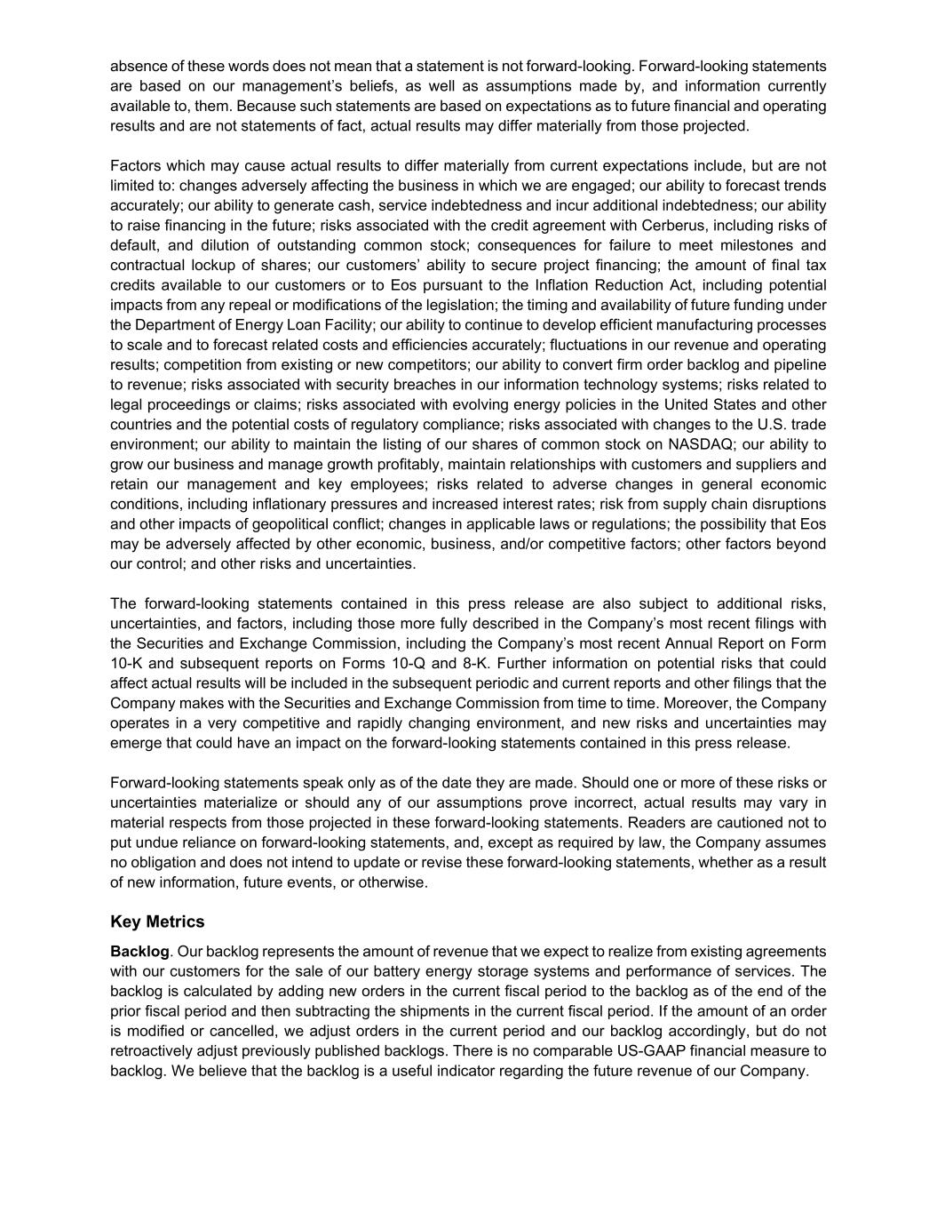 absence of these words does not mean that a statement is not forward-looking. Forward-looking statements are based on our management’s beliefs, as well as assumptions made by, and information currently available to, them. Because such statements are based on expectations as to future financial and operating results and are not statements of fact, actual results may differ materially from those projected. Factors which may cause actual results to differ materially from current expectations include, but are not limited to: changes adversely affecting the business in which we are engaged; our ability to forecast trends accurately; our ability to generate cash, service indebtedness and incur additional indebtedness; our ability to raise financing in the future; risks associated with the credit agreement with Cerberus, including risks of default, and dilution of outstanding common stock; consequences for failure to meet milestones and contractual lockup of shares; our customers’ ability to secure project financing; the amount of final tax credits available to our customers or to Eos pursuant to the Inflation Reduction Act, including potential impacts from any repeal or modifications of the legislation; the timing and availability of future funding under the Department of Energy Loan Facility; our ability to continue to develop efficient manufacturing processes to scale and to forecast related costs and efficiencies accurately; fluctuations in our revenue and operating results; competition from existing or new competitors; our ability to convert firm order backlog and pipeline to revenue; risks associated with security breaches in our information technology systems; risks related to legal proceedings or claims; risks associated with evolving energy policies in the United States and other countries and the potential costs of regulatory compliance; risks associated with changes to the U.S. trade environment; our ability to maintain the listing of our shares of common stock on NASDAQ; our ability to grow our business and manage growth profitably, maintain relationships with customers and suppliers and retain our management and key employees; risks related to adverse changes in general economic conditions, including inflationary pressures and increased interest rates; risk from supply chain disruptions and other impacts of geopolitical conflict; changes in applicable laws or regulations; the possibility that Eos may be adversely affected by other economic, business, and/or competitive factors; other factors beyond our control; and other risks and uncertainties. The forward-looking statements contained in this press release are also subject to additional risks, uncertainties, and factors, including those more fully described in the Company’s most recent filings with the Securities and Exchange Commission, including the Company’s most recent Annual Report on Form 10-K and subsequent reports on Forms 10-Q and 8-K. Further information on potential risks that could affect actual results will be included in the subsequent periodic and current reports and other filings that the Company makes with the Securities and Exchange Commission from time to time. Moreover, the Company operates in a very competitive and rapidly changing environment, and new risks and uncertainties may emerge that could have an impact on the forward-looking statements contained in this press release. Forward-looking statements speak only as of the date they are made. Should one or more of these risks or uncertainties materialize or should any of our assumptions prove incorrect, actual results may vary in material respects from those projected in these forward-looking statements. Readers are cautioned not to put undue reliance on forward-looking statements, and, except as required by law, the Company assumes no obligation and does not intend to update or revise these forward-looking statements, whether as a result of new information, future events, or otherwise. Key Metrics Backlog. Our backlog represents the amount of revenue that we expect to realize from existing agreements with our customers for the sale of our battery energy storage systems and performance of services. The backlog is calculated by adding new orders in the current fiscal period to the backlog as of the end of the prior fiscal period and then subtracting the shipments in the current fiscal period. If the amount of an order is modified or cancelled, we adjust orders in the current period and our backlog accordingly, but do not retroactively adjust previously published backlogs. There is no comparable US-GAAP financial measure to backlog. We believe that the backlog is a useful indicator regarding the future revenue of our Company.