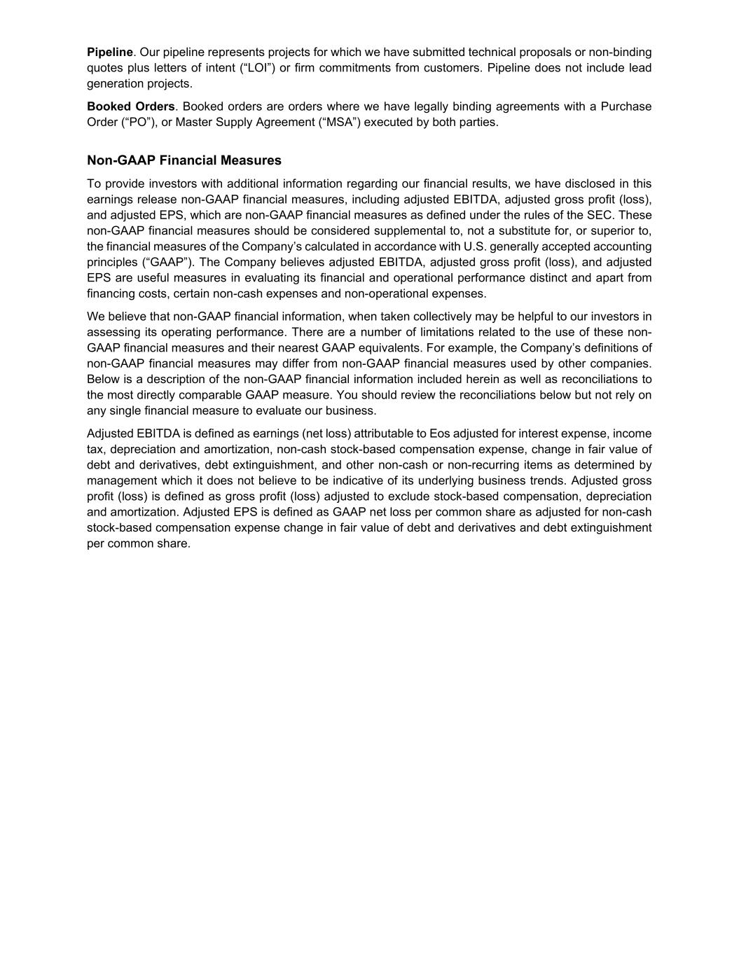 Pipeline. Our pipeline represents projects for which we have submitted technical proposals or non-binding quotes plus letters of intent (“LOI”) or firm commitments from customers. Pipeline does not include lead generation projects. Booked Orders. Booked orders are orders where we have legally binding agreements with a Purchase Order (“PO”), or Master Supply Agreement (“MSA”) executed by both parties. Non-GAAP Financial Measures To provide investors with additional information regarding our financial results, we have disclosed in this earnings release non-GAAP financial measures, including adjusted EBITDA, adjusted gross profit (loss), and adjusted EPS, which are non-GAAP financial measures as defined under the rules of the SEC. These non-GAAP financial measures should be considered supplemental to, not a substitute for, or superior to, the financial measures of the Company’s calculated in accordance with U.S. generally accepted accounting principles (“GAAP”). The Company believes adjusted EBITDA, adjusted gross profit (loss), and adjusted EPS are useful measures in evaluating its financial and operational performance distinct and apart from financing costs, certain non-cash expenses and non-operational expenses. We believe that non-GAAP financial information, when taken collectively may be helpful to our investors in assessing its operating performance. There are a number of limitations related to the use of these non- GAAP financial measures and their nearest GAAP equivalents. For example, the Company’s definitions of non-GAAP financial measures may differ from non-GAAP financial measures used by other companies. Below is a description of the non-GAAP financial information included herein as well as reconciliations to the most directly comparable GAAP measure. You should review the reconciliations below but not rely on any single financial measure to evaluate our business. Adjusted EBITDA is defined as earnings (net loss) attributable to Eos adjusted for interest expense, income tax, depreciation and amortization, non-cash stock-based compensation expense, change in fair value of debt and derivatives, debt extinguishment, and other non-cash or non-recurring items as determined by management which it does not believe to be indicative of its underlying business trends. Adjusted gross profit (loss) is defined as gross profit (loss) adjusted to exclude stock-based compensation, depreciation and amortization. Adjusted EPS is defined as GAAP net loss per common share as adjusted for non-cash stock-based compensation expense change in fair value of debt and derivatives and debt extinguishment per common share.