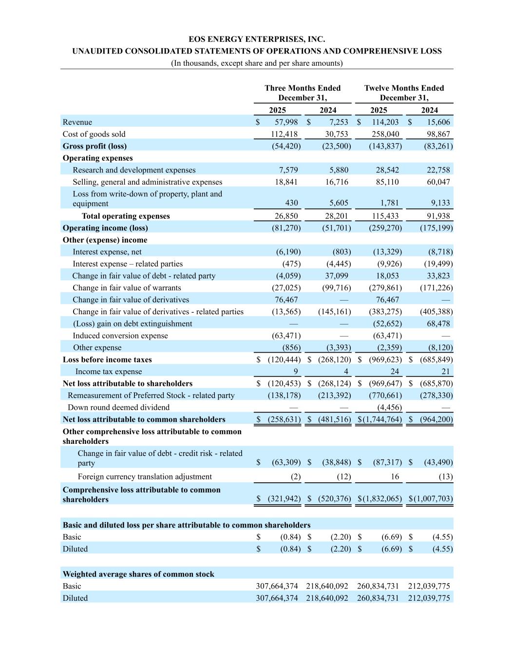 EOS ENERGY ENTERPRISES, INC. UNAUDITED CONSOLIDATED STATEMENTS OF OPERATIONS AND COMPREHENSIVE LOSS (In thousands, except share and per share amounts) Three Months Ended December 31, Twelve Months Ended December 31, 2025 2024 2025 2024 Revenue $ 57,998 $ 7,253 $ 114,203 $ 15,606 Cost of goods sold 112,418 30,753 258,040 98,867 Gross profit (loss) (54,420) (23,500) (143,837) (83,261) Operating expenses Research and development expenses 7,579 5,880 28,542 22,758 Selling, general and administrative expenses 18,841 16,716 85,110 60,047 Loss from write-down of property, plant and equipment 430 5,605 1,781 9,133 Total operating expenses 26,850 28,201 115,433 91,938 Operating income (loss) (81,270) (51,701) (259,270) (175,199) Other (expense) income Interest expense, net (6,190) (803) (13,329) (8,718) Interest expense – related parties (475) (4,445) (9,926) (19,499) Change in fair value of debt - related party (4,059) 37,099 18,053 33,823 Change in fair value of warrants (27,025) (99,716) (279,861) (171,226) Change in fair value of derivatives 76,467 — 76,467 — Change in fair value of derivatives - related parties (13,565) (145,161) (383,275) (405,388) (Loss) gain on debt extinguishment — — (52,652) 68,478 Induced conversion expense (63,471) — (63,471) — Other expense (856) (3,393) (2,359) (8,120) Loss before income taxes $ (120,444) $ (268,120) $ (969,623) $ (685,849) Income tax expense 9 4 24 21 Net loss attributable to shareholders $ (120,453) $ (268,124) $ (969,647) $ (685,870) Remeasurement of Preferred Stock - related party (138,178) (213,392) (770,661) (278,330) Down round deemed dividend — — (4,456) — Net loss attributable to common shareholders $ (258,631) $ (481,516) $ (1,744,764) $ (964,200) Other comprehensive loss attributable to common shareholders Change in fair value of debt - credit risk - related party $ (63,309) $ (38,848) $ (87,317) $ (43,490) Foreign currency translation adjustment (2) (12) 16 (13) Comprehensive loss attributable to common shareholders $ (321,942) $ (520,376) $ (1,832,065) $ (1,007,703) Basic and diluted loss per share attributable to common shareholders Basic $ (0.84) $ (2.20) $ (6.69) $ (4.55) Diluted $ (0.84) $ (2.20) $ (6.69) $ (4.55) Weighted average shares of common stock Basic 307,664,374 218,640,092 260,834,731 212,039,775 Diluted 307,664,374 218,640,092 260,834,731 212,039,775