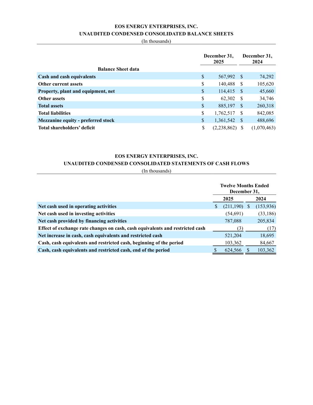 EOS ENERGY ENTERPRISES, INC. UNAUDITED CONDENSED CONSOLIDATED BALANCE SHEETS (In thousands) December 31, 2025 December 31, 2024 Balance Sheet data Cash and cash equivalents $ 567,992 $ 74,292 Other current assets $ 140,488 $ 105,620 Property, plant and equipment, net $ 114,415 $ 45,660 Other assets $ 62,302 $ 34,746 Total assets $ 885,197 $ 260,318 Total liabilities $ 1,762,517 $ 842,085 Mezzanine equity - preferred stock $ 1,361,542 $ 488,696 Total shareholders’ deficit $ (2,238,862) $ (1,070,463) EOS ENERGY ENTERPRISES, INC. UNAUDITED CONDENSED CONSOLIDATED STATEMENTS OF CASH FLOWS (In thousands) Twelve Months Ended December 31, 2025 2024 Net cash used in operating activities $ (211,190) $ (153,936) Net cash used in investing activities (54,691) (33,186) Net cash provided by financing activities 787,088 205,834 Effect of exchange rate changes on cash, cash equivalents and restricted cash (3) (17) Net increase in cash, cash equivalents and restricted cash 521,204 18,695 Cash, cash equivalents and restricted cash, beginning of the period 103,362 84,667 Cash, cash equivalents and restricted cash, end of the period $ 624,566 $ 103,362
