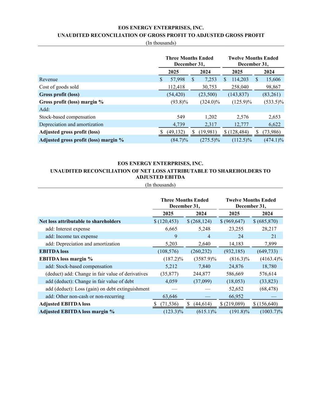 EOS ENERGY ENTERPRISES, INC. UNAUDITED RECONCILIATION OF GROSS PROFIT TO ADJUSTED GROSS PROFIT (In thousands) Three Months Ended December 31, Twelve Months Ended December 31, 2025 2024 2025 2024 Revenue $ 57,998 $ 7,253 $ 114,203 $ 15,606 Cost of goods sold 112,418 30,753 258,040 98,867 Gross profit (loss) (54,420) (23,500) (143,837) (83,261) Gross profit (loss) margin % (93.8) % (324.0) % (125.9) % (533.5) % Add: Stock-based compensation 549 1,202 2,576 2,653 Depreciation and amortization 4,739 2,317 12,777 6,622 Adjusted gross profit (loss) $ (49,132) $ (19,981) $ (128,484) $ (73,986) Adjusted gross profit (loss) margin % (84.7) % (275.5) % (112.5) % (474.1) % EOS ENERGY ENTERPRISES, INC. UNAUDITED RECONCILIATION OF NET LOSS ATTRIBUTABLE TO SHAREHOLDERS TO ADJUSTED EBITDA (In thousands) Three Months Ended December 31, Twelve Months Ended December 31, 2025 2024 2025 2024 Net loss attributable to shareholders $ (120,453) $ (268,124) $ (969,647) $ (685,870) add: Interest expense 6,665 5,248 23,255 28,217 add: Income tax expense 9 4 24 21 add: Depreciation and amortization 5,203 2,640 14,183 7,899 EBITDA loss (108,576) (260,232) (932,185) (649,733) EBITDA loss margin % (187.2) % (3587.9) % (816.3) % (4163.4) % add: Stock-based compensation 5,212 7,840 24,876 18,780 (deduct) add: Change in fair value of derivatives (35,877) 244,877 586,669 576,614 add (deduct): Change in fair value of debt 4,059 (37,099) (18,053) (33,823) add (deduct): Loss (gain) on debt extinguishment — — 52,652 (68,478) add: Other non-cash or non-recurring 63,646 — 66,952 — Adjusted EBITDA loss $ (71,536) $ (44,614) $ (219,089) $ (156,640) Adjusted EBITDA loss margin % (123.3) % (615.1) % (191.8) % (1003.7) %