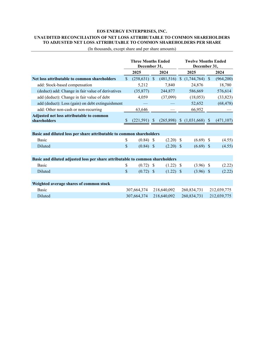 EOS ENERGY ENTERPRISES, INC. UNAUDITED RECONCILIATION OF NET LOSS ATTRIBUTABLE TO COMMON SHAREHOLDERS TO ADJUSTED NET LOSS ATTRIBUTABLE TO COMMON SHAREHOLDERS PER SHARE (In thousands, except share and per share amounts) Three Months Ended December 31, Twelve Months Ended December 31, 2025 2024 2025 2024 Net loss attributable to common shareholders $ (258,631) $ (481,516) $ (1,744,764) $ (964,200) add: Stock-based compensation 5,212 7,840 24,876 18,780 (deduct) add: Change in fair value of derivatives (35,877) 244,877 586,669 576,614 add (deduct): Change in fair value of debt 4,059 (37,099) (18,053) (33,823) add (deduct): Loss (gain) on debt extinguishment — — 52,652 (68,478) add: Other non-cash or non-recurring 63,646 — 66,952 — Adjusted net loss attributable to common shareholders $ (221,591) $ (265,898) $ (1,031,668) $ (471,107) Basic and diluted loss per share attributable to common shareholders Basic $ (0.84) $ (2.20) $ (6.69) $ (4.55) Diluted $ (0.84) $ (2.20) $ (6.69) $ (4.55) Basic and diluted adjusted loss per share attributable to common shareholders Basic $ (0.72) $ (1.22) $ (3.96) $ (2.22) Diluted $ (0.72) $ (1.22) $ (3.96) $ (2.22) Weighted average shares of common stock Basic 307,664,374 218,640,092 260,834,731 212,039,775 Diluted 307,664,374 218,640,092 260,834,731 212,039,775