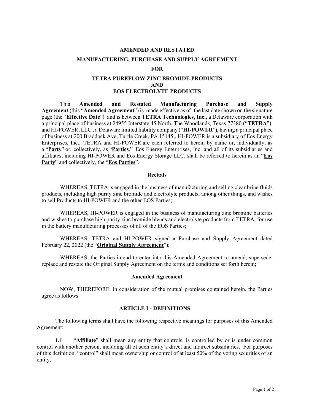 Page 1 of 21 AMENDED AND RESTATED MANUFACTURING, PURCHASE AND SUPPLY AGREEMENT FOR TETRA PUREFLOW ZINC BROMIDE PRODUCTS AND EOS ELECTROLYTE PRODUCTS This Amended and Restated Manufacturing Purchase and Supply Agreement (this “Amended Agreement”) is made effective as of the last date shown on the signature page (the “Effective Date”) and is between TETRA Technologies, Inc., a Delaware corporation with a principal place of business at 24955 Interstate 45 North, The Woodlands, Texas 77380 (“TETRA”), and HI-POWER, LLC , a Delaware limited liability company (“HI-POWER”), having a principal place of business at 200 Braddock Ave, Turtle Creek, PA 15145;, HI-POWER is a subsidiary of Eos Energy Enterprises, Inc.. TETRA and HI-POWER are each referred to herein by name or, individually, as a “Party” or, collectively, as “Parties.” Eos Energy Enterprises, Inc. and all of its subsidiaries and affiliates, including HI-POWER and Eos Energy Storage LLC, shall be referred to herein as an “Eos Party” and collectively, the “Eos Parties”. Recitals WHEREAS, TETRA is engaged in the business of manufacturing and selling clear brine fluids products, including high purity zinc bromide and electrolyte products, among other things, and wishes to sell Products to HI-POWER and the other EOS Parties; WHEREAS, HI-POWER is engaged in the business of manufacturing zinc bromine batteries and wishes to purchase high purity zinc bromide blends and electrolyte products from TETRA, for use in the battery manufacturing processes of all of the EOS Parties; WHEREAS, TETRA and HI-POWER signed a Purchase and Supply Agreement dated February 22, 2022 (the “Original Supply Agreement”); WHEREAS, the Parties intend to enter into this Amended Agreement to amend, supersede, replace and restate the Original Supply Agreement on the terms and conditions set forth herein; Amended Agreement NOW, THEREFORE, in consideration of the mutual promises contained herein, the Parties agree as follows: ARTICLE I - DEFINITIONS The following terms shall have the following respective meanings for purposes of this Amended Agreement: 1.1 “Affiliate” shall mean any entity that controls, is controlled by or is under common control with another person, including all of such entity’s direct and indirect subsidiaries. For purposes of this definition, “control” shall mean ownership or control of at least 50% of the voting securities of an entity.