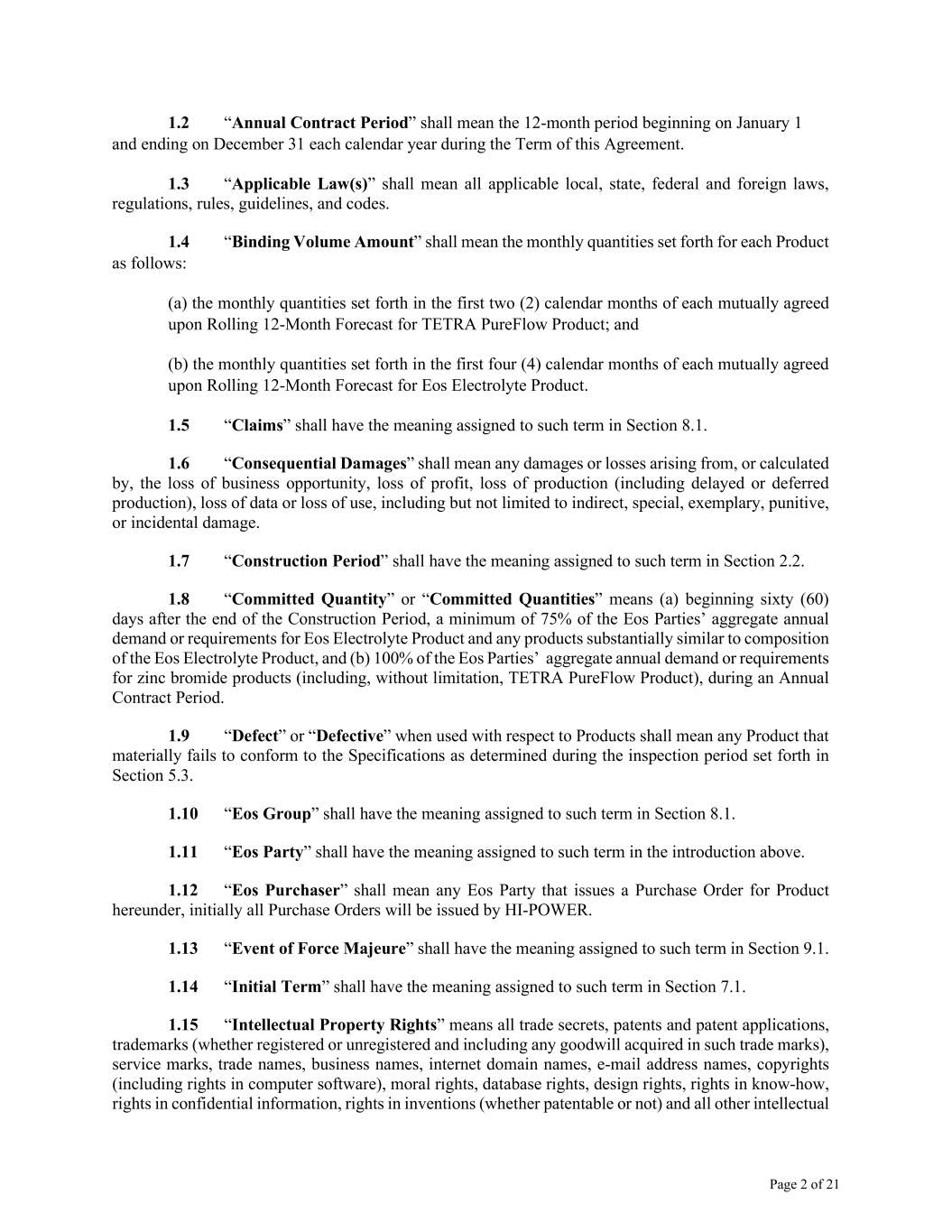 Page 2 of 21 1.2 “Annual Contract Period” shall mean the 12-month period beginning on January 1 and ending on December 31 each calendar year during the Term of this Agreement. 1.3 “Applicable Law(s)” shall mean all applicable local, state, federal and foreign laws, regulations, rules, guidelines, and codes. 1.4 “Binding Volume Amount” shall mean the monthly quantities set forth for each Product as follows: (a) the monthly quantities set forth in the first two (2) calendar months of each mutually agreed upon Rolling 12-Month Forecast for TETRA PureFlow Product; and (b) the monthly quantities set forth in the first four (4) calendar months of each mutually agreed upon Rolling 12-Month Forecast for Eos Electrolyte Product. 1.5 “Claims” shall have the meaning assigned to such term in Section 8.1. 1.6 “Consequential Damages” shall mean any damages or losses arising from, or calculated by, the loss of business opportunity, loss of profit, loss of production (including delayed or deferred production), loss of data or loss of use, including but not limited to indirect, special, exemplary, punitive, or incidental damage. 1.7 “Construction Period” shall have the meaning assigned to such term in Section 2.2. 1.8 “Committed Quantity” or “Committed Quantities” means (a) beginning sixty (60) days after the end of the Construction Period, a minimum of 75% of the Eos Parties’ aggregate annual demand or requirements for Eos Electrolyte Product and any products substantially similar to composition of the Eos Electrolyte Product, and (b) 100% of the Eos Parties’ aggregate annual demand or requirements for zinc bromide products (including, without limitation, TETRA PureFlow Product), during an Annual Contract Period. 1.9 “Defect” or “Defective” when used with respect to Products shall mean any Product that materially fails to conform to the Specifications as determined during the inspection period set forth in Section 5.3. 1.10 “Eos Group” shall have the meaning assigned to such term in Section 8.1. 1.11 “Eos Party” shall have the meaning assigned to such term in the introduction above. 1.12 “Eos Purchaser” shall mean any Eos Party that issues a Purchase Order for Product hereunder, initially all Purchase Orders will be issued by HI-POWER. 1.13 “Event of Force Majeure” shall have the meaning assigned to such term in Section 9.1. 1.14 “Initial Term” shall have the meaning assigned to such term in Section 7.1. 1.15 “Intellectual Property Rights” means all trade secrets, patents and patent applications, trademarks (whether registered or unregistered and including any goodwill acquired in such trade marks), service marks, trade names, business names, internet domain names, e-mail address names, copyrights (including rights in computer software), moral rights, database rights, design rights, rights in know-how, rights in confidential information, rights in inventions (whether patentable or not) and all other intellectual