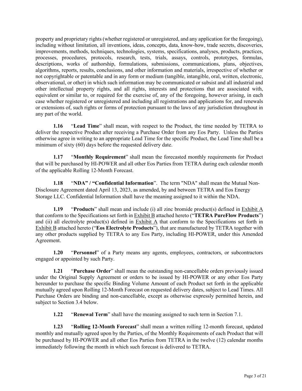 Page 3 of 21 property and proprietary rights (whether registered or unregistered, and any application for the foregoing), including without limitation, all inventions, ideas, concepts, data, know-how, trade secrets, discoveries, improvements, methods, techniques, technologies, systems, specifications, analyses, products, practices, processes, procedures, protocols, research, tests, trials, assays, controls, prototypes, formulas, descriptions, works of authorship, formulations, submissions, communications, plans, objectives, algorithms, reports, results, conclusions, and other information and materials, irrespective of whether or not copyrightable or patentable and in any form or medium (tangible, intangible, oral, written, electronic, observational, or other) in which such information may be communicated or subsist and all industrial and other intellectual property rights, and all rights, interests and protections that are associated with, equivalent or similar to, or required for the exercise of, any of the foregoing, however arising, in each case whether registered or unregistered and including all registrations and applications for, and renewals or extensions of, such rights or forms of protection pursuant to the laws of any jurisdiction throughout in any part of the world. 1.16 “Lead Time” shall mean, with respect to the Product, the time needed by TETRA to deliver the respective Product after receiving a Purchase Order from any Eos Party. Unless the Parties otherwise agree in writing to an appropriate Lead Time for the specific Product, the Lead Time shall be a minimum of sixty (60) days before the requested delivery date. 1.17 “Monthly Requirement” shall mean the forecasted monthly requirements for Product that will be purchased by HI-POWER and all other Eos Parties from TETRA during each calendar month of the applicable Rolling 12-Month Forecast. 1.18 “NDA” / “Confidential Information”. The term "NDA" shall mean the Mutual Non- Disclosure Agreement dated April 13, 2023, as amended, by and between TETRA and Eos Energy Storage LLC. Confidential Information shall have the meaning assigned to it within the NDA. 1.19 “Products” shall mean and include (i) all zinc bromide product(s) defined in Exhibit A that conform to the Specifications set forth in Exhibit B attached hereto (“TETRA PureFlow Products”) and (ii) all electrolyte product(s) defined in Exhibit A that conform to the Specifications set forth in Exhibit B attached hereto (“Eos Electrolyte Products”), that are manufactured by TETRA together with any other products supplied by TETRA to any Eos Party, including HI-POWER, under this Amended Agreement. 1.20 “Personnel” of a Party means any agents, employees, contractors, or subcontractors engaged or appointed by such Party. 1.21 “Purchase Order” shall mean the outstanding non-cancellable orders previously issued under the Original Supply Agreement or orders to be issued by HI-POWER or any other Eos Party hereunder to purchase the specific Binding Volume Amount of each Product set forth in the applicable mutually agreed upon Rolling 12-Month Forecast on requested delivery dates, subject to Lead Times. All Purchase Orders are binding and non-cancellable, except as otherwise expressly permitted herein, and subject to Section 3.4 below. 1.22 “Renewal Term” shall have the meaning assigned to such term in Section 7.1. 1.23 “Rolling 12-Month Forecast” shall mean a written rolling 12-month forecast, updated monthly and mutually agreed upon by the Parties, of the Monthly Requirements of each Product that will be purchased by HI-POWER and all other Eos Parties from TETRA in the twelve (12) calendar months immediately following the month in which such forecast is delivered to TETRA.