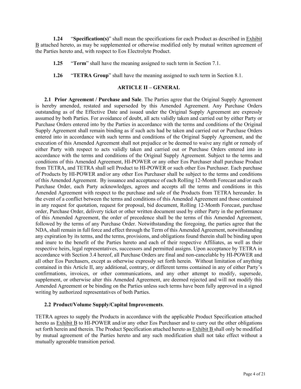 Page 4 of 21 1.24 “Specification(s)” shall mean the specifications for each Product as described in Exhibit B attached hereto, as may be supplemented or otherwise modified only by mutual written agreement of the Parties hereto and, with respect to Eos Electrolyte Product. 1.25 “Term” shall have the meaning assigned to such term in Section 7.1. 1.26 “TETRA Group” shall have the meaning assigned to such term in Section 8.1. ARTICLE II – GENERAL 2.1 Prior Agreement / Purchase and Sale. The Parties agree that the Original Supply Agreement is hereby amended, restated and superseded by this Amended Agreement. Any Purchase Orders outstanding as of the Effective Date and issued under the Original Supply Agreement are expressly assumed by both Parties. For avoidance of doubt, all acts validly taken and carried out by either Party or Purchase Orders entered into by the Parties in accordance with the terms and conditions of the Original Supply Agreement shall remain binding as if such acts had be taken and carried out or Purchase Orders entered into in accordance with such terms and conditions of the Original Supply Agreement, and the execution of this Amended Agreement shall not prejudice or be deemed to waive any right or remedy of either Party with respect to acts validly taken and carried out or Purchase Orders entered into in accordance with the terms and conditions of the Original Supply Agreement. Subject to the terms and conditions of this Amended Agreement, HI-POWER or any other Eos Purchaser shall purchase Product from TETRA, and TETRA shall sell Product to HI-POWER or such other Eos Purchaser. Each purchase of Products by HI-POWER and/or any other Eos Purchaser shall be subject to the terms and conditions of this Amended Agreement. By issuance and acceptance of each Rolling 12-Month Forecast and/or each Purchase Order, each Party acknowledges, agrees and accepts all the terms and conditions in this Amended Agreement with respect to the purchase and sale of the Products from TETRA hereunder. In the event of a conflict between the terms and conditions of this Amended Agreement and those contained in any request for quotation, request for proposal, bid document, Rolling 12-Month Forecast, purchase order, Purchase Order, delivery ticket or other written document used by either Party in the performance of this Amended Agreement, the order of precedence shall be the terms of this Amended Agreement, followed by the terms of any Purchase Order. Notwithstanding the foregoing, the parties agree that the NDA, shall remain in full force and effect through the Term of this Amended Agreement, notwithstanding any expiration by its terms, and the terms, provisions, and obligations found therein shall be binding upon and inure to the benefit of the Parties hereto and each of their respective Affiliates, as well as their respective heirs, legal representatives, successors and permitted assigns. Upon acceptance by TETRA in accordance with Section 3.4 hereof, all Purchase Orders are final and non-cancelable by HI-POWER and all other Eos Purchasers, except as otherwise expressly set forth herein. Without limitation of anything contained in this Article II, any additional, contrary, or different terms contained in any of either Party’s confirmations, invoices, or other communications, and any other attempt to modify, supersede, supplement, or otherwise alter this Amended Agreement, are deemed rejected and will not modify this Amended Agreement or be binding on the Parties unless such terms have been fully approved in a signed writing by authorized representatives of both Parties. 2.2 Product/Volume Supply/Capital Improvements. TETRA agrees to supply the Products in accordance with the applicable Product Specification attached hereto as Exhibit B to HI-POWER and/or any other Eos Purchaser and to carry out the other obligations set forth herein and therein. The Product Specification attached hereto as Exhibit B shall only be modified by mutual agreement of the Parties hereto and any such modification shall not take effect without a mutually agreeable transition period.