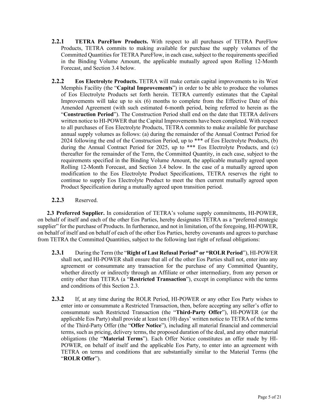 Page 5 of 21 2.2.1 TETRA PureFlow Products. With respect to all purchases of TETRA PureFlow Products, TETRA commits to making available for purchase the supply volumes of the Committed Quantities for TETRA PureFlow, in each case, subject to the requirements specified in the Binding Volume Amount, the applicable mutually agreed upon Rolling 12-Month Forecast, and Section 3.4 below. 2.2.2 Eos Electrolyte Products. TETRA will make certain capital improvements to its West Memphis Facility (the “Capital Improvements”) in order to be able to produce the volumes of Eos Electrolyte Products set forth herein. TETRA currently estimates that the Capital Improvements will take up to six (6) months to complete from the Effective Date of this Amended Agreement (with such estimated 6-month period, being referred to herein as the “Construction Period”). The Construction Period shall end on the date that TETRA delivers written notice to HI-POWER that the Capital Improvements have been completed. With respect to all purchases of Eos Electrolyte Products, TETRA commits to make available for purchase annual supply volumes as follows: (a) during the remainder of the Annual Contract Period for 2024 following the end of the Construction Period, up to *** of Eos Electrolyte Products, (b) during the Annual Contract Period for 2025, up to *** Eos Electrolyte Products, and (c) thereafter for the remainder of the Term, the Committed Quantity, in each case, subject to the requirements specified in the Binding Volume Amount, the applicable mutually agreed upon Rolling 12-Month Forecast, and Section 3.4 below. In the case of a mutually agreed upon modification to the Eos Electrolyte Product Specifications, TETRA reserves the right to continue to supply Eos Electrolyte Product to meet the then current mutually agreed upon Product Specification during a mutually agreed upon transition period. 2.2.3 Reserved. 2.3 Preferred Supplier. In consideration of TETRA’s volume supply commitments, HI-POWER, on behalf of itself and each of the other Eos Parties, hereby designates TETRA as a “preferred strategic supplier” for the purchase of Products. In furtherance, and not in limitation, of the foregoing, HI-POWER, on behalf of itself and on behalf of each of the other Eos Parties, hereby covenants and agrees to purchase from TETRA the Committed Quantities, subject to the following last right of refusal obligations: 2.3.1 During the Term (the “Right of Last Refusal Period” or “ROLR Period”), HI-POWER shall not, and HI-POWER shall ensure that all of the other Eos Parties shall not, enter into any agreement or consummate any transaction for the purchase of any Committed Quantity, whether directly or indirectly through an Affiliate or other intermediary, from any person or entity other than TETRA (a “Restricted Transaction”), except in compliance with the terms and conditions of this Section 2.3. 2.3.2 If, at any time during the ROLR Period, HI-POWER or any other Eos Party wishes to enter into or consummate a Restricted Transaction, then, before accepting any seller’s offer to consummate such Restricted Transaction (the “Third-Party Offer”), HI-POWER (or the applicable Eos Party) shall provide at least ten (10) days’ written notice to TETRA of the terms of the Third-Party Offer (the “Offer Notice”), including all material financial and commercial terms, such as pricing, delivery terms, the proposed duration of the deal, and any other material obligations (the “Material Terms”). Each Offer Notice constitutes an offer made by HI- POWER, on behalf of itself and the applicable Eos Party, to enter into an agreement with TETRA on terms and conditions that are substantially similar to the Material Terms (the “ROLR Offer”).