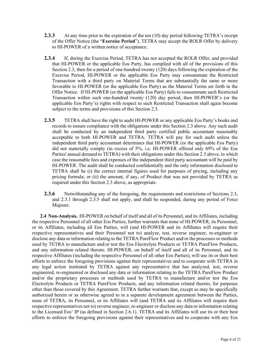 Page 6 of 21 2.3.3 At any time prior to the expiration of the ten (10) day period following TETRA’s receipt of the Offer Notice (the “Exercise Period”), TETRA may accept the ROLR Offer by delivery to HI-POWER of a written notice of acceptance. 2.3.4 If, during the Exercise Period, TETRA has not accepted the ROLR Offer, and provided that HI-POWER or the applicable Eos Party, has complied with all of the provisions of this Section 2.3, then for a period of one-hundred twenty (120) days following the expiration of the Exercise Period, HI-POWER or the applicable Eos Party may consummate the Restricted Transaction with a third party on Material Terms that are substantially the same or more favorable to HI-POWER (or the applicable Eos Party) as the Material Terms set forth in the Offer Notice. If HI-POWER (or the applicable Eos Party) fails to consummate such Restricted Transaction within such one-hundred twenty (120) day period, then HI-POWER’s (or the applicable Eos Party’s) rights with respect to such Restricted Transaction shall again become subject to the terms and provisions of this Section 2.3. 2.3.5 TETRA shall have the right to audit HI-POWER or any applicable Eos Party’s books and records to ensure compliance with the obligations under this Section 2.3 above. Any such audit shall be conducted by an independent third party certified public accountant reasonably acceptable to both HI-POWER and TETRA. TETRA will pay for such audit unless the independent third party accountant determines that HI-POWER (or the applicable Eos Party) did not materially comply (in excess of 5%, i.e. HI-POWER offered only 69% of the Eos Parties' annual demand to TETRA) with their obligations under this Section 2.3 above, in which case the reasonable fees and expenses of the independent third party accountant will be paid by HI-POWER. The audit shall be conducted confidentially and the only information disclosed to TETRA shall be (i) the correct internal figures used for purposes of pricing, including any pricing formula; or (ii) the amount, if any, of Product that was not provided by TETRA as required under this Section 2.3 above, as appropriate. 2.3.6 Notwithstanding any of the foregoing, the requirements and restrictions of Sections 2.3, and 2.3.1 through 2.3.5 shall not apply, and shall be suspended, during any period of Force Majeure. 2.4 Non-Analysis. HI-POWER on behalf of itself and all of its Personnel, and its Affiliates, including the respective Personnel of all other Eos Parties, further warrants that none of HI-POWER, its Personnel, or its Affiliates, including all Eos Parties, will (and HI-POWER and its Affiliates will require their respective representatives and their Personnel not to) analyze, test, reverse engineer, re-engineer or disclose any data or information relating to the TETRA PureFlow Product and/or the processes or methods used by TETRA to manufacture and/or test the Eos Electrolyte Products or TETRA PureFlow Products, and any information related thereto. HI-POWER, on behalf of itself and all of its Personnel, and its respective Affiliates (including the respective Personnel of all other Eos Parties), will use its or their best efforts to enforce the foregoing provisions against their representatives and to cooperate with TETRA in any legal action instituted by TETRA against any representative that has analyzed, test, reverse engineered, re-engineered or disclosed any data or information relating to the TETRA PureFlow Product and/or the proprietary processes or methods used by TETRA to manufacture and/or test the Eos Electrolyte Products or TETRA PureFlow Products, and any information related thereto, for purposes other than those covered by this Agreement. TETRA further warrants that, except as may be specifically authorized herein or as otherwise agreed to in a separate development agreement between the Parties, none of TETRA, its Personnel, or its Affiliates will (and TETRA and its Affiliates will require their respective representatives not to) reverse engineer, re-engineer or disclose any data or information relating to the Licensed Eos’ IP (as defined in Section 2.6.1). TETRA and its Affiliates will use its or their best efforts to enforce the foregoing provisions against their representatives and to cooperate with any Eos