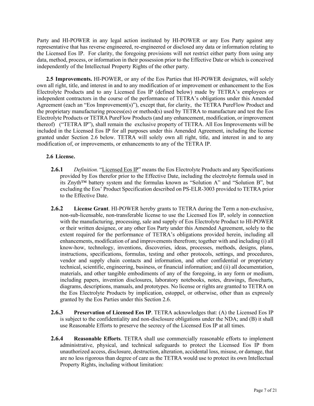 Page 7 of 21 Party and HI-POWER in any legal action instituted by HI-POWER or any Eos Party against any representative that has reverse engineered, re-engineered or disclosed any data or information relating to the Licensed Eos IP. For clarity, the foregoing provisions will not restrict either party from using any data, method, process, or information in their possession prior to the Effective Date or which is conceived independently of the Intellectual Property Rights of the other party. 2.5 Improvements. HI-POWER, or any of the Eos Parties that HI-POWER designates, will solely own all right, title, and interest in and to any modification of or improvement or enhancement to the Eos Electrolyte Products and to any Licensed Eos IP (defined below) made by TETRA’s employees or independent contractors in the course of the performance of TETRA’s obligations under this Amended Agreement (each an “Eos Improvement(s)”), except that, for clarity, the TETRA PureFlow Product and the proprietary manufacturing process(es) or method(s) used by TETRA to manufacture and test the Eos Electrolyte Products or TETRA PureFlow Products (and any enhancement, modification, or improvement thereof) (“TETRA IP”), shall remain the exclusive property of TETRA. All Eos Improvements will be included in the Licensed Eos IP for all purposes under this Amended Agreement, including the license granted under Section 2.6 below. TETRA will solely own all right, title, and interest in and to any modification of, or improvements, or enhancements to any of the TETRA IP. 2.6 License. 2.6.1 Definition. “Licensed Eos IP” means the Eos Electrolyte Products and any Specifications provided by Eos therefor prior to the Effective Date, including the electrolyte formula used in its Znyth™ battery system and the formulas known as “Solution A” and “Solution B”, but excluding the Eos’ Product Specification described on PS-ELR-3003 provided to TETRA prior to the Effective Date. 2.6.2 License Grant. HI-POWER hereby grants to TETRA during the Term a non-exclusive, non-sub-licensable, non-transferable license to use the Licensed Eos IP, solely in connection with the manufacturing, processing, sale and supply of Eos Electrolyte Product to HI-POWER or their written designee, or any other Eos Party under this Amended Agreement, solely to the extent required for the performance of TETRA’s obligations provided herein, including all enhancements, modification of and improvements therefrom; together with and including (i) all know-how, technology, inventions, discoveries, ideas, processes, methods, designs, plans, instructions, specifications, formulas, testing and other protocols, settings, and procedures, vendor and supply chain contacts and information, and other confidential or proprietary technical, scientific, engineering, business, or financial information; and (ii) all documentation, materials, and other tangible embodiments of any of the foregoing, in any form or medium, including papers, invention disclosures, laboratory notebooks, notes, drawings, flowcharts, diagrams, descriptions, manuals, and prototypes. No license or rights are granted to TETRA on the Eos Electrolyte Products by implication, estoppel, or otherwise, other than as expressly granted by the Eos Parties under this Section 2.6. 2.6.3 Preservation of Licensed Eos IP. TETRA acknowledges that: (A) the Licensed Eos IP is subject to the confidentiality and non-disclosure obligations under the NDA; and (B) it shall use Reasonable Efforts to preserve the secrecy of the Licensed Eos IP at all times. 2.6.4 Reasonable Efforts. TETRA shall use commercially reasonable efforts to implement administrative, physical, and technical safeguards to protect the Licensed Eos IP from unauthorized access, disclosure, destruction, alteration, accidental loss, misuse, or damage, that are no less rigorous than degree of care as the TETRA would use to protect its own Intellectual Property Rights, including without limitation: