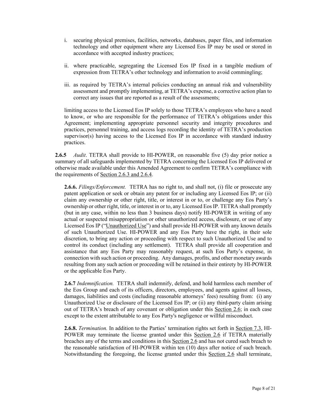 Page 8 of 21 i. securing physical premises, facilities, networks, databases, paper files, and information technology and other equipment where any Licensed Eos IP may be used or stored in accordance with accepted industry practices; ii. where practicable, segregating the Licensed Eos IP fixed in a tangible medium of expression from TETRA’s other technology and information to avoid commingling; iii. as required by TETRA’s internal policies conducting an annual risk and vulnerability assessment and promptly implementing, at TETRA’s expense, a corrective action plan to correct any issues that are reported as a result of the assessments; limiting access to the Licensed Eos IP solely to those TETRA’s employees who have a need to know, or who are responsible for the performance of TETRA’s obligations under this Agreement; implementing appropriate personnel security and integrity procedures and practices, personnel training, and access logs recording the identity of TETRA’s production supervisor(s) having access to the Licensed Eos IP in accordance with standard industry practices. 2.6.5 Audit. TETRA shall provide to HI-POWER, on reasonable five (5) day prior notice a summary of all safeguards implemented by TETRA concerning the Licensed Eos IP delivered or otherwise made available under this Amended Agreement to confirm TETRA’s compliance with the requirements of Section 2.6.3 and 2.6.4. 2.6.6. Filings/Enforcement. TETRA has no right to, and shall not, (i) file or prosecute any patent application or seek or obtain any patent for or including any Licensed Eos IP; or (ii) claim any ownership or other right, title, or interest in or to, or challenge any Eos Party’s ownership or other right, title, or interest in or to, any Licensed Eos IP. TETRA shall promptly (but in any case, within no less than 3 business days) notify HI-POWER in writing of any actual or suspected misappropriation or other unauthorized access, disclosure, or use of any Licensed Eos IP (“Unauthorized Use”) and shall provide HI-POWER with any known details of such Unauthorized Use. HI-POWER and any Eos Party have the right, in their sole discretion, to bring any action or proceeding with respect to such Unauthorized Use and to control its conduct (including any settlement). TETRA shall provide all cooperation and assistance that any Eos Party may reasonably request, at such Eos Party’s expense, in connection with such action or proceeding. Any damages, profits, and other monetary awards resulting from any such action or proceeding will be retained in their entirety by HI-POWER or the applicable Eos Party. 2.6.7 Indemnification. TETRA shall indemnify, defend, and hold harmless each member of the Eos Group and each of its officers, directors, employees, and agents against all losses, damages, liabilities and costs (including reasonable attorneys’ fees) resulting from: (i) any Unauthorized Use or disclosure of the Licensed Eos IP; or (ii) any third-party claim arising out of TETRA’s breach of any covenant or obligation under this Section 2.6; in each case except to the extent attributable to any Eos Party's negligence or willful misconduct. 2.6.8. Termination. In addition to the Parties’ termination rights set forth in Section 7.3, HI- POWER may terminate the license granted under this Section 2.6 if TETRA materially breaches any of the terms and conditions in this Section 2.6 and has not cured such breach to the reasonable satisfaction of HI-POWER within ten (10) days after notice of such breach. Notwithstanding the foregoing, the license granted under this Section 2.6 shall terminate,