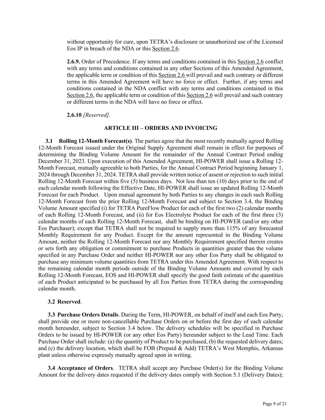 Page 9 of 21 without opportunity for cure, upon TETRA’s disclosure or unauthorized use of the Licensed Eos IP in breach of the NDA or this Section 2.6. 2.6.9. Order of Precedence. If any terms and conditions contained in this Section 2.6 conflict with any terms and conditions contained in any other Sections of this Amended Agreement, the applicable term or condition of this Section 2.6 will prevail and such contrary or different terms in this Amended Agreement will have no force or effect. Further, if any terms and conditions contained in the NDA conflict with any terms and conditions contained in this Section 2.6, the applicable term or condition of this Section 2.6 will prevail and such contrary or different terms in the NDA will have no force or effect. 2.6.10 [Reserved]. ARTICLE III – ORDERS AND INVOICING 3.1 Rolling 12-Month Forecast(s). The parties agree that the most recently mutually agreed Rolling 12-Month Forecast issued under the Original Supply Agreement shall remain in effect for purposes of determining the Binding Volume Amount for the remainder of the Annual Contract Period ending December 31, 2023. Upon execution of this Amended Agreement, HI-POWER shall issue a Rolling 12- Month Forecast, mutually agreeable to both Parties, for the Annual Contract Period beginning January 1, 2024 through December 31, 2024. TETRA shall provide written notice of assent or rejection to such initial Rolling 12-Month Forecast within five (5) business days. Not less than ten (10) days prior to the end of each calendar month following the Effective Date, HI-POWER shall issue an updated Rolling 12-Month Forecast for each Product. Upon mutual agreement by both Parties to any changes in each such Rolling 12-Month Forecast from the prior Rolling 12-Month Forecast and subject to Section 3.4, the Binding Volume Amount specified (i) for TETRA PureFlow Product for each of the first two (2) calendar months of each Rolling 12-Month Forecast, and (ii) for Eos Electrolyte Product for each of the first three (3) calendar months of each Rolling 12-Month Forecast, shall be binding on HI-POWER (and/or any other Eos Purchaser); except that TETRA shall not be required to supply more than 115% of any forecasted Monthly Requirement for any Product. Except for the amount represented in the Binding Volume Amount, neither the Rolling 12-Month Forecast nor any Monthly Requirement specified therein creates or sets forth any obligation or commitment to purchase Products in quantities greater than the volume specified in any Purchase Order and neither HI-POWER nor any other Eos Party shall be obligated to purchase any minimum volume quantities from TETRA under this Amended Agreement. With respect to the remaining calendar month periods outside of the Binding Volume Amounts and covered by each Rolling 12-Month Forecast, EOS and HI-POWER shall specify the good faith estimate of the quantities of each Product anticipated to be purchased by all Eos Parties from TETRA during the corresponding calendar month. 3.2 Reserved. 3.3 Purchase Orders Details. During the Term, HI-POWER, on behalf of itself and each Eos Party, shall provide one or more non-cancellable Purchase Orders on or before the first day of each calendar month hereunder, subject to Section 3.4 below. The delivery schedules will be specified in Purchase Orders to be issued by HI-POWER (or any other Eos Party) hereunder subject to the Lead Time. Each Purchase Order shall include: (a) the quantity of Product to be purchased, (b) the requested delivery dates; and (c) the delivery location, which shall be FOB (Prepaid & Add) TETRA’s West Memphis, Arkansas plant unless otherwise expressly mutually agreed upon in writing. 3.4 Acceptance of Orders. TETRA shall accept any Purchase Order(s) for the Binding Volume Amount for the delivery dates requested if the delivery dates comply with Section 5.1 (Delivery Dates);