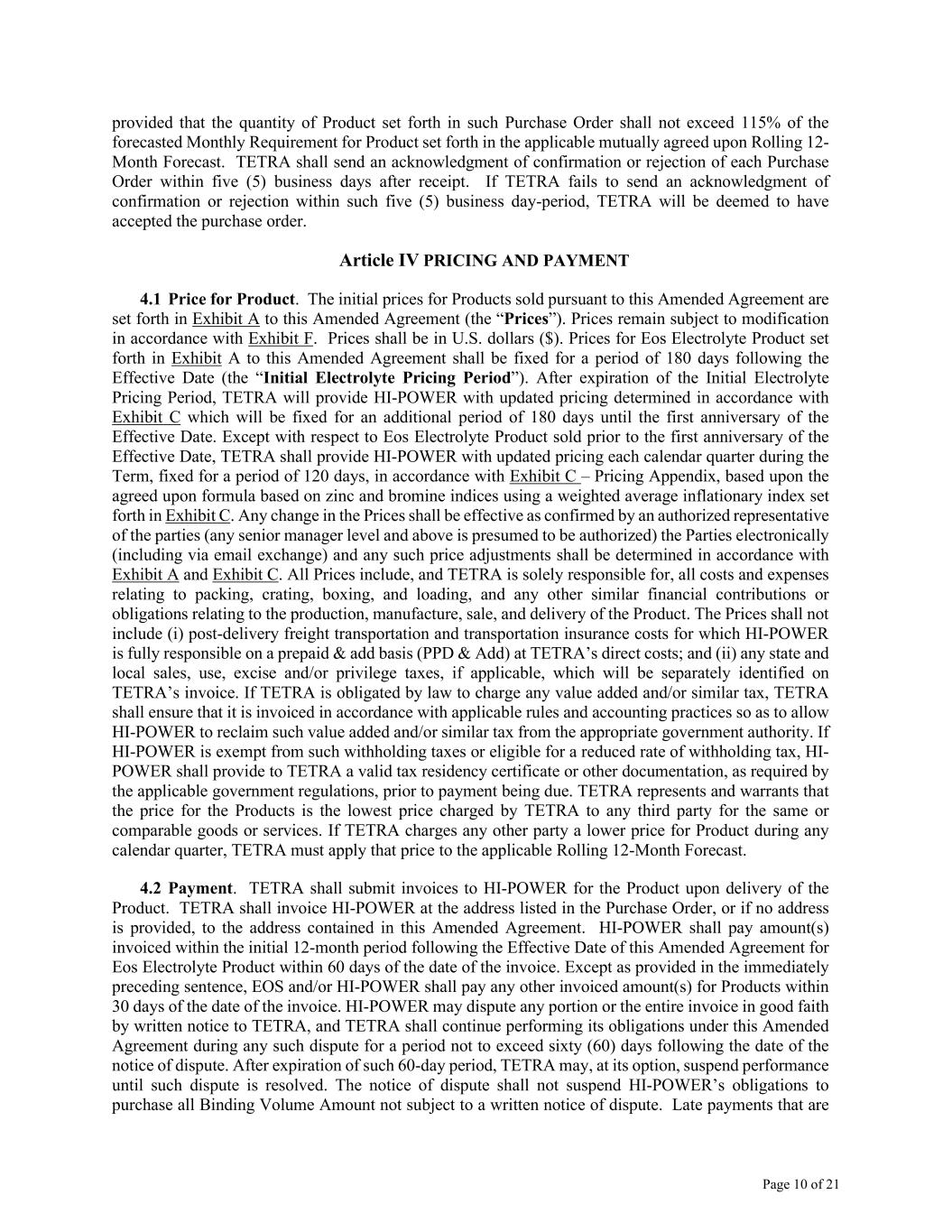 Page 10 of 21 provided that the quantity of Product set forth in such Purchase Order shall not exceed 115% of the forecasted Monthly Requirement for Product set forth in the applicable mutually agreed upon Rolling 12- Month Forecast. TETRA shall send an acknowledgment of confirmation or rejection of each Purchase Order within five (5) business days after receipt. If TETRA fails to send an acknowledgment of confirmation or rejection within such five (5) business day-period, TETRA will be deemed to have accepted the purchase order. Article IV PRICING AND PAYMENT 4.1 Price for Product. The initial prices for Products sold pursuant to this Amended Agreement are set forth in Exhibit A to this Amended Agreement (the “Prices”). Prices remain subject to modification in accordance with Exhibit F. Prices shall be in U.S. dollars ($). Prices for Eos Electrolyte Product set forth in Exhibit A to this Amended Agreement shall be fixed for a period of 180 days following the Effective Date (the “Initial Electrolyte Pricing Period”). After expiration of the Initial Electrolyte Pricing Period, TETRA will provide HI-POWER with updated pricing determined in accordance with Exhibit C which will be fixed for an additional period of 180 days until the first anniversary of the Effective Date. Except with respect to Eos Electrolyte Product sold prior to the first anniversary of the Effective Date, TETRA shall provide HI-POWER with updated pricing each calendar quarter during the Term, fixed for a period of 120 days, in accordance with Exhibit C – Pricing Appendix, based upon the agreed upon formula based on zinc and bromine indices using a weighted average inflationary index set forth in Exhibit C. Any change in the Prices shall be effective as confirmed by an authorized representative of the parties (any senior manager level and above is presumed to be authorized) the Parties electronically (including via email exchange) and any such price adjustments shall be determined in accordance with Exhibit A and Exhibit C. All Prices include, and TETRA is solely responsible for, all costs and expenses relating to packing, crating, boxing, and loading, and any other similar financial contributions or obligations relating to the production, manufacture, sale, and delivery of the Product. The Prices shall not include (i) post-delivery freight transportation and transportation insurance costs for which HI-POWER is fully responsible on a prepaid & add basis (PPD & Add) at TETRA’s direct costs; and (ii) any state and local sales, use, excise and/or privilege taxes, if applicable, which will be separately identified on TETRA’s invoice. If TETRA is obligated by law to charge any value added and/or similar tax, TETRA shall ensure that it is invoiced in accordance with applicable rules and accounting practices so as to allow HI-POWER to reclaim such value added and/or similar tax from the appropriate government authority. If HI-POWER is exempt from such withholding taxes or eligible for a reduced rate of withholding tax, HI- POWER shall provide to TETRA a valid tax residency certificate or other documentation, as required by the applicable government regulations, prior to payment being due. TETRA represents and warrants that the price for the Products is the lowest price charged by TETRA to any third party for the same or comparable goods or services. If TETRA charges any other party a lower price for Product during any calendar quarter, TETRA must apply that price to the applicable Rolling 12-Month Forecast. 4.2 Payment. TETRA shall submit invoices to HI-POWER for the Product upon delivery of the Product. TETRA shall invoice HI-POWER at the address listed in the Purchase Order, or if no address is provided, to the address contained in this Amended Agreement. HI-POWER shall pay amount(s) invoiced within the initial 12-month period following the Effective Date of this Amended Agreement for Eos Electrolyte Product within 60 days of the date of the invoice. Except as provided in the immediately preceding sentence, EOS and/or HI-POWER shall pay any other invoiced amount(s) for Products within 30 days of the date of the invoice. HI-POWER may dispute any portion or the entire invoice in good faith by written notice to TETRA, and TETRA shall continue performing its obligations under this Amended Agreement during any such dispute for a period not to exceed sixty (60) days following the date of the notice of dispute. After expiration of such 60-day period, TETRA may, at its option, suspend performance until such dispute is resolved. The notice of dispute shall not suspend HI-POWER’s obligations to purchase all Binding Volume Amount not subject to a written notice of dispute. Late payments that are