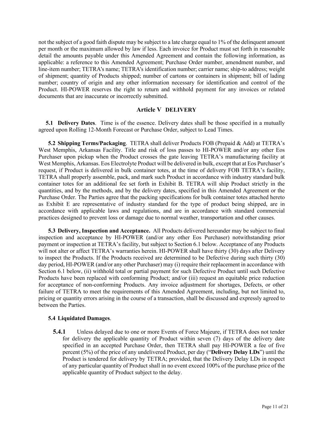Page 11 of 21 not the subject of a good faith dispute may be subject to a late charge equal to 1% of the delinquent amount per month or the maximum allowed by law if less. Each invoice for Product must set forth in reasonable detail the amounts payable under this Amended Agreement and contain the following information, as applicable: a reference to this Amended Agreement; Purchase Order number, amendment number, and line-item number; TETRA's name; TETRA's identification number; carrier name; ship-to address; weight of shipment; quantity of Products shipped; number of cartons or containers in shipment; bill of lading number; country of origin and any other information necessary for identification and control of the Product. HI-POWER reserves the right to return and withhold payment for any invoices or related documents that are inaccurate or incorrectly submitted. Article V DELIVERY 5.1 Delivery Dates. Time is of the essence. Delivery dates shall be those specified in a mutually agreed upon Rolling 12-Month Forecast or Purchase Order, subject to Lead Times. 5.2 Shipping Terms/Packaging. TETRA shall deliver Products FOB (Prepaid & Add) at TETRA’s West Memphis, Arkansas Facility. Title and risk of loss passes to HI-POWER and/or any other Eos Purchaser upon pickup when the Product crosses the gate leaving TETRA’s manufacturing facility at West Memphis, Arkansas. Eos Electrolyte Product will be delivered in bulk, except that at Eos Purchaser’s request, if Product is delivered in bulk container totes, at the time of delivery FOB TETRA’s facility, TETRA shall properly assemble, pack, and mark such Product in accordance with industry standard bulk container totes for an additional fee set forth in Exhibit B. TETRA will ship Product strictly in the quantities, and by the methods, and by the delivery dates, specified in this Amended Agreement or the Purchase Order. The Parties agree that the packing specifications for bulk container totes attached hereto as Exhibit E are representative of industry standard for the type of product being shipped, are in accordance with applicable laws and regulations, and are in accordance with standard commercial practices designed to prevent loss or damage due to normal weather, transportation and other causes. 5.3 Delivery, Inspection and Acceptance. All Products delivered hereunder may be subject to final inspection and acceptance by HI-POWER (and/or any other Eos Purchaser) notwithstanding prior payment or inspection at TETRA’s facility, but subject to Section 6.1 below. Acceptance of any Products will not alter or affect TETRA’s warranties herein. HI-POWER shall have thirty (30) days after Delivery to inspect the Products. If the Products received are determined to be Defective during such thirty (30) day period, HI-POWER (and/or any other Purchaser) may (i) require their replacement in accordance with Section 6.1 below, (ii) withhold total or partial payment for such Defective Product until such Defective Products have been replaced with conforming Product; and/or (iii) request an equitable price reduction for acceptance of non-conforming Products. Any invoice adjustment for shortages, Defects, or other failure of TETRA to meet the requirements of this Amended Agreement, including, but not limited to, pricing or quantity errors arising in the course of a transaction, shall be discussed and expressly agreed to between the Parties. 5.4 Liquidated Damages. 5.4.1 Unless delayed due to one or more Events of Force Majeure, if TETRA does not tender for delivery the applicable quantity of Product within seven (7) days of the delivery date specified in an accepted Purchase Order, then TETRA shall pay HI-POWER a fee of five percent (5%) of the price of any undelivered Product, per day (“Delivery Delay LDs”) until the Product is tendered for delivery by TETRA; provided, that the Delivery Delay LDs in respect of any particular quantity of Product shall in no event exceed 100% of the purchase price of the applicable quantity of Product subject to the delay.
