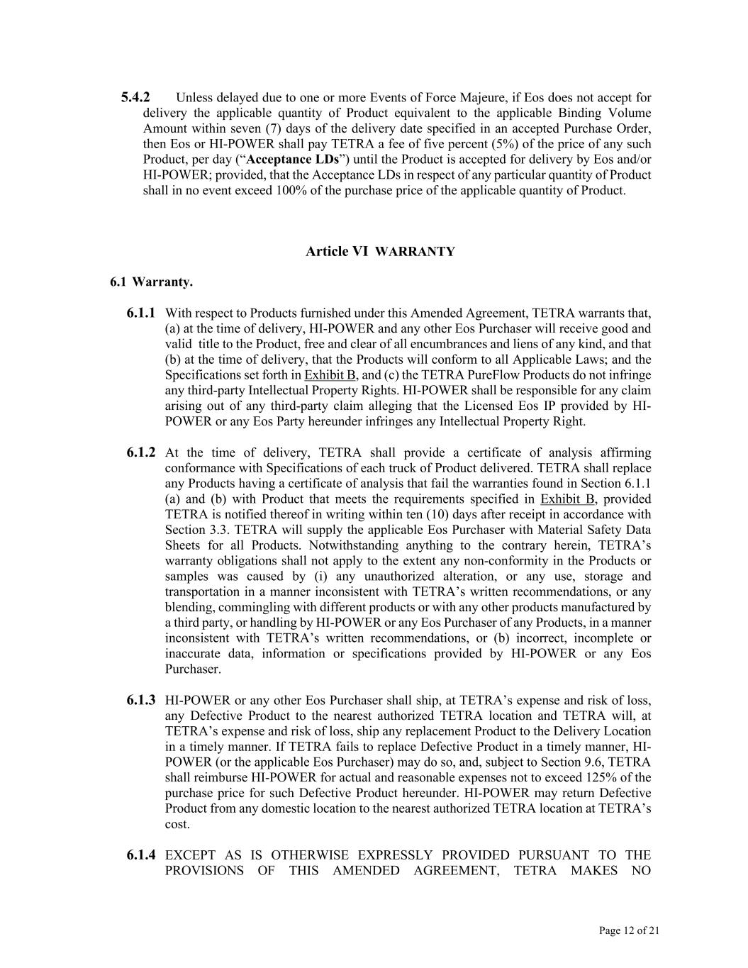 Page 12 of 21 5.4.2 Unless delayed due to one or more Events of Force Majeure, if Eos does not accept for delivery the applicable quantity of Product equivalent to the applicable Binding Volume Amount within seven (7) days of the delivery date specified in an accepted Purchase Order, then Eos or HI-POWER shall pay TETRA a fee of five percent (5%) of the price of any such Product, per day (“Acceptance LDs”) until the Product is accepted for delivery by Eos and/or HI-POWER; provided, that the Acceptance LDs in respect of any particular quantity of Product shall in no event exceed 100% of the purchase price of the applicable quantity of Product. Article VI WARRANTY 6.1 Warranty. 6.1.1 With respect to Products furnished under this Amended Agreement, TETRA warrants that, (a) at the time of delivery, HI-POWER and any other Eos Purchaser will receive good and valid title to the Product, free and clear of all encumbrances and liens of any kind, and that (b) at the time of delivery, that the Products will conform to all Applicable Laws; and the Specifications set forth in Exhibit B, and (c) the TETRA PureFlow Products do not infringe any third-party Intellectual Property Rights. HI-POWER shall be responsible for any claim arising out of any third-party claim alleging that the Licensed Eos IP provided by HI- POWER or any Eos Party hereunder infringes any Intellectual Property Right. 6.1.2 At the time of delivery, TETRA shall provide a certificate of analysis affirming conformance with Specifications of each truck of Product delivered. TETRA shall replace any Products having a certificate of analysis that fail the warranties found in Section 6.1.1 (a) and (b) with Product that meets the requirements specified in Exhibit B, provided TETRA is notified thereof in writing within ten (10) days after receipt in accordance with Section 3.3. TETRA will supply the applicable Eos Purchaser with Material Safety Data Sheets for all Products. Notwithstanding anything to the contrary herein, TETRA’s warranty obligations shall not apply to the extent any non-conformity in the Products or samples was caused by (i) any unauthorized alteration, or any use, storage and transportation in a manner inconsistent with TETRA’s written recommendations, or any blending, commingling with different products or with any other products manufactured by a third party, or handling by HI-POWER or any Eos Purchaser of any Products, in a manner inconsistent with TETRA’s written recommendations, or (b) incorrect, incomplete or inaccurate data, information or specifications provided by HI-POWER or any Eos Purchaser. 6.1.3 HI-POWER or any other Eos Purchaser shall ship, at TETRA’s expense and risk of loss, any Defective Product to the nearest authorized TETRA location and TETRA will, at TETRA’s expense and risk of loss, ship any replacement Product to the Delivery Location in a timely manner. If TETRA fails to replace Defective Product in a timely manner, HI- POWER (or the applicable Eos Purchaser) may do so, and, subject to Section 9.6, TETRA shall reimburse HI-POWER for actual and reasonable expenses not to exceed 125% of the purchase price for such Defective Product hereunder. HI-POWER may return Defective Product from any domestic location to the nearest authorized TETRA location at TETRA’s cost. 6.1.4 EXCEPT AS IS OTHERWISE EXPRESSLY PROVIDED PURSUANT TO THE PROVISIONS OF THIS AMENDED AGREEMENT, TETRA MAKES NO