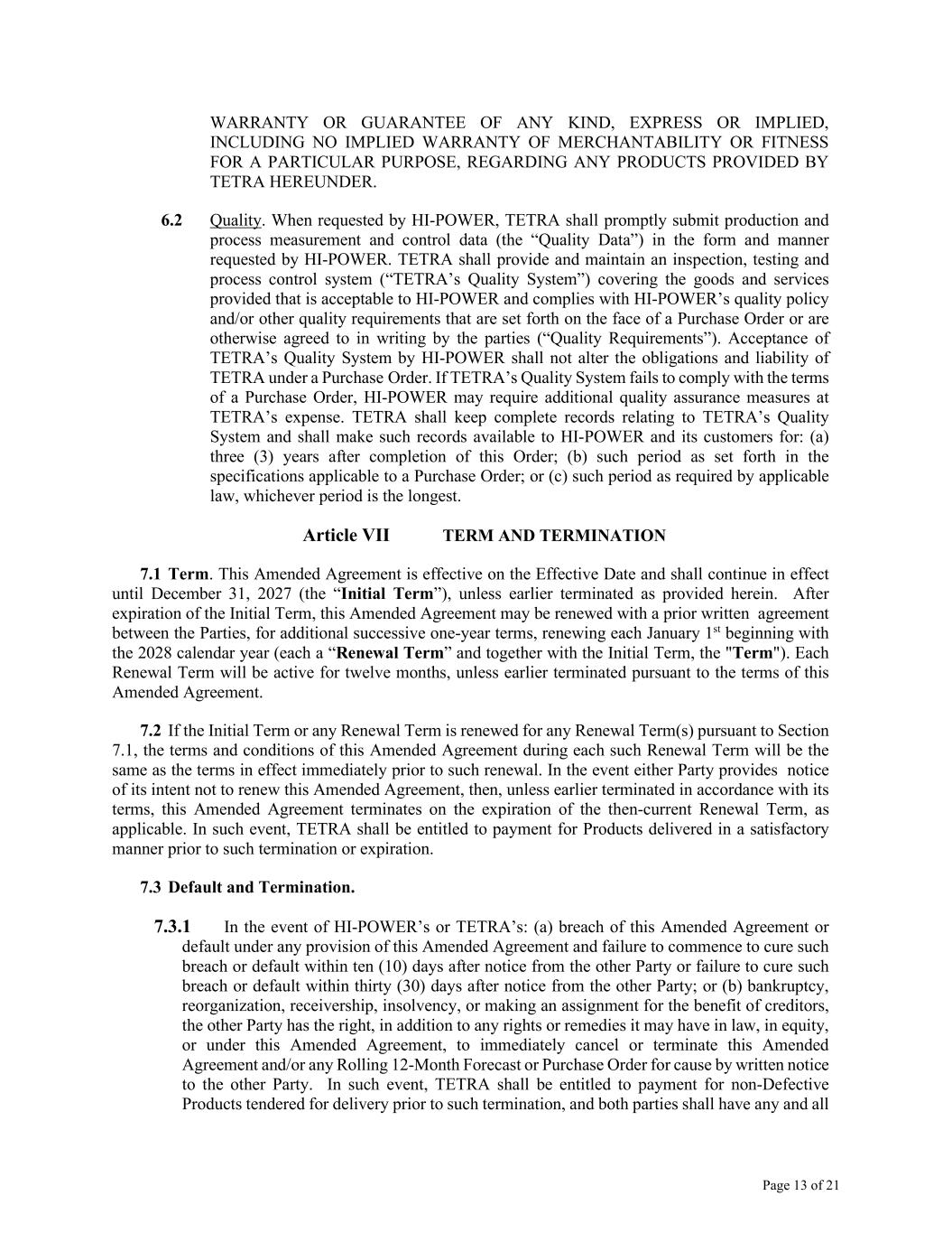 Page 13 of 21 WARRANTY OR GUARANTEE OF ANY KIND, EXPRESS OR IMPLIED, INCLUDING NO IMPLIED WARRANTY OF MERCHANTABILITY OR FITNESS FOR A PARTICULAR PURPOSE, REGARDING ANY PRODUCTS PROVIDED BY TETRA HEREUNDER. 6.2 Quality. When requested by HI-POWER, TETRA shall promptly submit production and process measurement and control data (the “Quality Data”) in the form and manner requested by HI-POWER. TETRA shall provide and maintain an inspection, testing and process control system (“TETRA’s Quality System”) covering the goods and services provided that is acceptable to HI-POWER and complies with HI-POWER’s quality policy and/or other quality requirements that are set forth on the face of a Purchase Order or are otherwise agreed to in writing by the parties (“Quality Requirements”). Acceptance of TETRA’s Quality System by HI-POWER shall not alter the obligations and liability of TETRA under a Purchase Order. If TETRA’s Quality System fails to comply with the terms of a Purchase Order, HI-POWER may require additional quality assurance measures at TETRA’s expense. TETRA shall keep complete records relating to TETRA’s Quality System and shall make such records available to HI-POWER and its customers for: (a) three (3) years after completion of this Order; (b) such period as set forth in the specifications applicable to a Purchase Order; or (c) such period as required by applicable law, whichever period is the longest. Article VII TERM AND TERMINATION 7.1 Term. This Amended Agreement is effective on the Effective Date and shall continue in effect until December 31, 2027 (the “Initial Term”), unless earlier terminated as provided herein. After expiration of the Initial Term, this Amended Agreement may be renewed with a prior written agreement between the Parties, for additional successive one-year terms, renewing each January 1st beginning with the 2028 calendar year (each a “Renewal Term” and together with the Initial Term, the "Term"). Each Renewal Term will be active for twelve months, unless earlier terminated pursuant to the terms of this Amended Agreement. 7.2 If the Initial Term or any Renewal Term is renewed for any Renewal Term(s) pursuant to Section 7.1, the terms and conditions of this Amended Agreement during each such Renewal Term will be the same as the terms in effect immediately prior to such renewal. In the event either Party provides notice of its intent not to renew this Amended Agreement, then, unless earlier terminated in accordance with its terms, this Amended Agreement terminates on the expiration of the then-current Renewal Term, as applicable. In such event, TETRA shall be entitled to payment for Products delivered in a satisfactory manner prior to such termination or expiration. 7.3 Default and Termination. 7.3.1 In the event of HI-POWER’s or TETRA’s: (a) breach of this Amended Agreement or default under any provision of this Amended Agreement and failure to commence to cure such breach or default within ten (10) days after notice from the other Party or failure to cure such breach or default within thirty (30) days after notice from the other Party; or (b) bankruptcy, reorganization, receivership, insolvency, or making an assignment for the benefit of creditors, the other Party has the right, in addition to any rights or remedies it may have in law, in equity, or under this Amended Agreement, to immediately cancel or terminate this Amended Agreement and/or any Rolling 12-Month Forecast or Purchase Order for cause by written notice to the other Party. In such event, TETRA shall be entitled to payment for non-Defective Products tendered for delivery prior to such termination, and both parties shall have any and all