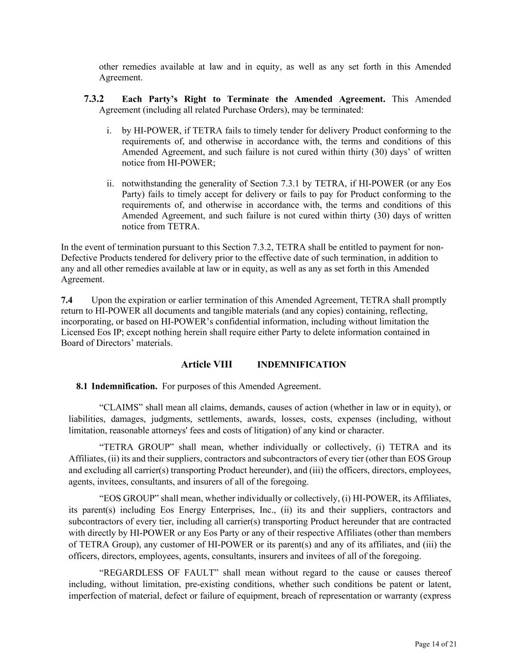 Page 14 of 21 other remedies available at law and in equity, as well as any set forth in this Amended Agreement. 7.3.2 Each Party’s Right to Terminate the Amended Agreement. This Amended Agreement (including all related Purchase Orders), may be terminated: i. by HI-POWER, if TETRA fails to timely tender for delivery Product conforming to the requirements of, and otherwise in accordance with, the terms and conditions of this Amended Agreement, and such failure is not cured within thirty (30) days’ of written notice from HI-POWER; ii. notwithstanding the generality of Section 7.3.1 by TETRA, if HI-POWER (or any Eos Party) fails to timely accept for delivery or fails to pay for Product conforming to the requirements of, and otherwise in accordance with, the terms and conditions of this Amended Agreement, and such failure is not cured within thirty (30) days of written notice from TETRA. In the event of termination pursuant to this Section 7.3.2, TETRA shall be entitled to payment for non- Defective Products tendered for delivery prior to the effective date of such termination, in addition to any and all other remedies available at law or in equity, as well as any as set forth in this Amended Agreement. 7.4 Upon the expiration or earlier termination of this Amended Agreement, TETRA shall promptly return to HI-POWER all documents and tangible materials (and any copies) containing, reflecting, incorporating, or based on HI-POWER’s confidential information, including without limitation the Licensed Eos IP; except nothing herein shall require either Party to delete information contained in Board of Directors’ materials. Article VIII INDEMNIFICATION 8.1 Indemnification. For purposes of this Amended Agreement. “CLAIMS” shall mean all claims, demands, causes of action (whether in law or in equity), or liabilities, damages, judgments, settlements, awards, losses, costs, expenses (including, without limitation, reasonable attorneys' fees and costs of litigation) of any kind or character. “TETRA GROUP” shall mean, whether individually or collectively, (i) TETRA and its Affiliates, (ii) its and their suppliers, contractors and subcontractors of every tier (other than EOS Group and excluding all carrier(s) transporting Product hereunder), and (iii) the officers, directors, employees, agents, invitees, consultants, and insurers of all of the foregoing. “EOS GROUP” shall mean, whether individually or collectively, (i) HI-POWER, its Affiliates, its parent(s) including Eos Energy Enterprises, Inc., (ii) its and their suppliers, contractors and subcontractors of every tier, including all carrier(s) transporting Product hereunder that are contracted with directly by HI-POWER or any Eos Party or any of their respective Affiliates (other than members of TETRA Group), any customer of HI-POWER or its parent(s) and any of its affiliates, and (iii) the officers, directors, employees, agents, consultants, insurers and invitees of all of the foregoing. “REGARDLESS OF FAULT” shall mean without regard to the cause or causes thereof including, without limitation, pre-existing conditions, whether such conditions be patent or latent, imperfection of material, defect or failure of equipment, breach of representation or warranty (express