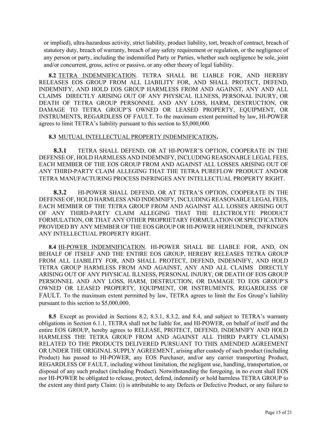 Page 15 of 21 or implied), ultra-hazardous activity, strict liability, product liability, tort, breach of contract, breach of statutory duty, breach of warranty, breach of any safety requirement or regulation, or the negligence of any person or party, including the indemnified Party or Parties, whether such negligence be sole, joint and/or concurrent, gross, active or passive, or any other theory of legal liability. 8.2 TETRA INDEMNIFICATION. TETRA SHALL BE LIABLE FOR, AND HEREBY RELEASES EOS GROUP FROM ALL LIABILITY FOR, AND SHALL PROTECT, DEFEND, INDEMNIFY, AND HOLD EOS GROUP HARMLESS FROM AND AGAINST, ANY AND ALL CLAIMS DIRECTLY ARISING OUT OF ANY PHYSICAL ILLNESS, PERSONAL INJURY, OR DEATH OF TETRA GROUP PERSONNEL AND ANY LOSS, HARM, DESTRUCTION, OR DAMAGE TO TETRA GROUP’S OWNED OR LEASED PROPERTY, EQUIPMENT, OR INSTRUMENTS, REGARDLESS OF FAULT. To the maximum extent permitted by law, HI-POWER agrees to limit TETRA’s liability pursuant to this section to $5,000,000. 8.3 MUTUAL INTELLECTUAL PROPERTY INDEMNIFICATION. 8.3.1 TETRA SHALL DEFEND, OR AT HI-POWER’S OPTION, COOPERATE IN THE DEFENSE OF, HOLD HARMLESS AND INDEMNIFY, INCLUDING REASONABLE LEGAL FEES, EACH MEMBER OF THE EOS GROUP FROM AND AGAINST ALL LOSSES ARISING OUT OF ANY THIRD-PARTY CLAIM ALLEGING THAT THE TETRA PUREFLOW PRODUCT AND/OR TETRA MANUFACTURING PROCESS INFRINGES ANY INTELLECTUAL PROPERTY RIGHT. 8.3.2 HI-POWER SHALL DEFEND, OR AT TETRA’S OPTION, COOPERATE IN THE DEFENSE OF, HOLD HARMLESS AND INDEMNIFY, INCLUDING REASONABLE LEGAL FEES, EACH MEMBER OF THE TETRA GROUP FROM AND AGAINST ALL LOSSES ARISING OUT OF ANY THIRD-PARTY CLAIM ALLEGING THAT THE ELECTROLYTE PRODUCT FORMULATION, OR THAT ANY OTHER PROPRIETARY FORMULATION OR SPECIFICATION PROVIDED BY ANY MEMBER OF THE EOS GROUP OR HI-POWER HEREUNDER, INFRINGES ANY INTELLECTUAL PROPERTY RIGHT. 8.4 HI-POWER INDEMNIFICATION. HI-POWER SHALL BE LIABLE FOR, AND, ON BEHALF OF ITSELF AND THE ENTIRE EOS GROUP, HEREBY RELEASES TETRA GROUP FROM ALL LIABILITY FOR, AND SHALL PROTECT, DEFEND, INDEMNIFY, AND HOLD TETRA GROUP HARMLESS FROM AND AGAINST, ANY AND ALL CLAIMS DIRECTLY ARISING OUT OF ANY PHYSICAL ILLNESS, PERSONAL INJURY, OR DEATH OF EOS GROUP PERSONNEL AND ANY LOSS, HARM, DESTRUCTION, OR DAMAGE TO EOS GROUP’S OWNED OR LEASED PROPERTY, EQUIPMENT, OR INSTRUMENTS, REGARDLESS OF FAULT. To the maximum extent permitted by law, TETRA agrees to limit the Eos Group’s liability pursuant to this section to $5,000,000. 8.5 Except as provided in Sections 8.2, 8.3.1, 8.3.2, and 8.4, and subject to TETRA’s warranty obligations in Section 6.1.1, TETRA shall not be liable for, and HI-POWER, on behalf of itself and the entire EOS GROUP, hereby agrees to RELEASE, PROTECT, DEFEND, INDEMNIFY AND HOLD HARMLESS THE TETRA GROUP FROM AND AGAINST ALL THIRD PARTY CLAIM(S) RELATED TO THE PRODUCTS DELIVERED PURSUANT TO THIS AMENDED AGREEMENT OR UNDER THE ORIGINAL SUPPLY AGREEMENT, arising after custody of such product (including Product) has passed to HI-POWER, any EOS Purchaser, and/or any carrier transporting Product, REGARDLESS OF FAULT, including without limitation, the negligent use, handling, transportation, or disposal of any such product (including Product). Notwithstanding the foregoing, in no event shall EOS nor HI-POWER be obligated to release, protect, defend, indemnify or hold harmless TETRA GROUP to the extent any third party Claim: (i) is attributable to any Defects or Defective Product, or any failure to
