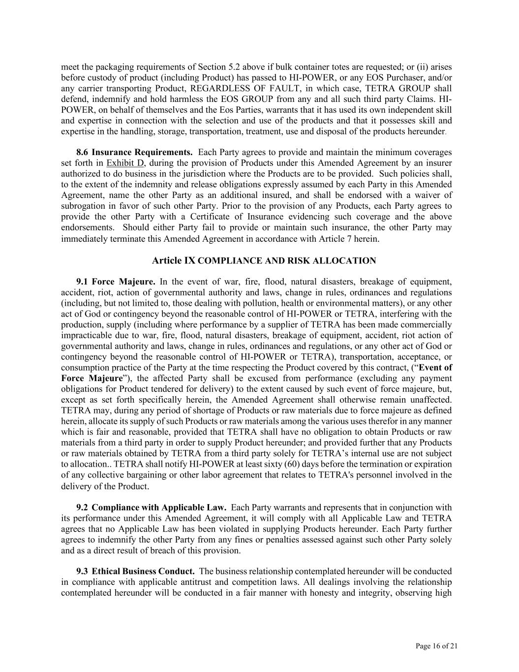 Page 16 of 21 meet the packaging requirements of Section 5.2 above if bulk container totes are requested; or (ii) arises before custody of product (including Product) has passed to HI-POWER, or any EOS Purchaser, and/or any carrier transporting Product, REGARDLESS OF FAULT, in which case, TETRA GROUP shall defend, indemnify and hold harmless the EOS GROUP from any and all such third party Claims. HI- POWER, on behalf of themselves and the Eos Parties, warrants that it has used its own independent skill and expertise in connection with the selection and use of the products and that it possesses skill and expertise in the handling, storage, transportation, treatment, use and disposal of the products hereunder. 8.6 Insurance Requirements. Each Party agrees to provide and maintain the minimum coverages set forth in Exhibit D, during the provision of Products under this Amended Agreement by an insurer authorized to do business in the jurisdiction where the Products are to be provided. Such policies shall, to the extent of the indemnity and release obligations expressly assumed by each Party in this Amended Agreement, name the other Party as an additional insured, and shall be endorsed with a waiver of subrogation in favor of such other Party. Prior to the provision of any Products, each Party agrees to provide the other Party with a Certificate of Insurance evidencing such coverage and the above endorsements. Should either Party fail to provide or maintain such insurance, the other Party may immediately terminate this Amended Agreement in accordance with Article 7 herein. Article IX COMPLIANCE AND RISK ALLOCATION 9.1 Force Majeure. In the event of war, fire, flood, natural disasters, breakage of equipment, accident, riot, action of governmental authority and laws, change in rules, ordinances and regulations (including, but not limited to, those dealing with pollution, health or environmental matters), or any other act of God or contingency beyond the reasonable control of HI-POWER or TETRA, interfering with the production, supply (including where performance by a supplier of TETRA has been made commercially impracticable due to war, fire, flood, natural disasters, breakage of equipment, accident, riot action of governmental authority and laws, change in rules, ordinances and regulations, or any other act of God or contingency beyond the reasonable control of HI-POWER or TETRA), transportation, acceptance, or consumption practice of the Party at the time respecting the Product covered by this contract, (“Event of Force Majeure”), the affected Party shall be excused from performance (excluding any payment obligations for Product tendered for delivery) to the extent caused by such event of force majeure, but, except as set forth specifically herein, the Amended Agreement shall otherwise remain unaffected. TETRA may, during any period of shortage of Products or raw materials due to force majeure as defined herein, allocate its supply of such Products or raw materials among the various uses therefor in any manner which is fair and reasonable, provided that TETRA shall have no obligation to obtain Products or raw materials from a third party in order to supply Product hereunder; and provided further that any Products or raw materials obtained by TETRA from a third party solely for TETRA’s internal use are not subject to allocation.. TETRA shall notify HI-POWER at least sixty (60) days before the termination or expiration of any collective bargaining or other labor agreement that relates to TETRA's personnel involved in the delivery of the Product. 9.2 Compliance with Applicable Law. Each Party warrants and represents that in conjunction with its performance under this Amended Agreement, it will comply with all Applicable Law and TETRA agrees that no Applicable Law has been violated in supplying Products hereunder. Each Party further agrees to indemnify the other Party from any fines or penalties assessed against such other Party solely and as a direct result of breach of this provision. 9.3 Ethical Business Conduct. The business relationship contemplated hereunder will be conducted in compliance with applicable antitrust and competition laws. All dealings involving the relationship contemplated hereunder will be conducted in a fair manner with honesty and integrity, observing high