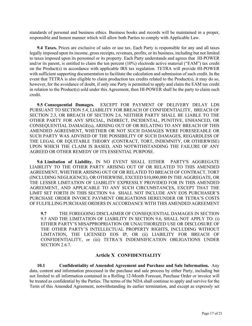 Page 17 of 21 standards of personal and business ethics. Business books and records will be maintained in a proper, responsible and honest manner which will allow both Parties to comply with Applicable Law. 9.4 Taxes. Prices are exclusive of sales or use tax. Each Party is responsible for any and all taxes legally imposed upon its income, gross receipts, revenues, profits, or its business, including but not limited to taxes imposed upon its personnel or its property. Each Party understands and agrees that HI-POWER and/or its parent, is entitled to claim the ten percent (10%) electrode active material (“EAM”) tax credit on the Product(s) in accordance with applicable IRS tax regulation. TETRA will provide HI-POWER with sufficient supporting documentation to facilitate the calculation and submission of such credit. In the event that TETRA is also eligible to claim production tax credits related to the Product(s), it may do so, however, for the avoidance of doubt, if only one Party is permitted to apply and claim the EAM tax credit in relation to the Product(s) sold under this Agreement, then HI-POWER shall be the party to claim such credit. 9.5 Consequential Damages. EXCEPT FOR PAYMENT OF DELIVERY DELAY LDS PURSUANT TO SECTION 5.4, LIABILITY FOR BREACH OF CONFIDENTIALITY, BREACH OF SECTION 2.3, OR BREACH OF SECTION 2.6, NEITHER PARTY SHALL BE LIABLE TO THE OTHER PARTY FOR ANY SPECIAL, INDIRECT, INCIDENTAL, PUNITIVE, ENHANCED, OR CONSEQUENTIAL DAMAGE(s), ARISING OUT OF OR RELATING TO ANY BREACH OF THIS AMENDED AGREEMENT, WHETHER OR NOT SUCH DAMAGES WERE FORESEEABLE OR SUCH PARTY WAS ADVISED OF THE POSSIBILITY OF SUCH DAMAGES, REGARDLESS OF THE LEGAL OR EQUITABLE THEORY (CONTRACT, TORT, INDEMNITY, OR OTHERWISE) UPON WHICH THE CLAIM IS BASED, AND NOTWITHSTANDING THE FAILURE OF ANY AGREED OR OTHER REMEDY OF ITS ESSENTIAL PURPOSE. 9.6 Limitation of Liability. IN NO EVENT SHALL EITHER PARTY'S AGGREGATE LIABILITY TO THE OTHER PARTY ARISING OUT OF OR RELATED TO THIS AMENDED AGREEMENT, WHETHER ARISING OUT OF OR RELATED TO BREACH OF CONTRACT, TORT (INCLUDING NEGLIGENCE), OR OTHERWISE, EXCEED $10,000,000 IN THE AGGREGATE, OR THE LESSER LIMITATION OF LIABILITY EXPRESSLY PROVIDED FOR IN THIS AMENDED AGREEMENT, AND APPLICABLE TO ANY SUCH CIRCUMSTANCES, EXCEPT THAT THE LIMIT SET FORTH IN THIS SECTION 9.6 SHALL NOT INCLUDE ANY EOS PURCHASER’S PURCHASE ORDER INVOICE PAYMENT OBLIGATIONS HEREUNDER OR TETRA’S COSTS OF FULFILLING PURCHASE ORDERS IN ACCORDANCE WITH THIS AMENDED AGREEMENT 9.7 THE FOREGOING DISCLAIMER OF CONSEQUENTIAL DAMAGES IN SECTION 9.5 AND THE LIMITATION OF LIABILITY IN SECTION 9.6, SHALL NOT APPLY TO: (i) EITHER PARTY’S MISAPPROPRIATION OR UNAUTHORIZED USE OR DISCLOSURE OF THE OTHER PARTY’S INTELLECTUAL PROPERTY RIGHTS, INCLUDING WITHOUT LIMTATION, THE LICENSED EOS IP, OR (ii) LIABILITY FOR BREACH OF CONFIDENTIALITY, or (iii) TETRA’S INDEMNIFICATION OBLIGATIONS UNDER SECTION 2.6.7. Article X CONFIDENTIALITY 10.1 Confidentiality of Amended Agreement and Purchase and Sale Information. Any data, content and information processed in the purchase and sale process by either Party, including but not limited to all information contained in a Rolling 12-Month Forecast, Purchase Order or invoice will be treated as confidential by the Parties. The terms of the NDA shall continue to apply and survive for the Term of this Amended Agreement, notwithstanding its earlier termination, and except as expressly set