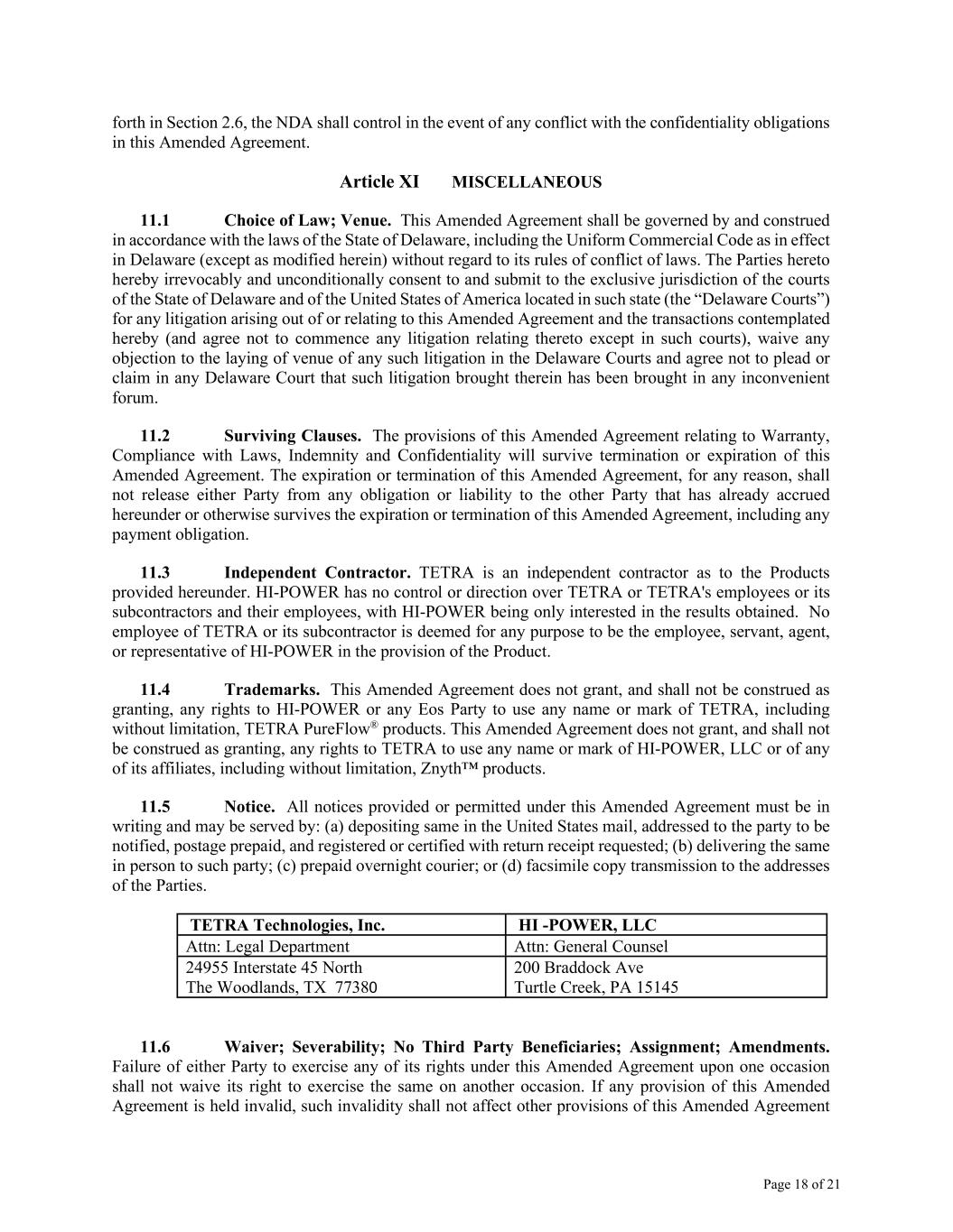 Page 18 of 21 forth in Section 2.6, the NDA shall control in the event of any conflict with the confidentiality obligations in this Amended Agreement. Article XI MISCELLANEOUS 11.1 Choice of Law; Venue. This Amended Agreement shall be governed by and construed in accordance with the laws of the State of Delaware, including the Uniform Commercial Code as in effect in Delaware (except as modified herein) without regard to its rules of conflict of laws. The Parties hereto hereby irrevocably and unconditionally consent to and submit to the exclusive jurisdiction of the courts of the State of Delaware and of the United States of America located in such state (the “Delaware Courts”) for any litigation arising out of or relating to this Amended Agreement and the transactions contemplated hereby (and agree not to commence any litigation relating thereto except in such courts), waive any objection to the laying of venue of any such litigation in the Delaware Courts and agree not to plead or claim in any Delaware Court that such litigation brought therein has been brought in any inconvenient forum. 11.2 Surviving Clauses. The provisions of this Amended Agreement relating to Warranty, Compliance with Laws, Indemnity and Confidentiality will survive termination or expiration of this Amended Agreement. The expiration or termination of this Amended Agreement, for any reason, shall not release either Party from any obligation or liability to the other Party that has already accrued hereunder or otherwise survives the expiration or termination of this Amended Agreement, including any payment obligation. 11.3 Independent Contractor. TETRA is an independent contractor as to the Products provided hereunder. HI-POWER has no control or direction over TETRA or TETRA's employees or its subcontractors and their employees, with HI-POWER being only interested in the results obtained. No employee of TETRA or its subcontractor is deemed for any purpose to be the employee, servant, agent, or representative of HI-POWER in the provision of the Product. 11.4 Trademarks. This Amended Agreement does not grant, and shall not be construed as granting, any rights to HI-POWER or any Eos Party to use any name or mark of TETRA, including without limitation, TETRA PureFlow® products. This Amended Agreement does not grant, and shall not be construed as granting, any rights to TETRA to use any name or mark of HI-POWER, LLC or of any of its affiliates, including without limitation, Znyth™ products. 11.5 Notice. All notices provided or permitted under this Amended Agreement must be in writing and may be served by: (a) depositing same in the United States mail, addressed to the party to be notified, postage prepaid, and registered or certified with return receipt requested; (b) delivering the same in person to such party; (c) prepaid overnight courier; or (d) facsimile copy transmission to the addresses of the Parties. TETRA Technologies, Inc. HI -POWER, LLC Attn: Legal Department Attn: General Counsel 24955 Interstate 45 North The Woodlands, TX 77380 200 Braddock Ave Turtle Creek, PA 15145 11.6 Waiver; Severability; No Third Party Beneficiaries; Assignment; Amendments. Failure of either Party to exercise any of its rights under this Amended Agreement upon one occasion shall not waive its right to exercise the same on another occasion. If any provision of this Amended Agreement is held invalid, such invalidity shall not affect other provisions of this Amended Agreement