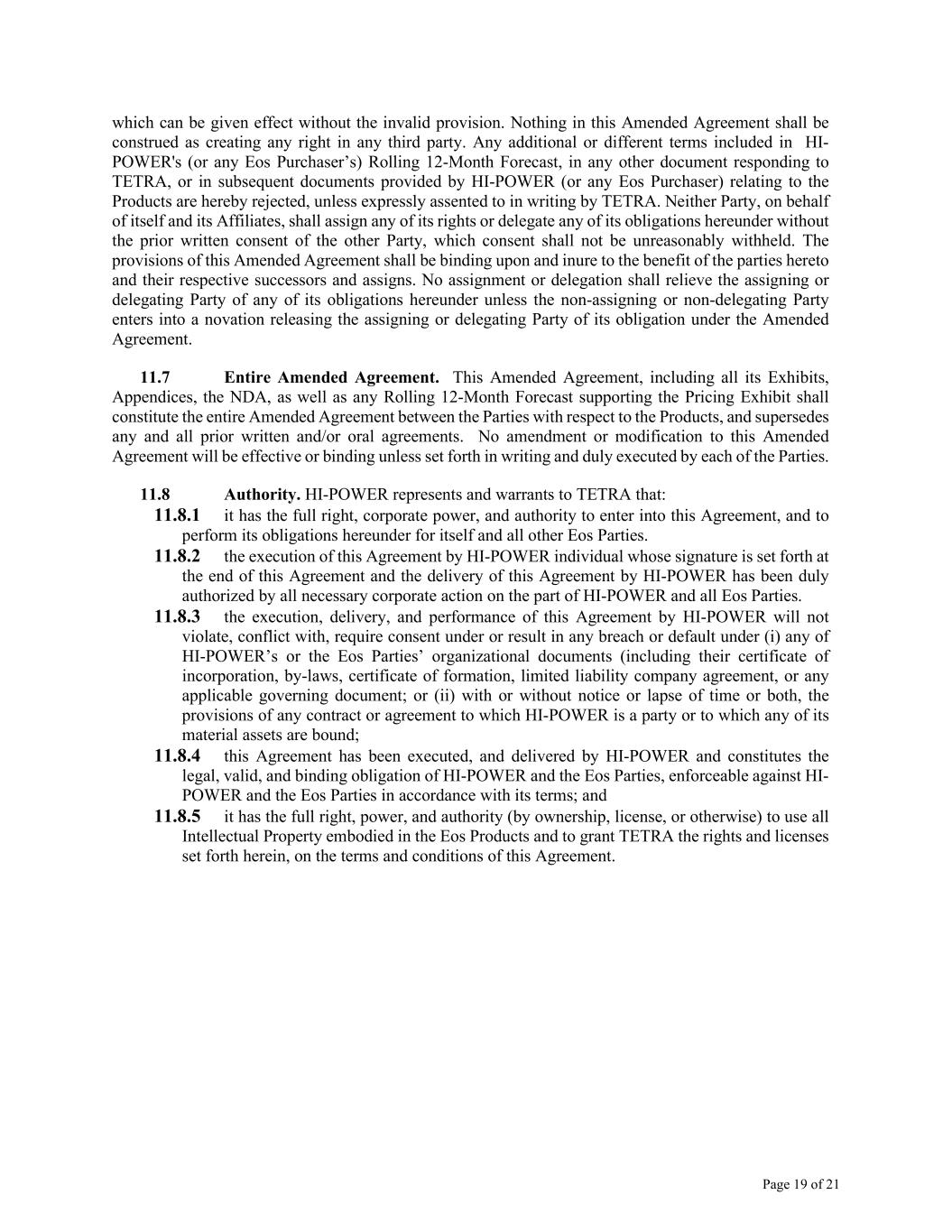 Page 19 of 21 which can be given effect without the invalid provision. Nothing in this Amended Agreement shall be construed as creating any right in any third party. Any additional or different terms included in HI- POWER's (or any Eos Purchaser’s) Rolling 12-Month Forecast, in any other document responding to TETRA, or in subsequent documents provided by HI-POWER (or any Eos Purchaser) relating to the Products are hereby rejected, unless expressly assented to in writing by TETRA. Neither Party, on behalf of itself and its Affiliates, shall assign any of its rights or delegate any of its obligations hereunder without the prior written consent of the other Party, which consent shall not be unreasonably withheld. The provisions of this Amended Agreement shall be binding upon and inure to the benefit of the parties hereto and their respective successors and assigns. No assignment or delegation shall relieve the assigning or delegating Party of any of its obligations hereunder unless the non-assigning or non-delegating Party enters into a novation releasing the assigning or delegating Party of its obligation under the Amended Agreement. 11.7 Entire Amended Agreement. This Amended Agreement, including all its Exhibits, Appendices, the NDA, as well as any Rolling 12-Month Forecast supporting the Pricing Exhibit shall constitute the entire Amended Agreement between the Parties with respect to the Products, and supersedes any and all prior written and/or oral agreements. No amendment or modification to this Amended Agreement will be effective or binding unless set forth in writing and duly executed by each of the Parties. 11.8 Authority. HI-POWER represents and warrants to TETRA that: 11.8.1 it has the full right, corporate power, and authority to enter into this Agreement, and to perform its obligations hereunder for itself and all other Eos Parties. 11.8.2 the execution of this Agreement by HI-POWER individual whose signature is set forth at the end of this Agreement and the delivery of this Agreement by HI-POWER has been duly authorized by all necessary corporate action on the part of HI-POWER and all Eos Parties. 11.8.3 the execution, delivery, and performance of this Agreement by HI-POWER will not violate, conflict with, require consent under or result in any breach or default under (i) any of HI-POWER’s or the Eos Parties’ organizational documents (including their certificate of incorporation, by-laws, certificate of formation, limited liability company agreement, or any applicable governing document; or (ii) with or without notice or lapse of time or both, the provisions of any contract or agreement to which HI-POWER is a party or to which any of its material assets are bound; 11.8.4 this Agreement has been executed, and delivered by HI-POWER and constitutes the legal, valid, and binding obligation of HI-POWER and the Eos Parties, enforceable against HI- POWER and the Eos Parties in accordance with its terms; and 11.8.5 it has the full right, power, and authority (by ownership, license, or otherwise) to use all Intellectual Property embodied in the Eos Products and to grant TETRA the rights and licenses set forth herein, on the terms and conditions of this Agreement.