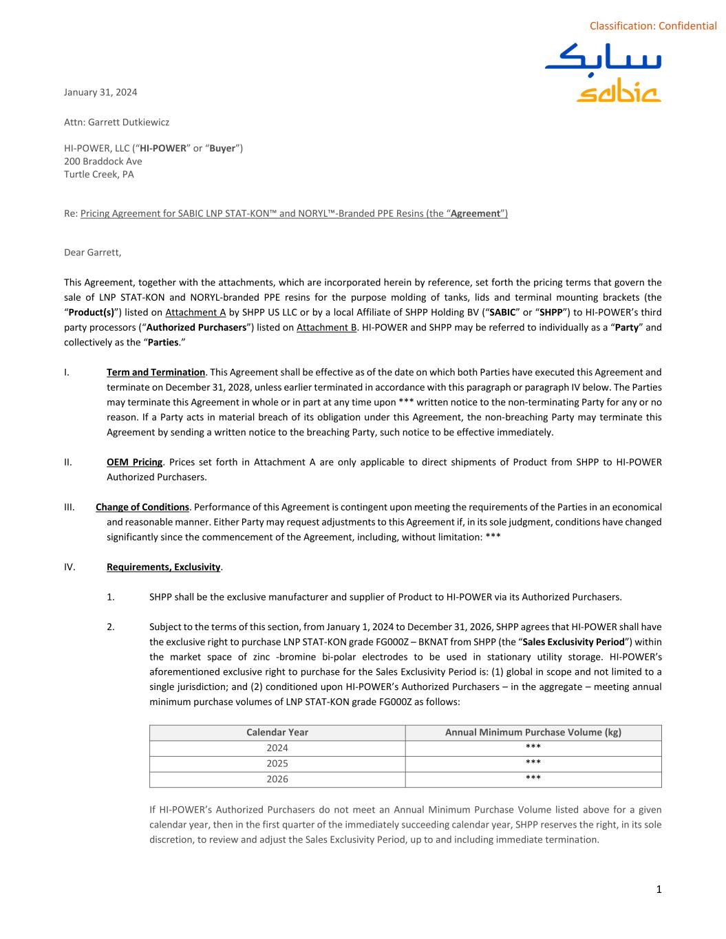 1 Classification: Confidential January 31, 2024 Attn: Garrett Dutkiewicz HI-POWER, LLC (“HI-POWER” or “Buyer”) 200 Braddock Ave Turtle Creek, PA Re: Pricing Agreement for SABIC LNP STAT-KON™ and NORYL™-Branded PPE Resins (the “Agreement”) Dear Garrett, This Agreement, together with the attachments, which are incorporated herein by reference, set forth the pricing terms that govern the sale of LNP STAT-KON and NORYL-branded PPE resins for the purpose molding of tanks, lids and terminal mounting brackets (the “Product(s)”) listed on Attachment A by SHPP US LLC or by a local Affiliate of SHPP Holding BV (“SABIC” or “SHPP”) to HI-POWER’s third party processors (“Authorized Purchasers”) listed on Attachment B. HI-POWER and SHPP may be referred to individually as a “Party” and collectively as the “Parties.” I. Term and Termination. This Agreement shall be effective as of the date on which both Parties have executed this Agreement and terminate on December 31, 2028, unless earlier terminated in accordance with this paragraph or paragraph IV below. The Parties may terminate this Agreement in whole or in part at any time upon *** written notice to the non-terminating Party for any or no reason. If a Party acts in material breach of its obligation under this Agreement, the non-breaching Party may terminate this Agreement by sending a written notice to the breaching Party, such notice to be effective immediately. II. OEM Pricing. Prices set forth in Attachment A are only applicable to direct shipments of Product from SHPP to HI-POWER Authorized Purchasers. III. Change of Conditions. Performance of this Agreement is contingent upon meeting the requirements of the Parties in an economical and reasonable manner. Either Party may request adjustments to this Agreement if, in its sole judgment, conditions have changed significantly since the commencement of the Agreement, including, without limitation: *** IV. Requirements, Exclusivity. 1. SHPP shall be the exclusive manufacturer and supplier of Product to HI-POWER via its Authorized Purchasers. 2. Subject to the terms of this section, from January 1, 2024 to December 31, 2026, SHPP agrees that HI-POWER shall have the exclusive right to purchase LNP STAT-KON grade FG000Z – BKNAT from SHPP (the “Sales Exclusivity Period”) within the market space of zinc -bromine bi-polar electrodes to be used in stationary utility storage. HI-POWER’s aforementioned exclusive right to purchase for the Sales Exclusivity Period is: (1) global in scope and not limited to a single jurisdiction; and (2) conditioned upon HI-POWER’s Authorized Purchasers – in the aggregate – meeting annual minimum purchase volumes of LNP STAT-KON grade FG000Z as follows: Calendar Year Annual Minimum Purchase Volume (kg) 2024 *** 2025 *** 2026 *** If HI-POWER’s Authorized Purchasers do not meet an Annual Minimum Purchase Volume listed above for a given calendar year, then in the first quarter of the immediately succeeding calendar year, SHPP reserves the right, in its sole discretion, to review and adjust the Sales Exclusivity Period, up to and including immediate termination.